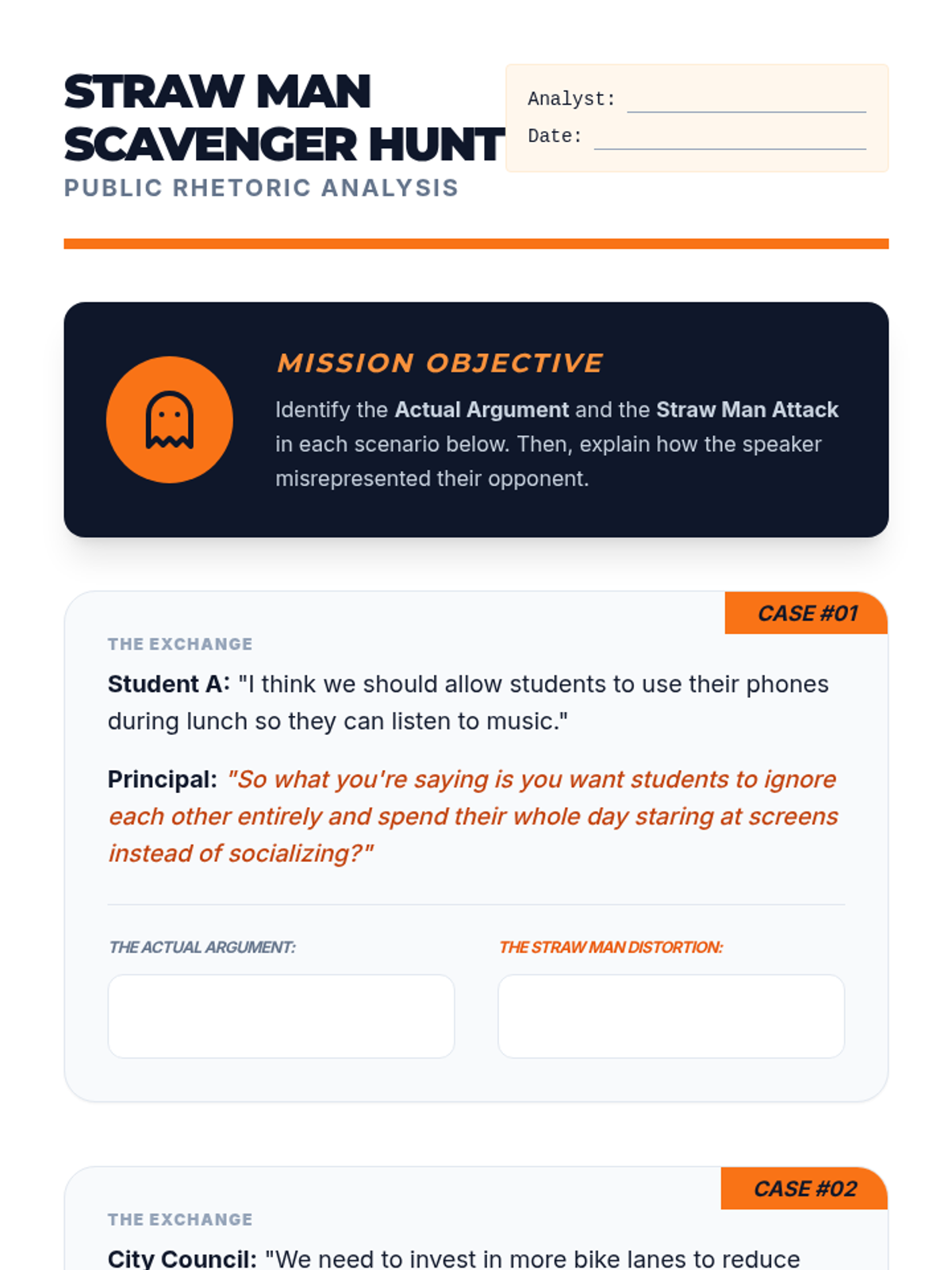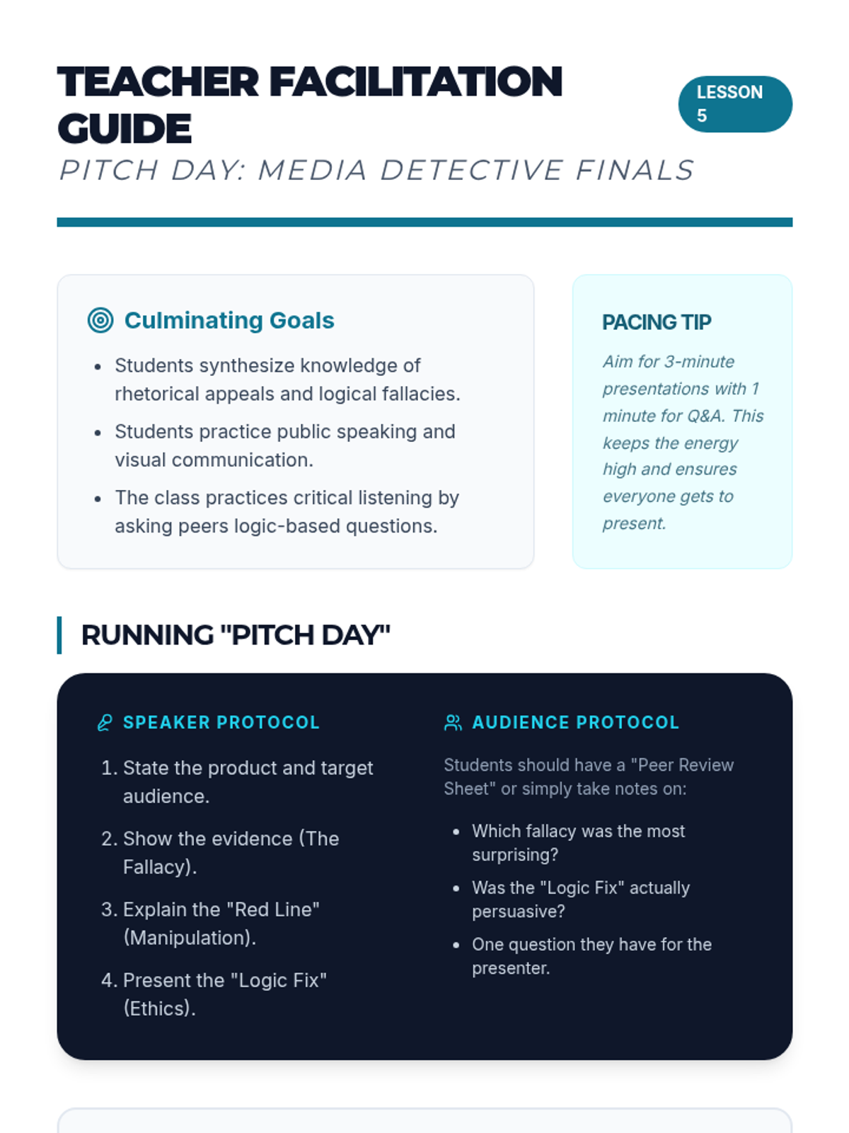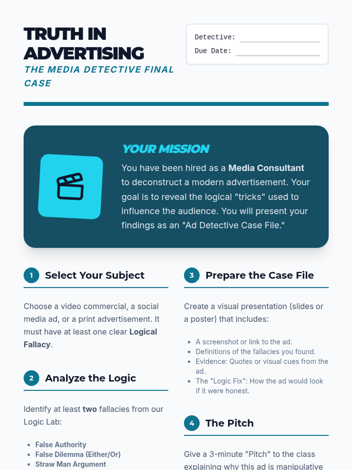 A middle school ELA sequence focused on identifying and deconstructing logical fallacies in modern media, culminating in a critical analysis project. Students learn to distinguish between ethical persuasion and manipulative tactics like False Authority, False Dilemmas, and Straw Man arguments.