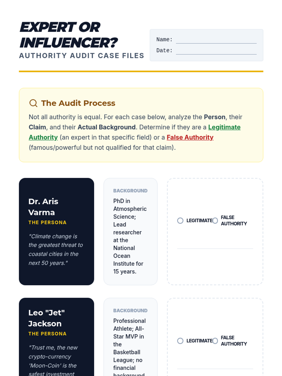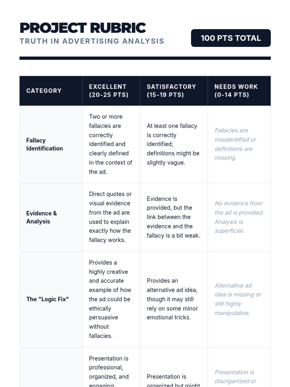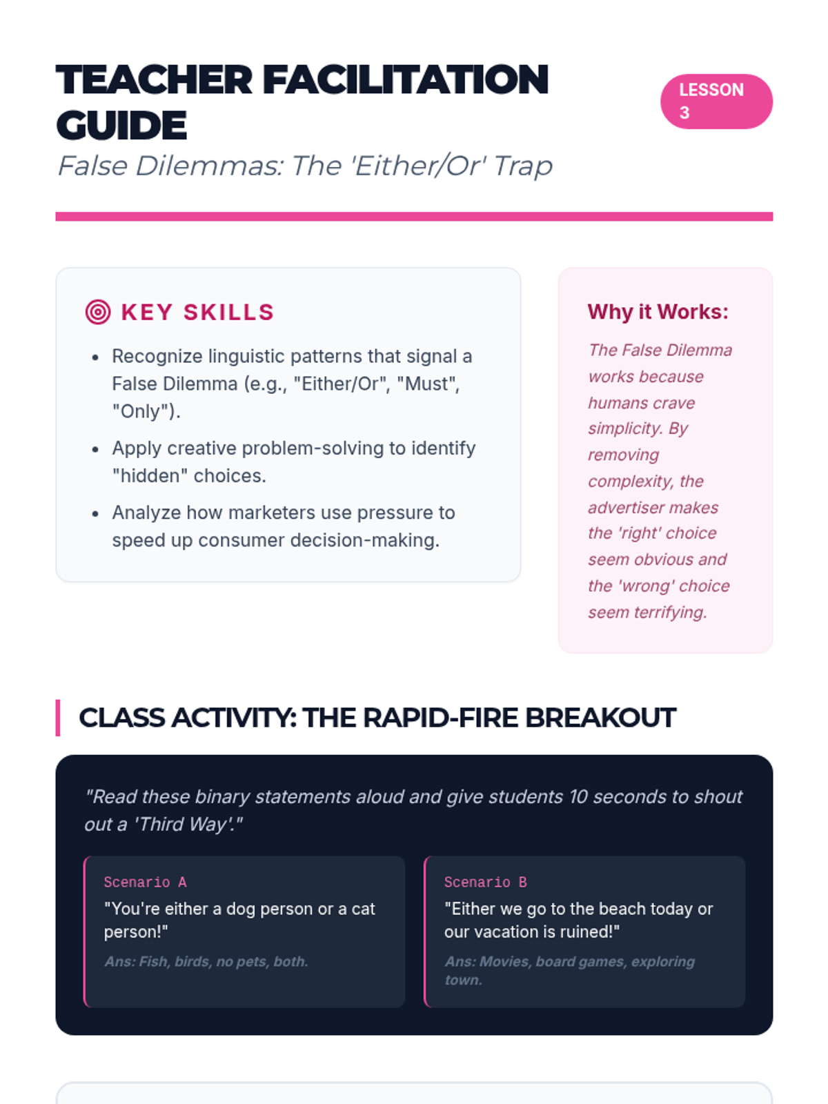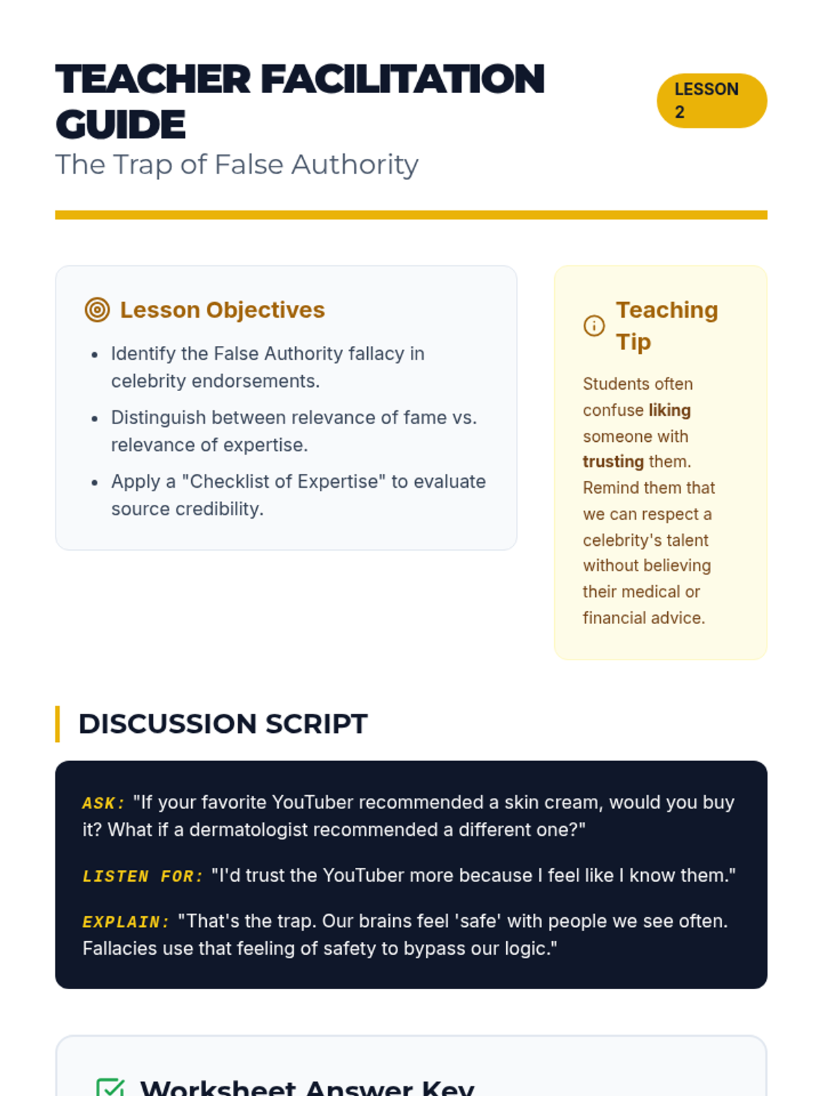 A middle school ELA sequence focused on identifying and deconstructing logical fallacies in modern media, culminating in a critical analysis project. Students learn to distinguish between ethical persuasion and manipulative tactics like False Authority, False Dilemmas, and Straw Man arguments.