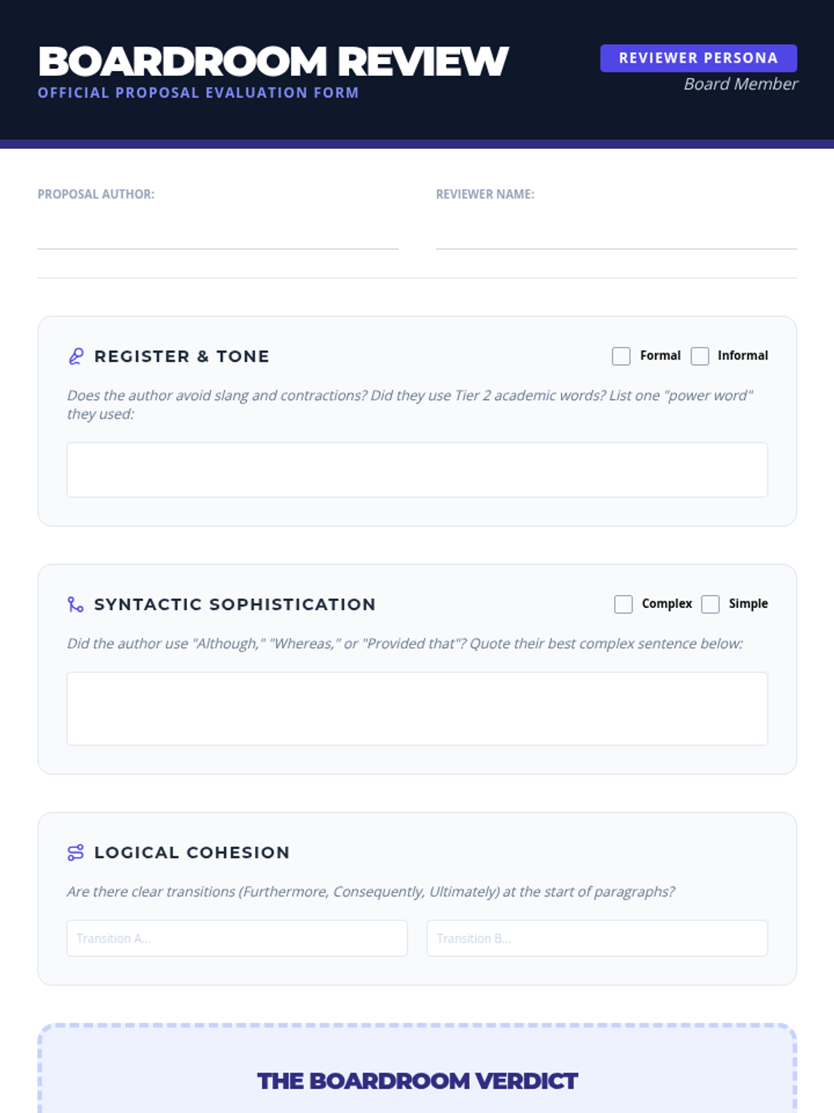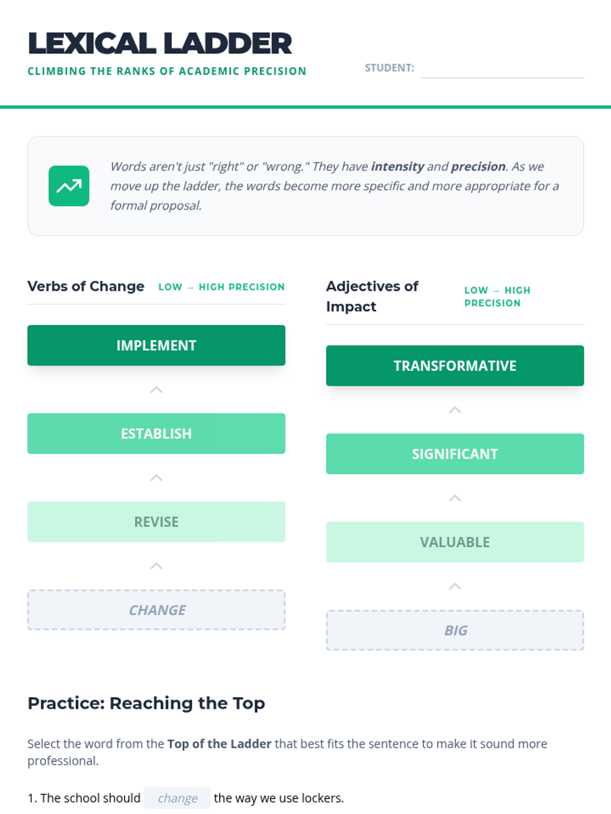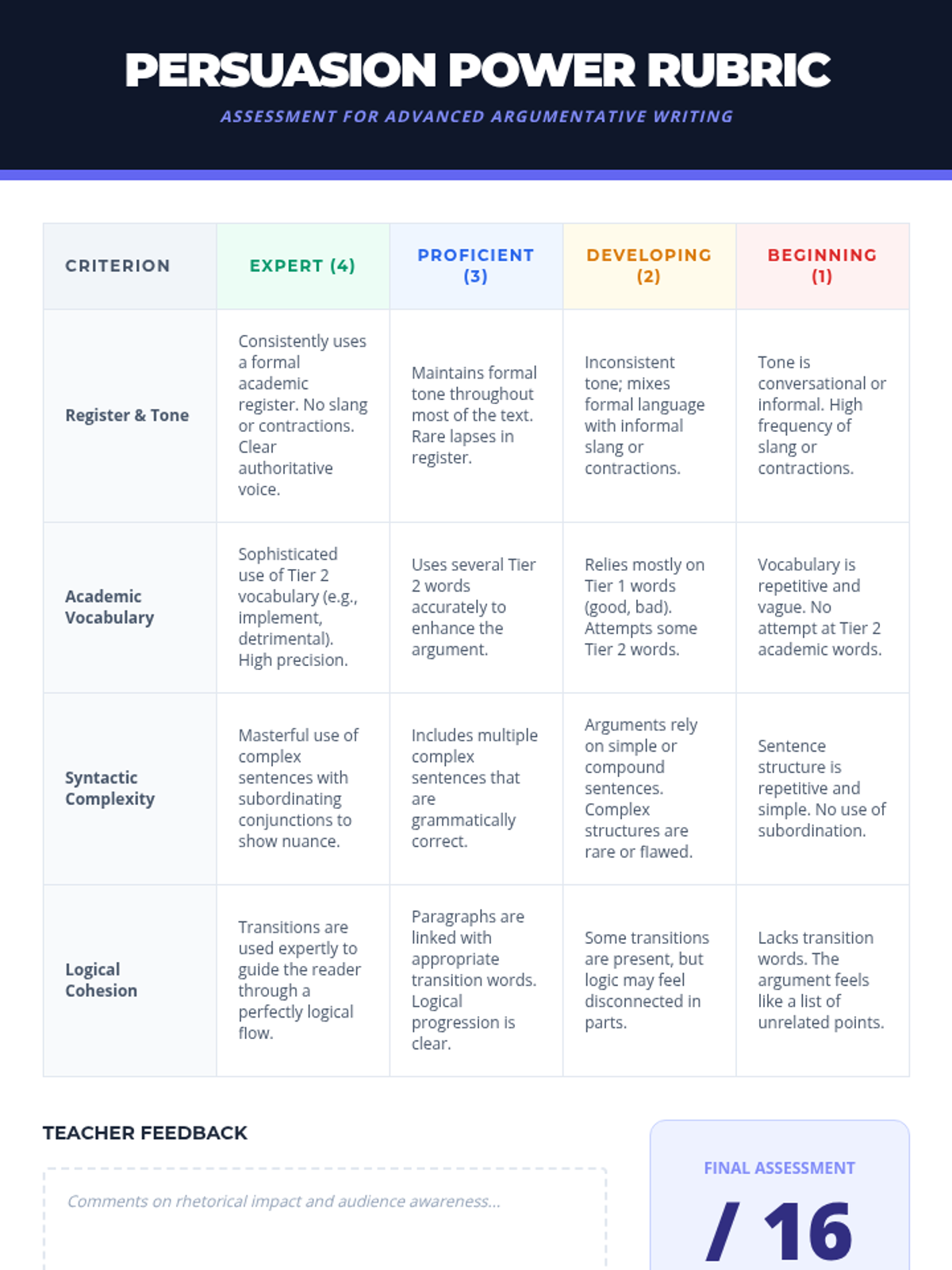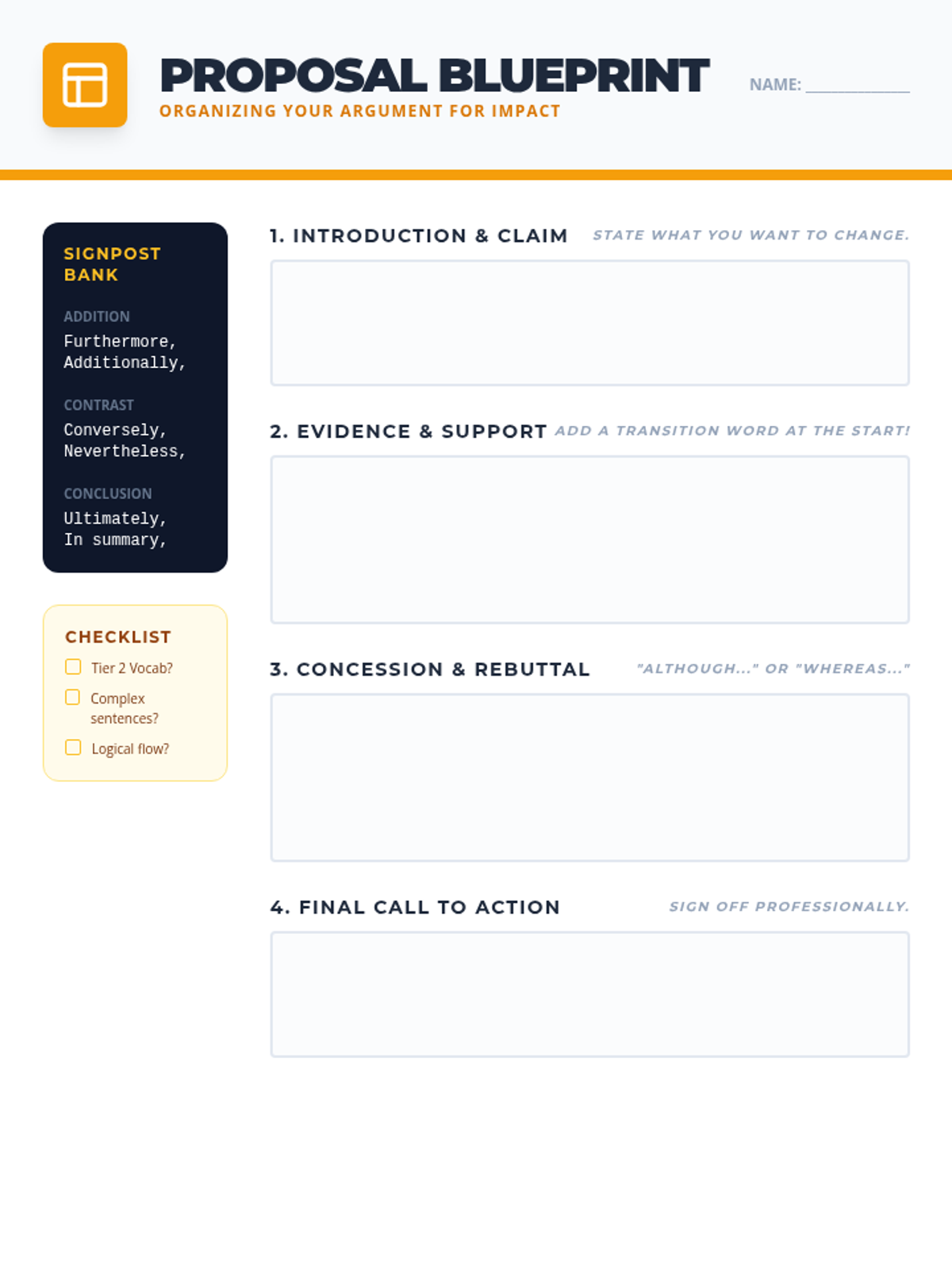 This sequence guides advanced ESL students through the process of constructing formal argumentative essays. Students learn to deconstruct mentor texts, master complex sentence structures, use precise academic vocabulary, and organize ideas with transitional phrases to create a persuasive proposal for school policy changes.