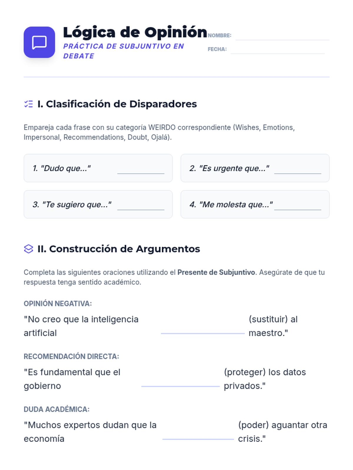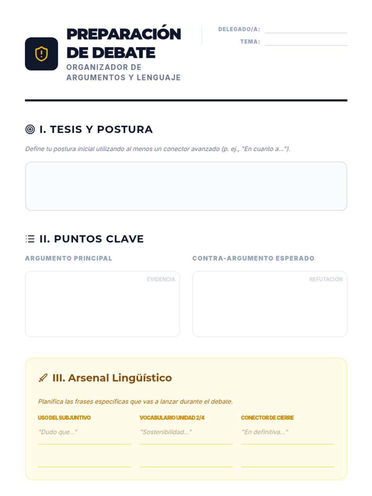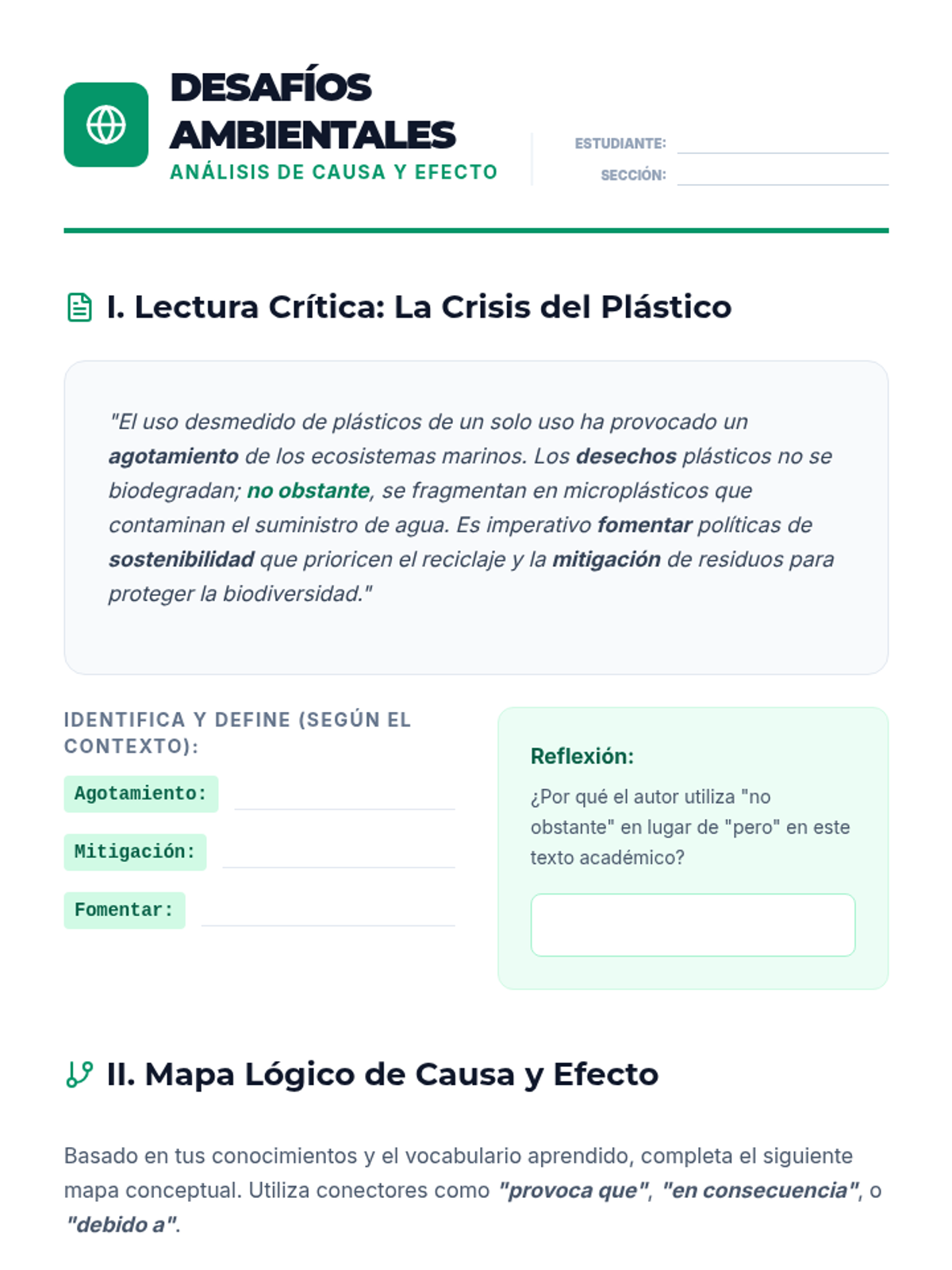 This sequence equips undergraduate intermediate Spanish students with advanced transition words, specialized environmental and technological vocabulary, and the subjunctive structures necessary for persuasive academic debate. Students progress from sentence-level cohesion to participating in a formal debate on complex global issues.