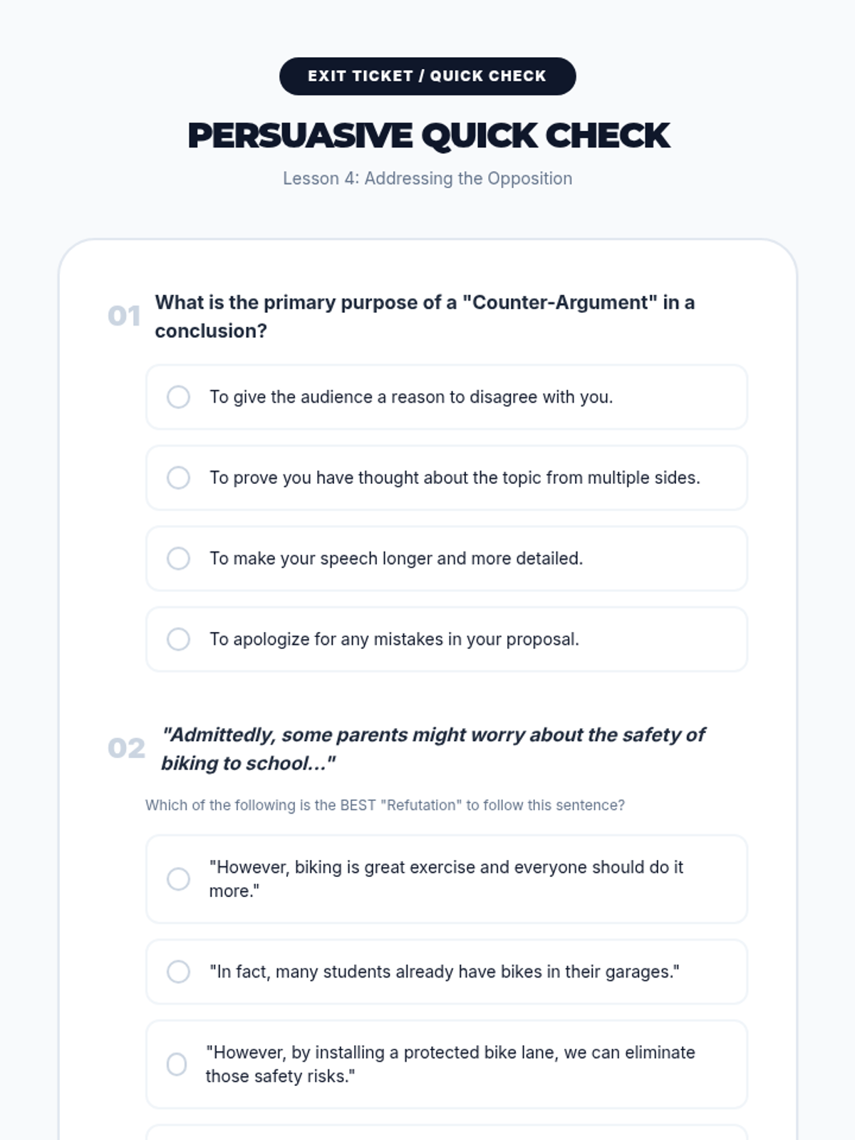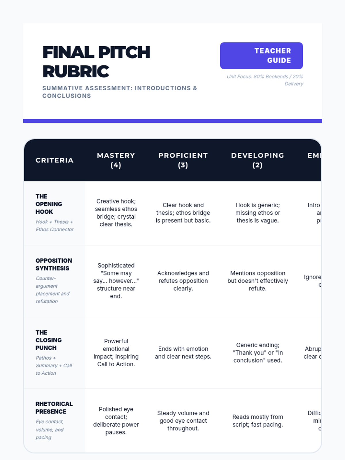 A project-based writing sequence focused on crafting powerful introductions and conclusions using rhetorical strategies like ethos, pathos, and counter-arguments. Students move from 30-second elevator pitches to full persuasive presentations, learning how to 'hook' an audience and leave a lasting emotional impact.
