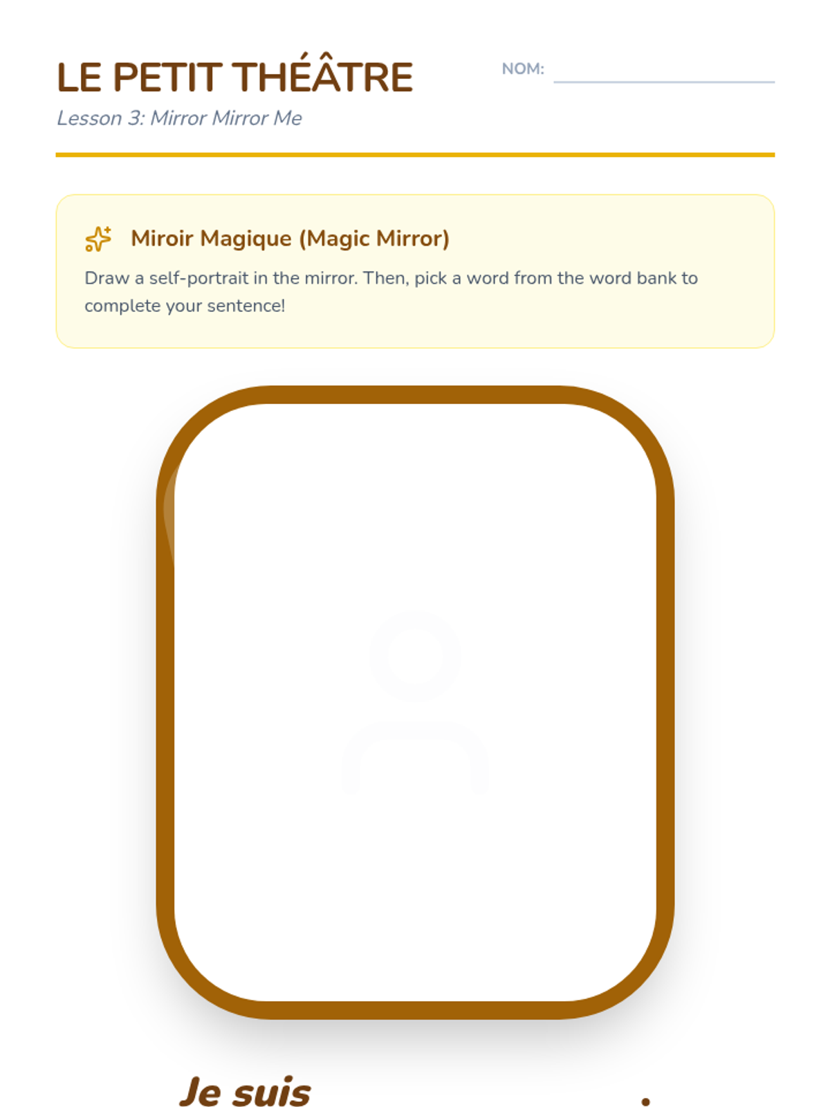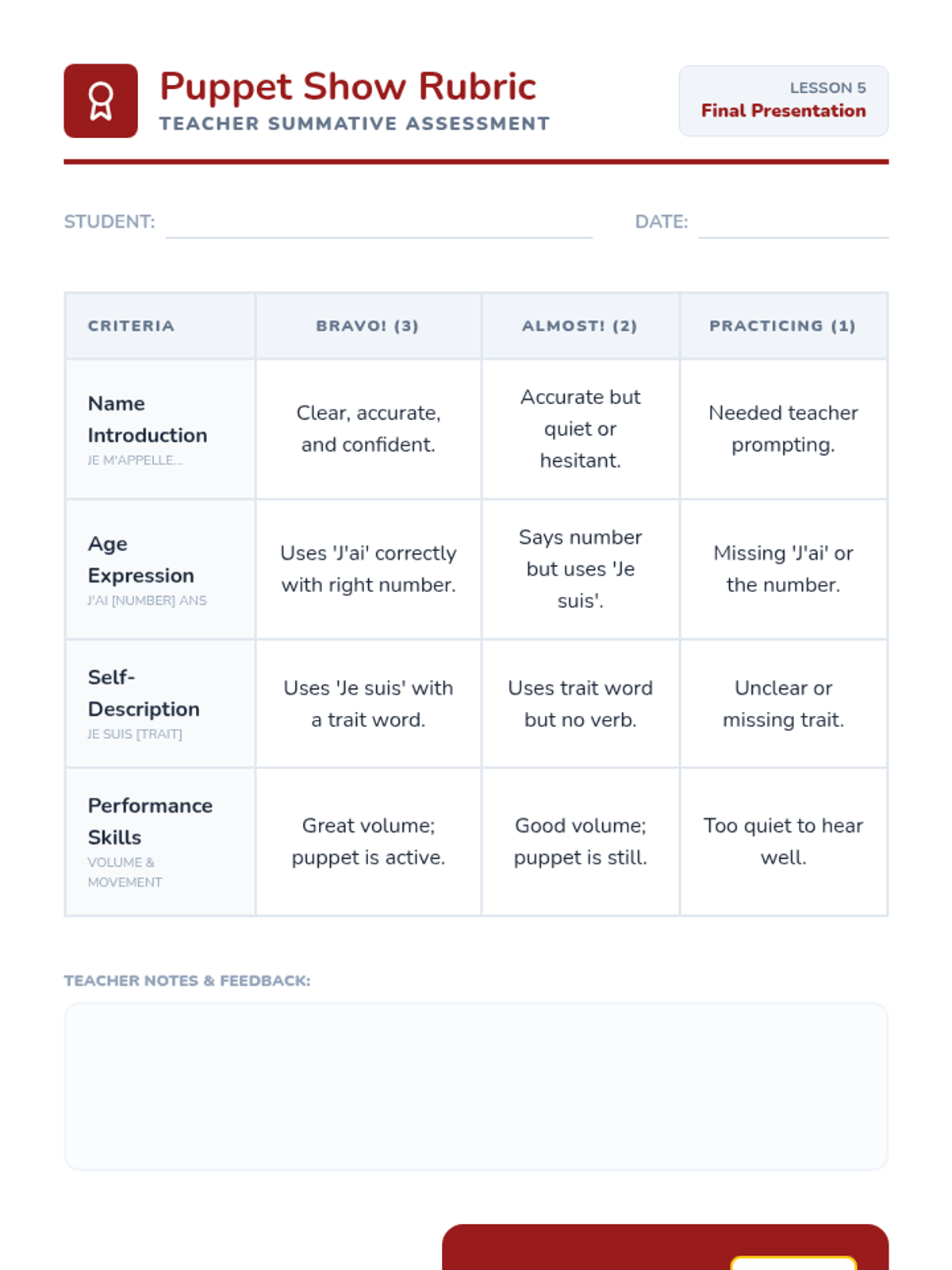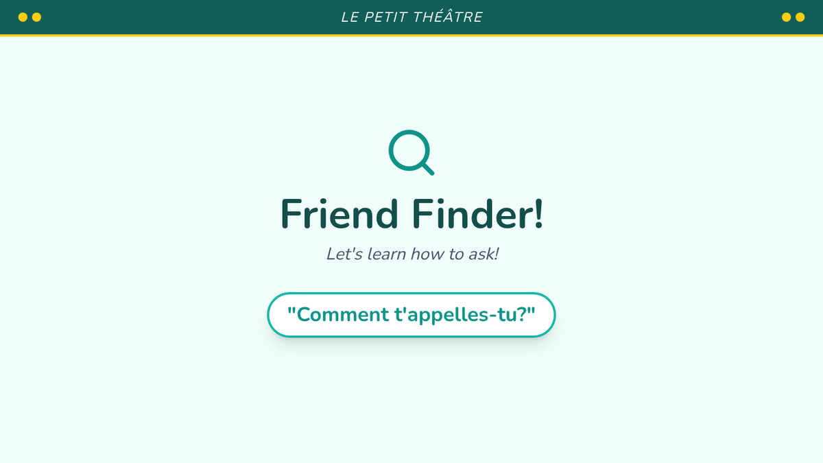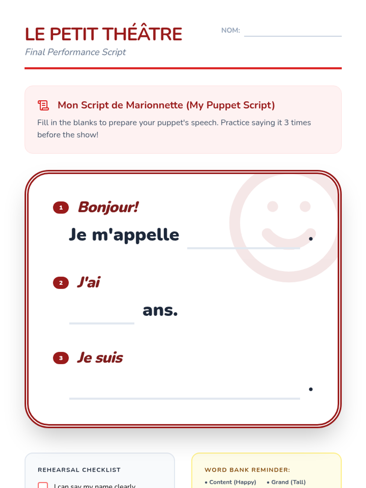 A charming French introductory sequence for 2nd graders using a 'Petit Théâtre' (Little Theater) theme. Students learn to share their name, age, and feelings through interactive games and a final puppet presentation.