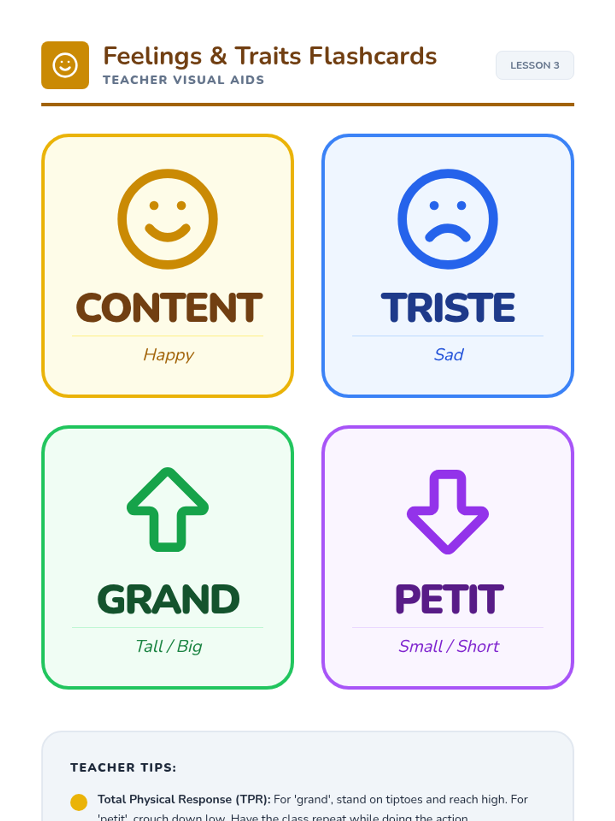 A game-based Spanish sequence for 2nd graders focused on expressing emotions (happy, sad, angry) and physical needs (hunger, thirst, bathroom) using TPR and interactive play.