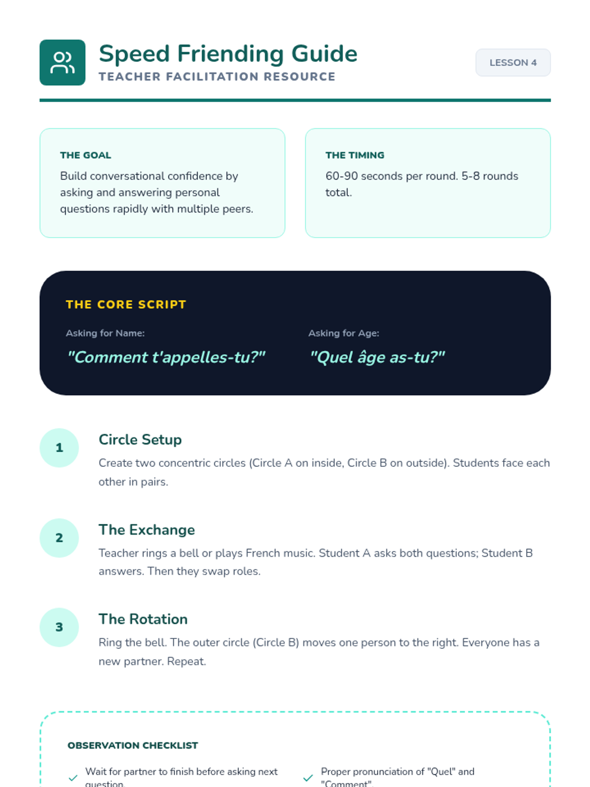 Students explore French culture through politeness and classroom navigation. They learn 'magic words', object names, and teacher commands through TPR and role-play to function effectively in a French-speaking environment.