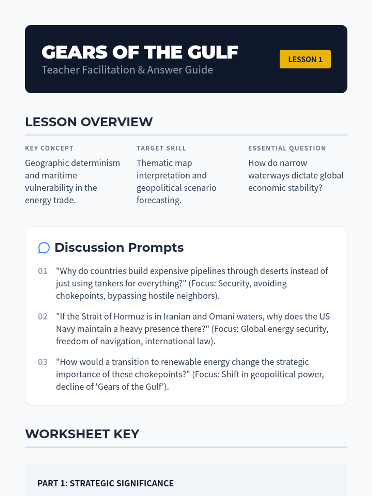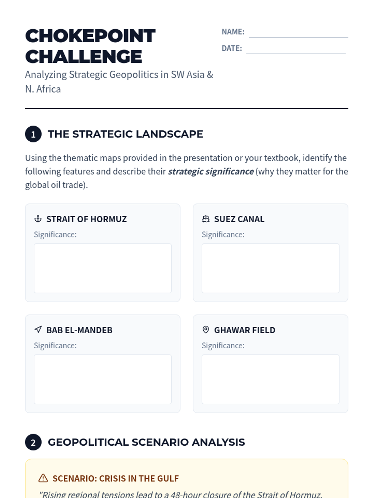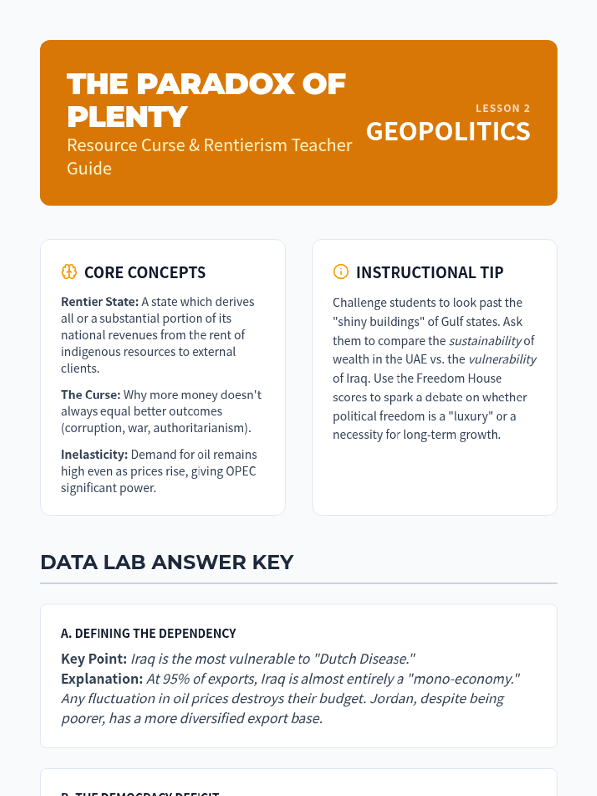 This 11th-grade geography sequence explores the impact of petroleum on the Middle East, covering geographic distribution, the 'Resource Curse' theory, OPEC's role in global markets, labor migration trends, and future economic diversification strategies like Saudi Vision 2030.
