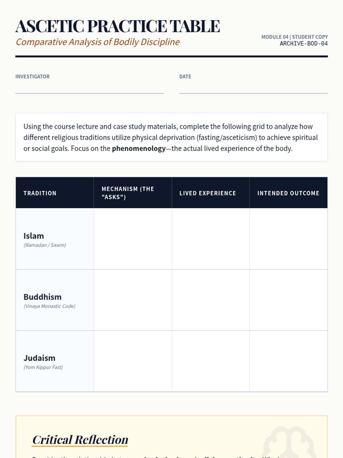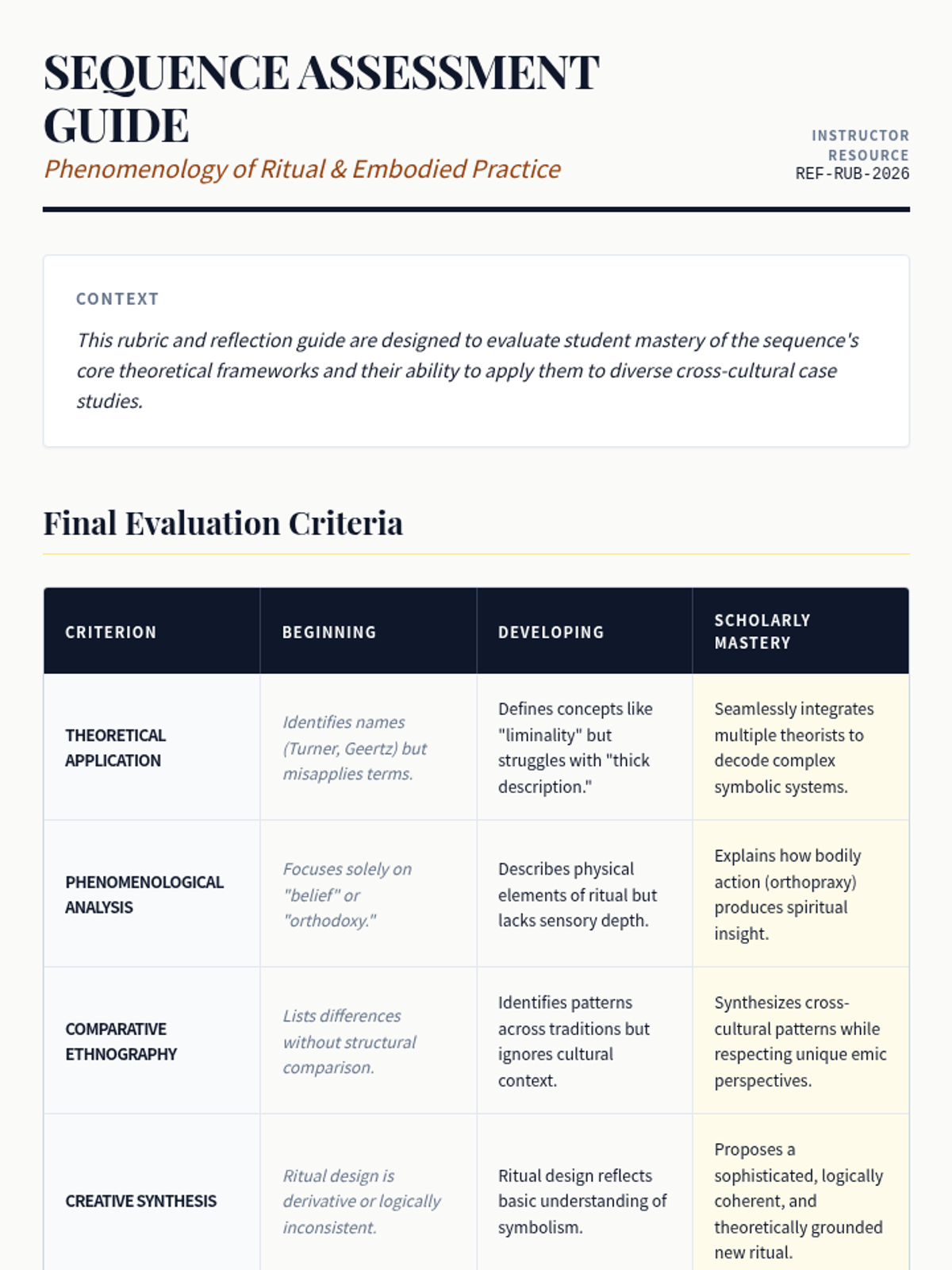 An undergraduate-level exploration of world religions through the lens of phenomenology, ritual studies, and embodied practice. Students analyze how rituals across cultures construct identity, community, and sacred space.