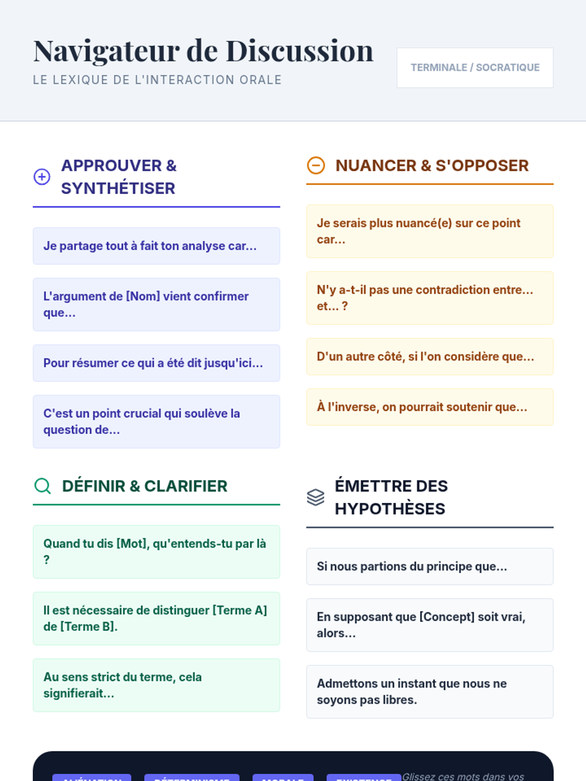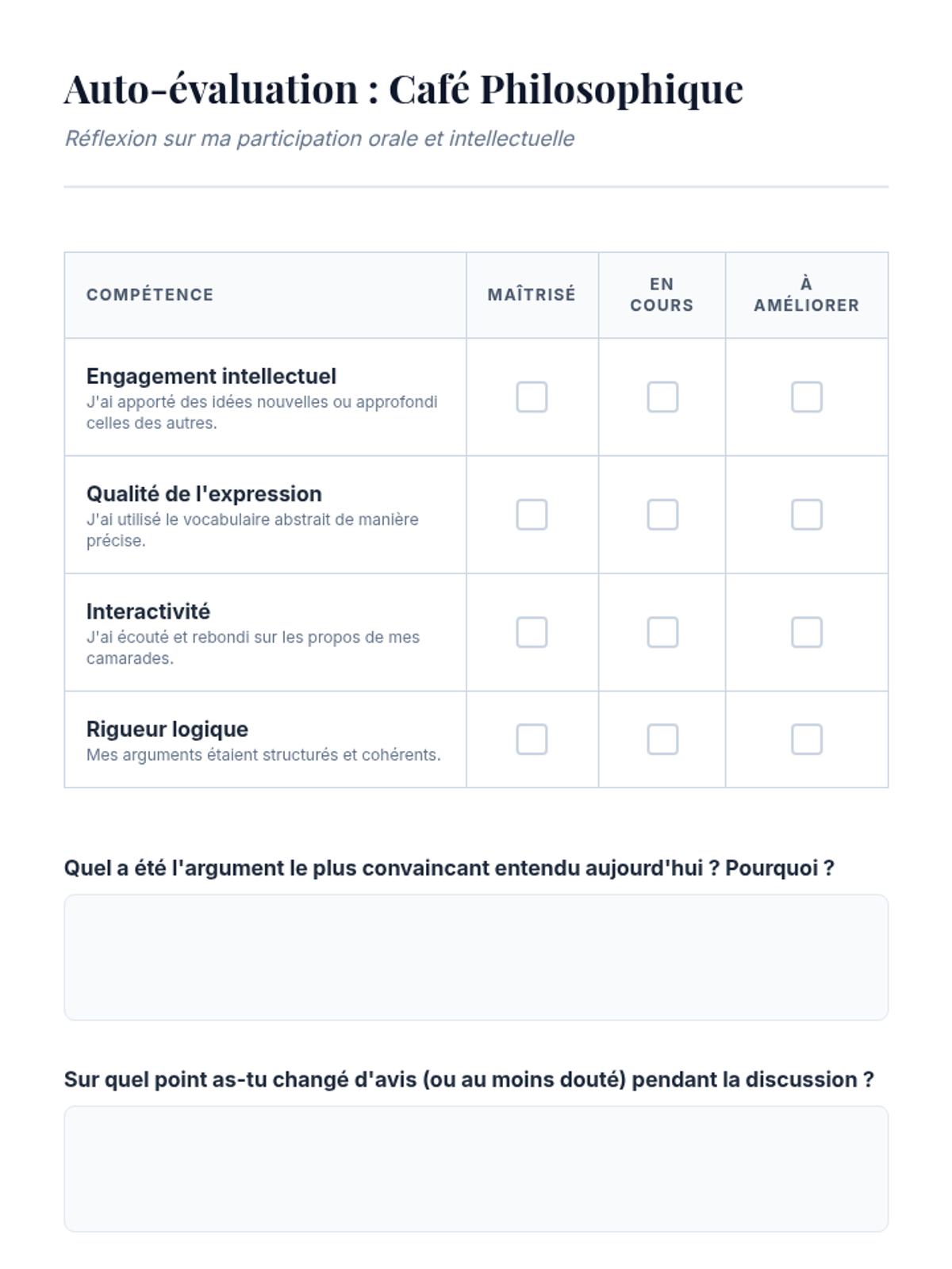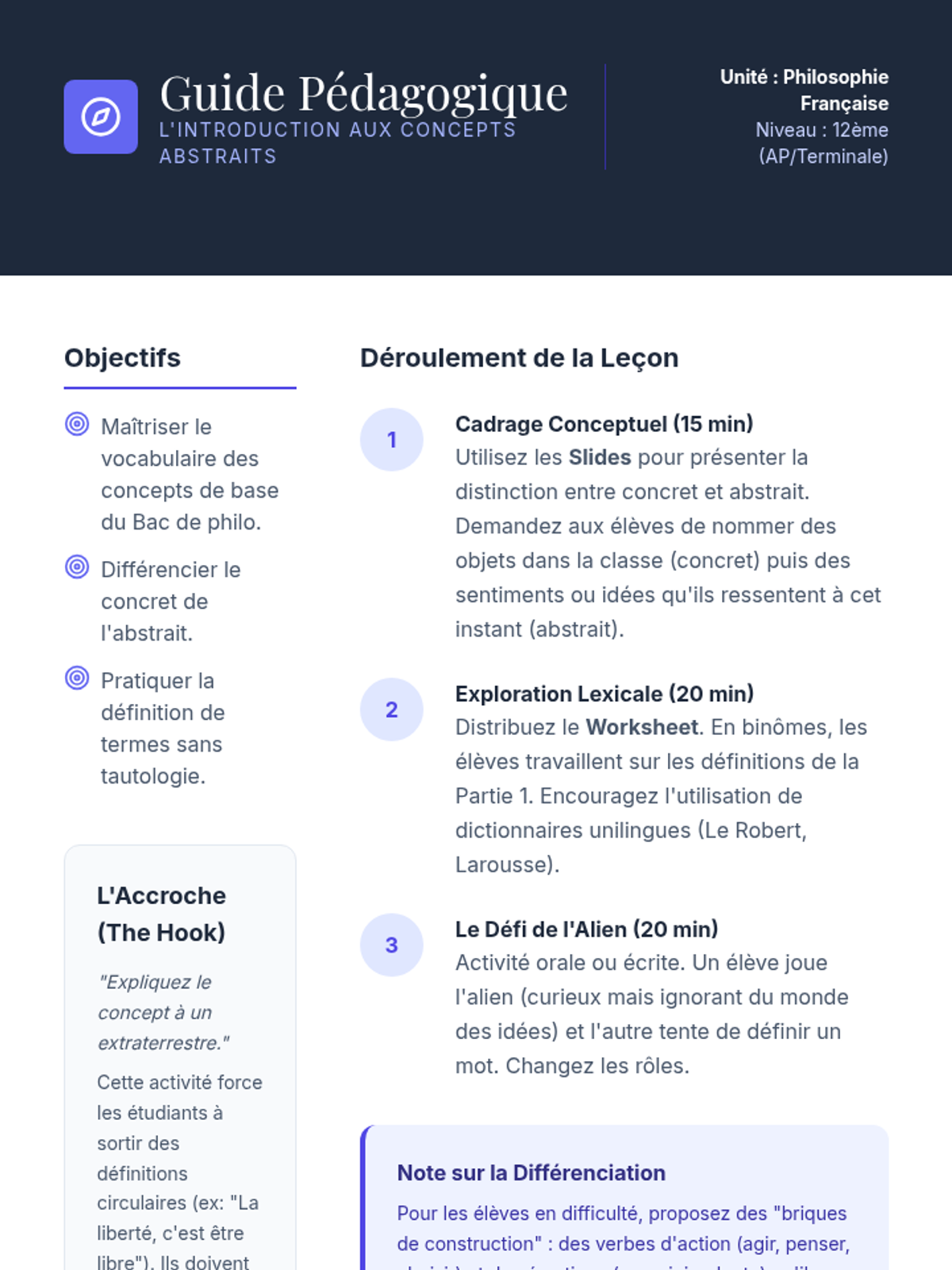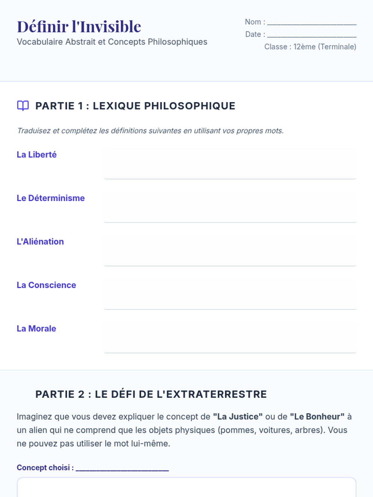 A high-level French language sequence for 12th-grade students focusing on abstract vocabulary and philosophical discourse, culminating in a structured Socratic seminar and formal reflection.