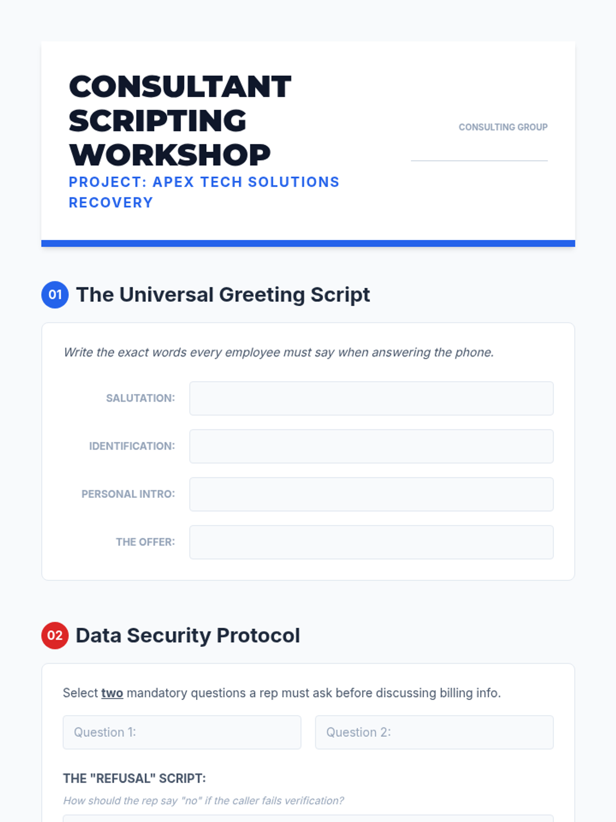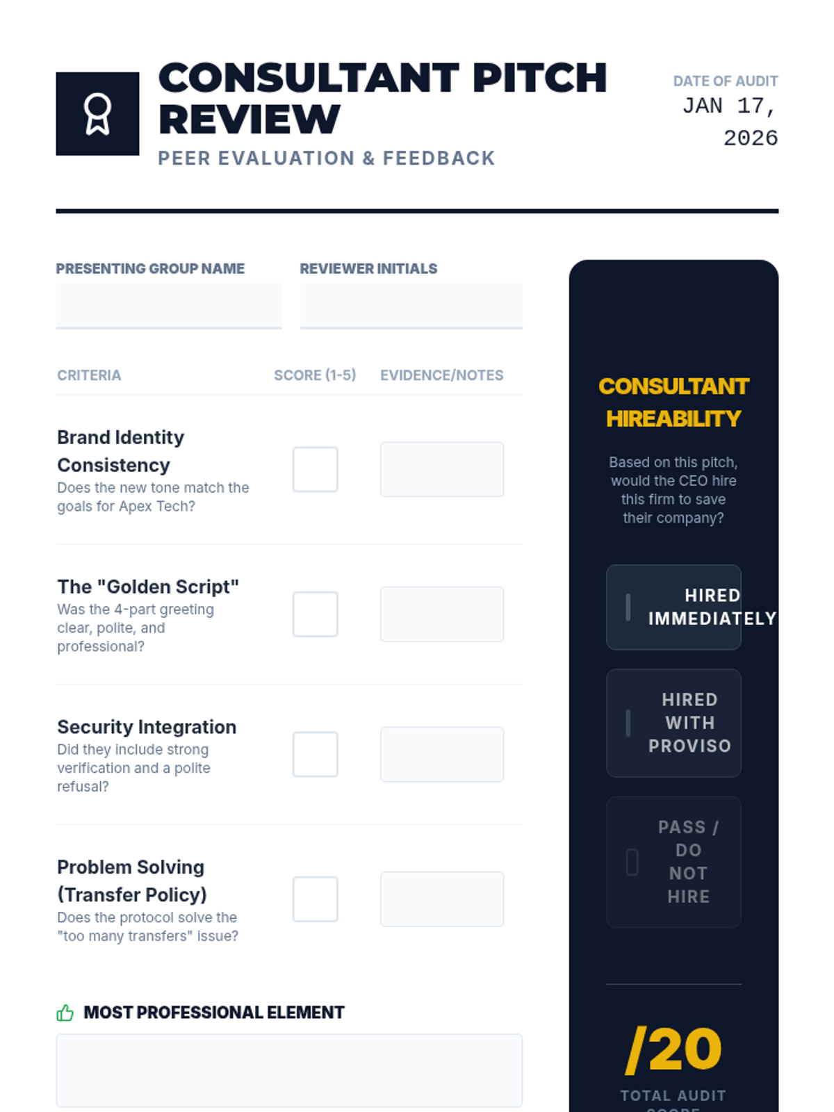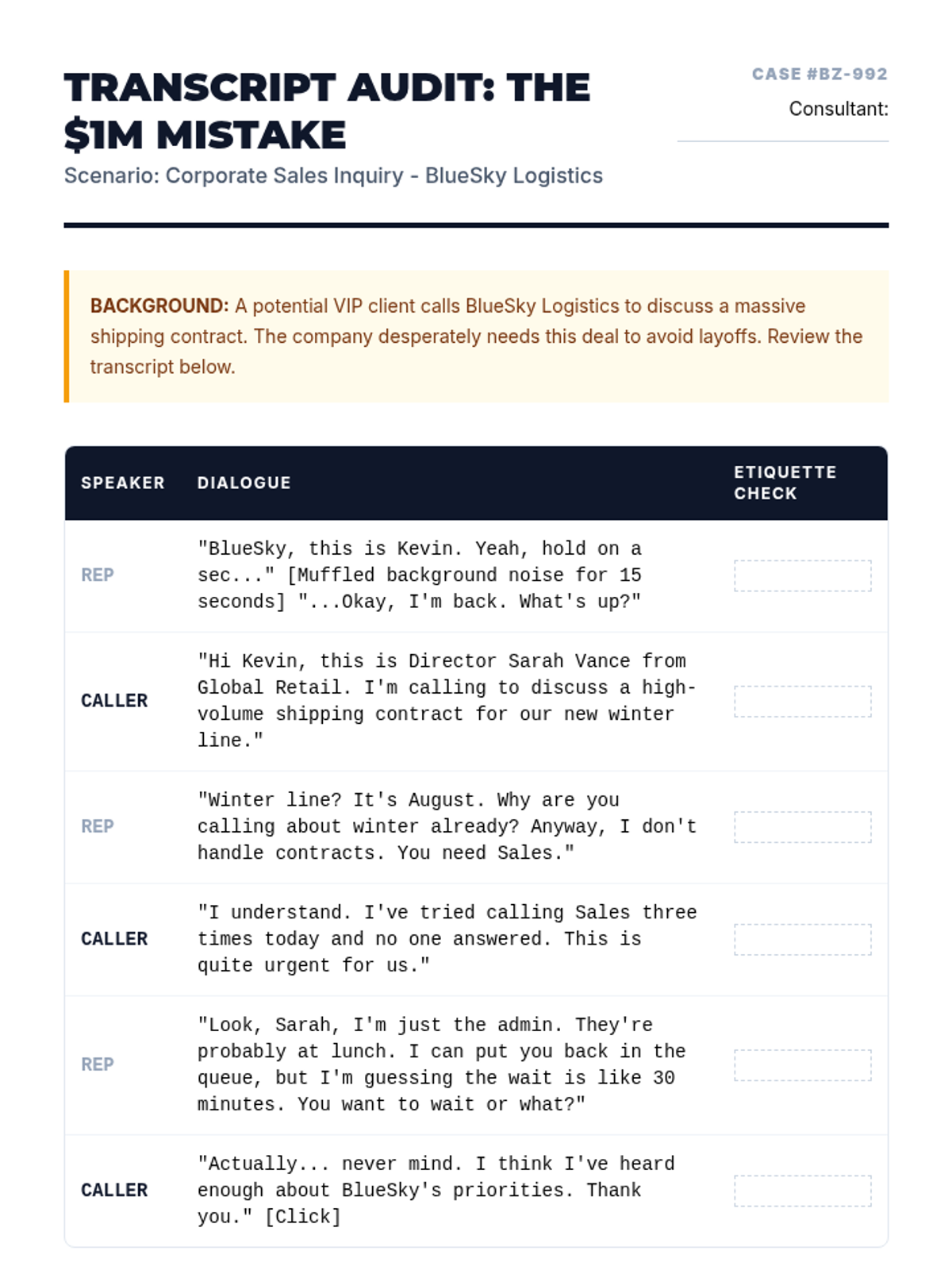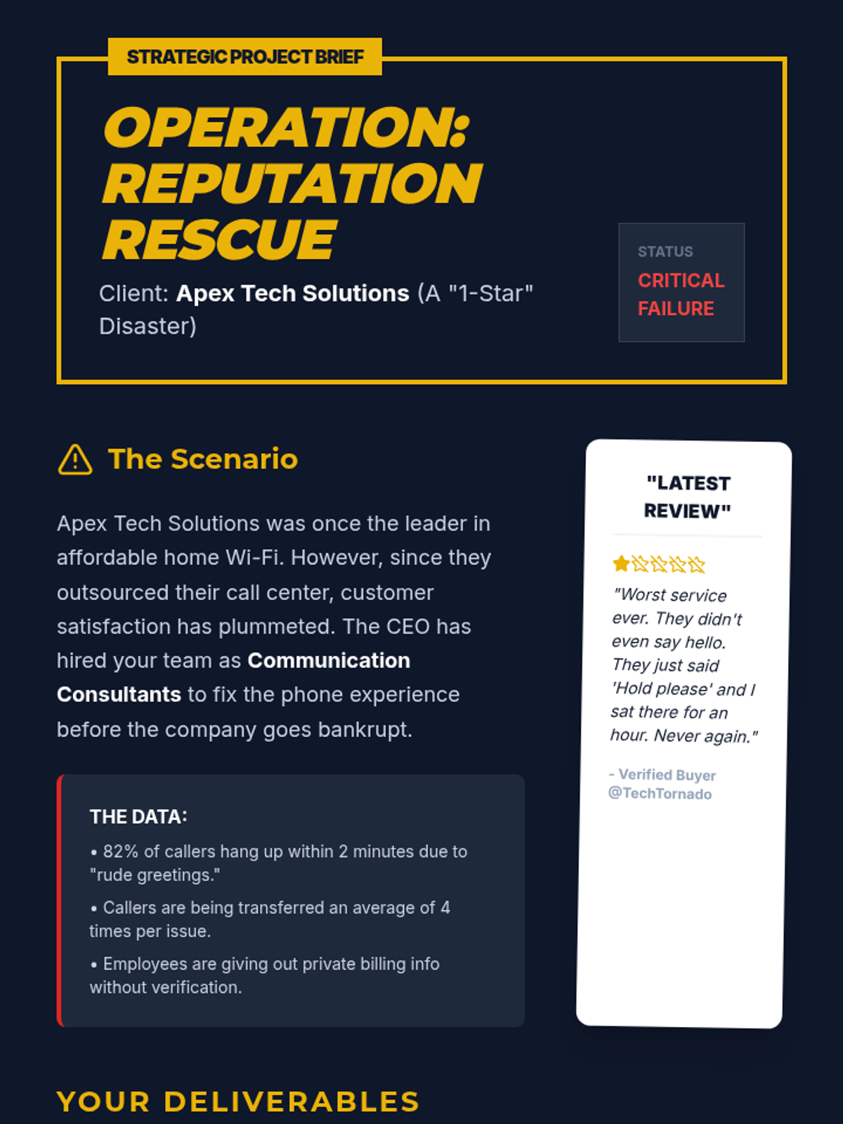 A case-study driven sequence where students act as communication consultants to evaluate and improve business phone protocols, focusing on brand identity, privacy, and etiquette.