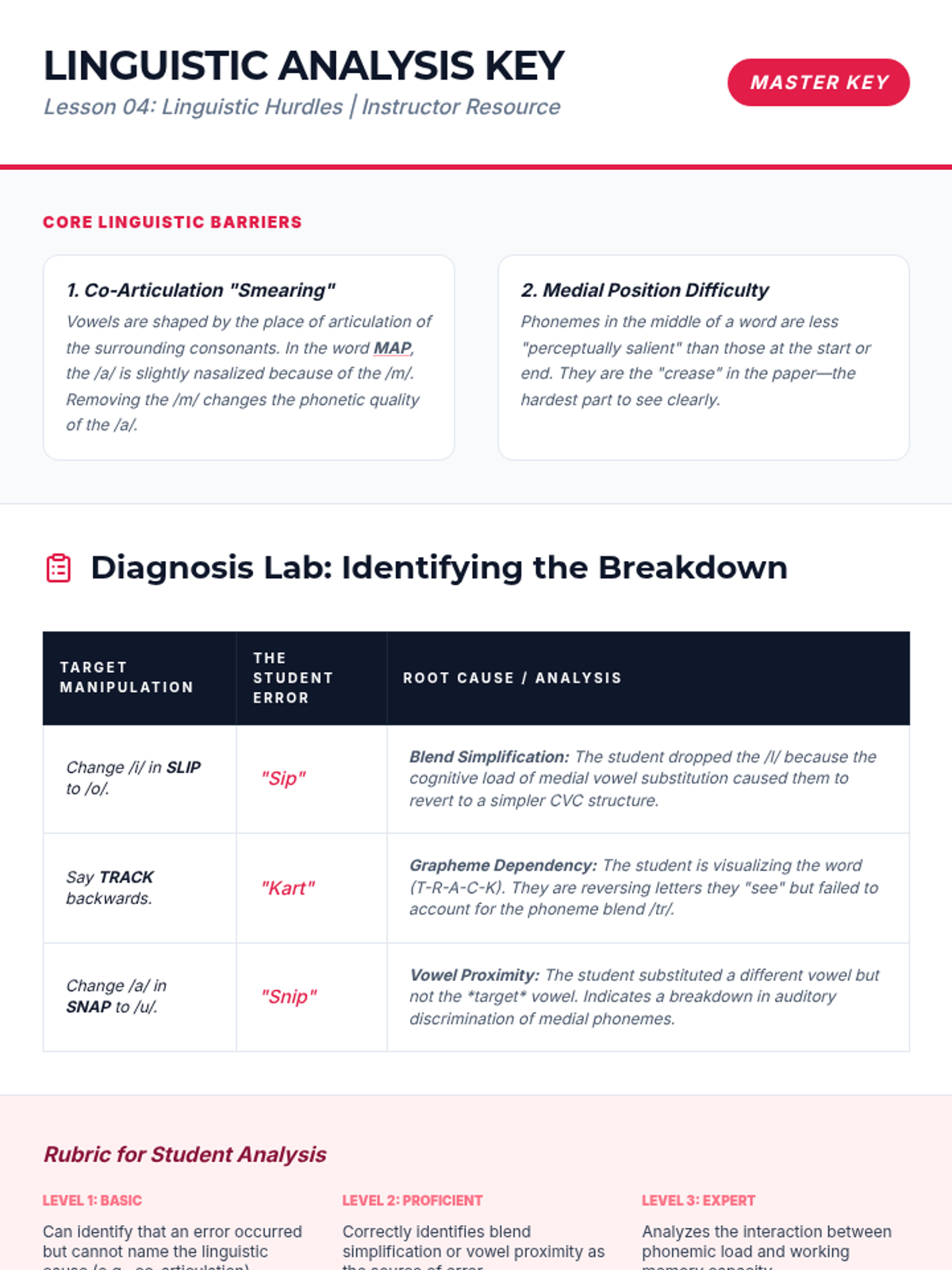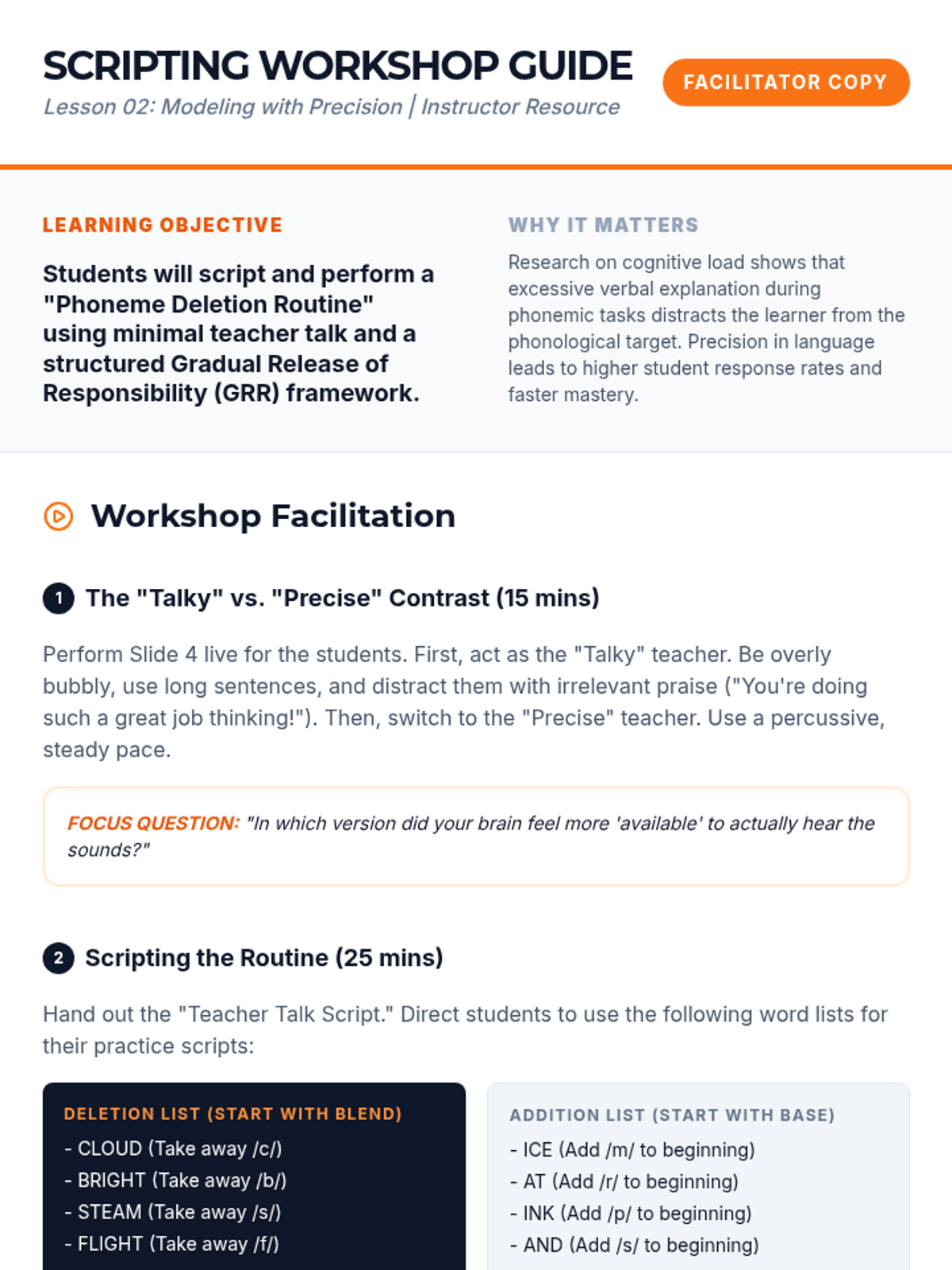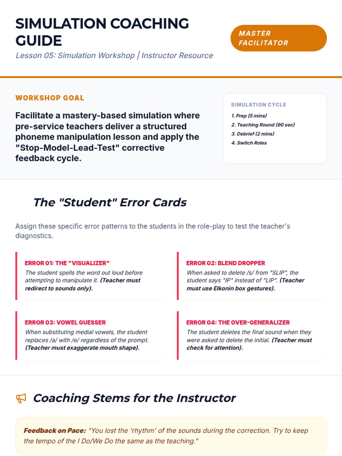 A comprehensive sequence for pre-service teachers on the pedagogical strategies for teaching phoneme manipulation. The course covers developmental hierarchies, explicit modeling (I Do, We Do, You Do), the use of manipulatives, advanced linguistic challenges, and peer-teaching simulations.