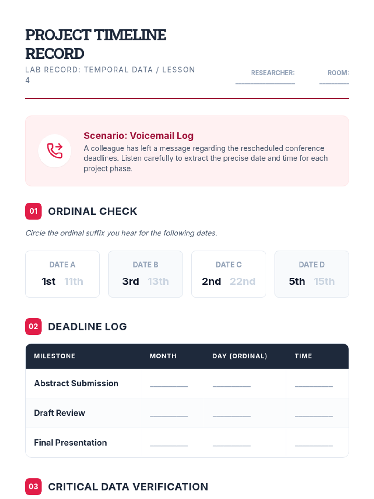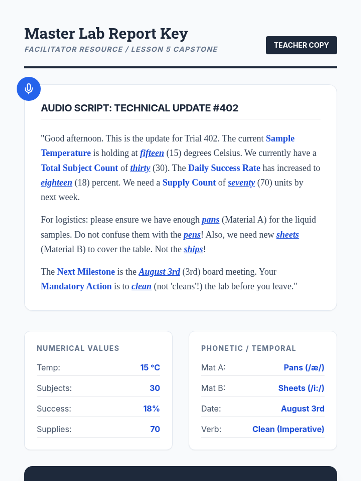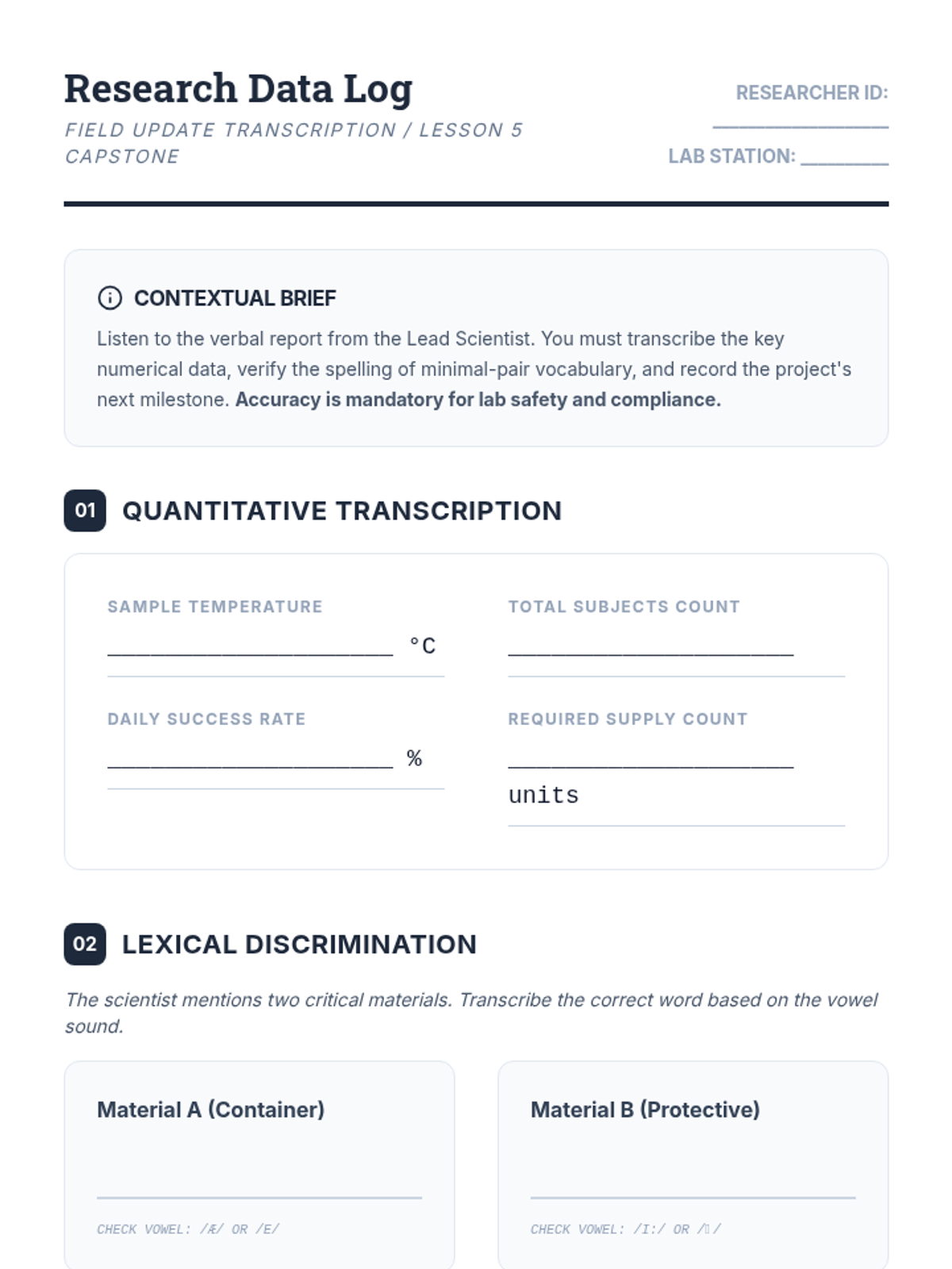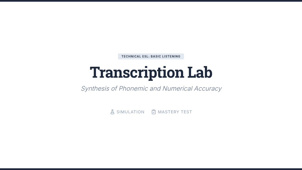 A technical ESL sequence for graduate students focusing on phonemic awareness and precise quantitative data capture. The course bridges the gap between basic listening skills and the accuracy required for academic research and professional communication.