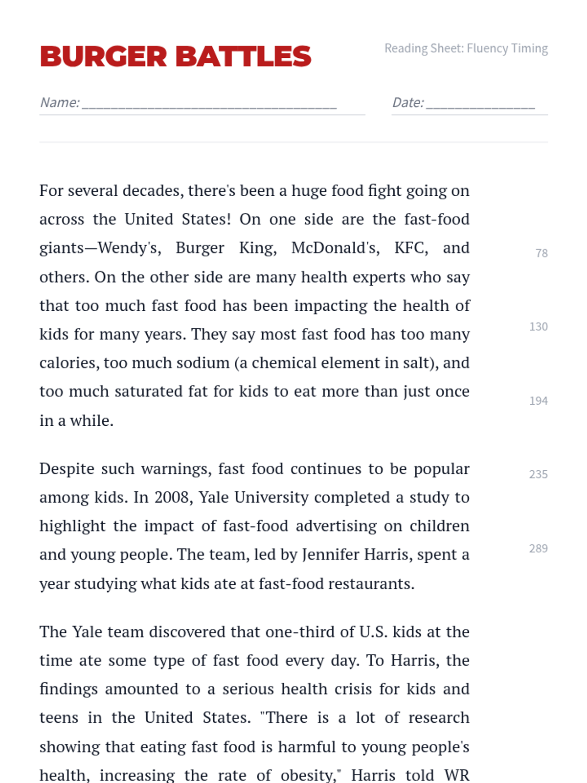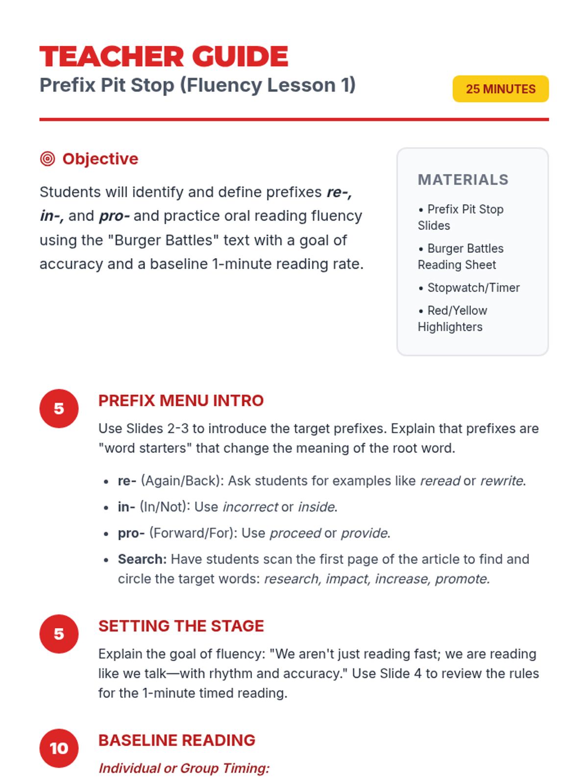 A set of four intensive intervention lessons based on the 'Burger Battles' article. Two lessons focus on prefix fluency (re-, in-, pro-) and timed readings, while two lessons focus on comprehension through author's purpose and text response.