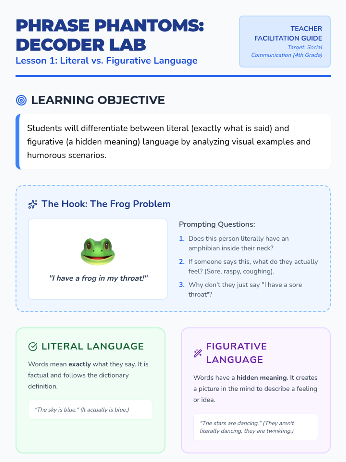 A comprehensive 4th Grade social communication sequence focusing on decoding idioms. Students move from understanding literal vs. figurative language to using context clues and creating visual representations of common social phrases.