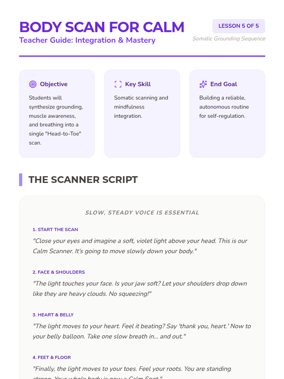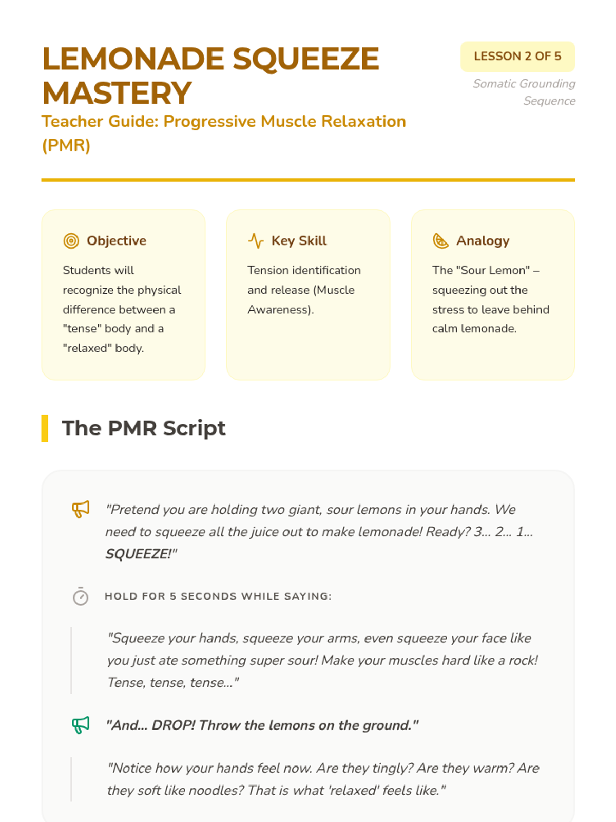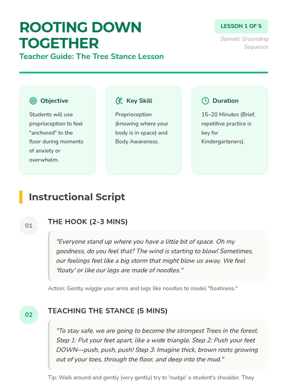 A comprehensive unit for Kindergarten students focusing on somatic grounding techniques. Students learn to use their bodies as anchors through metaphors like trees, balloons, and lemons to manage big feelings and stay present.