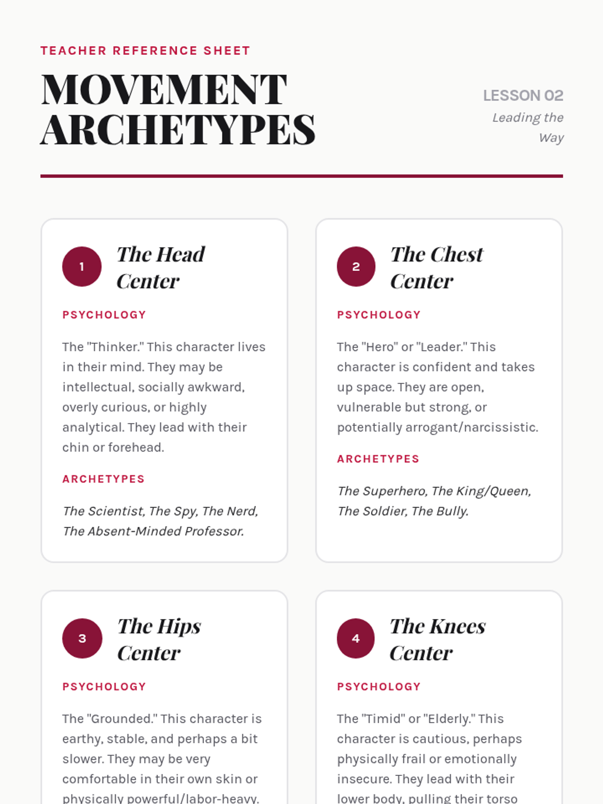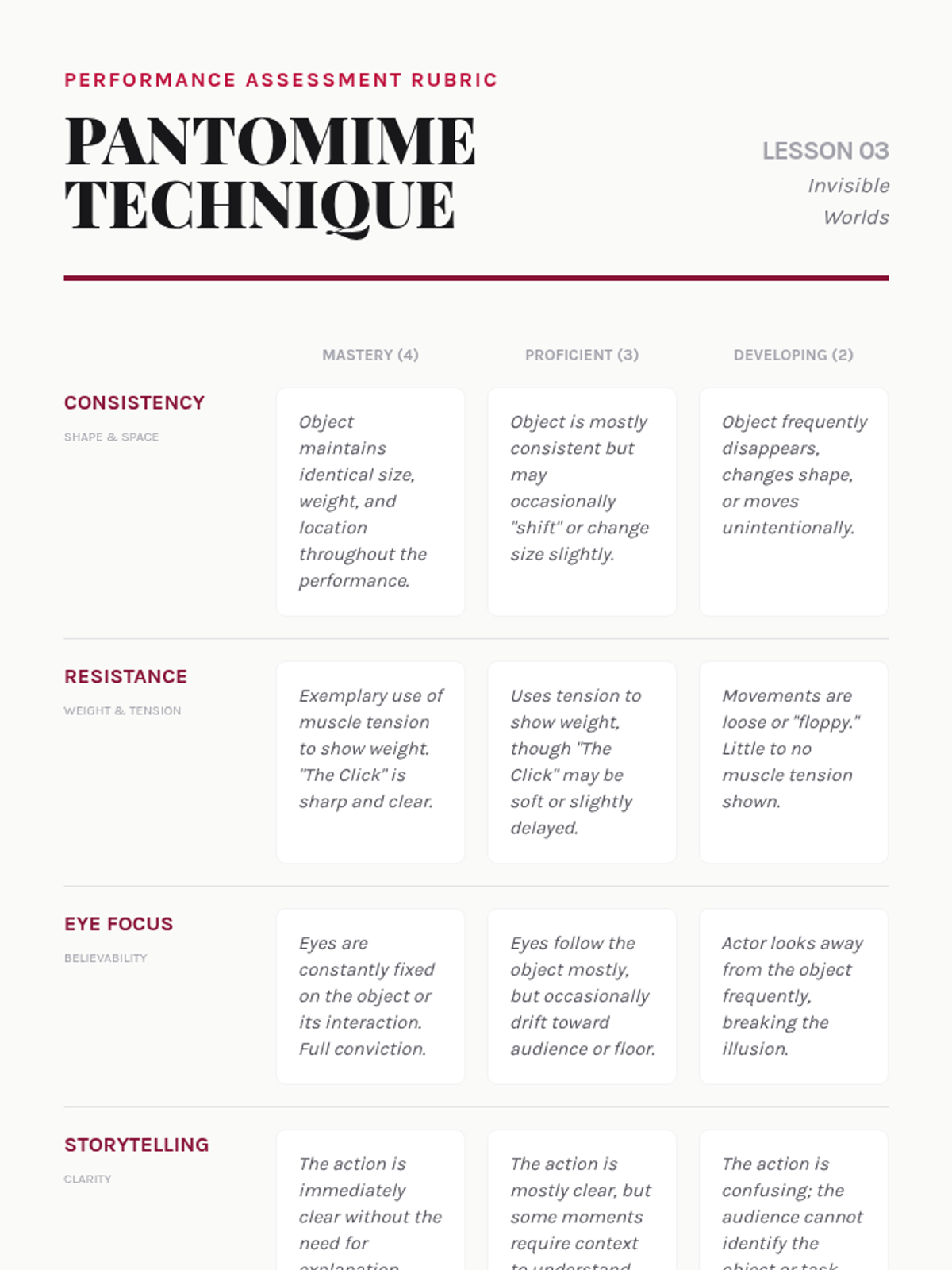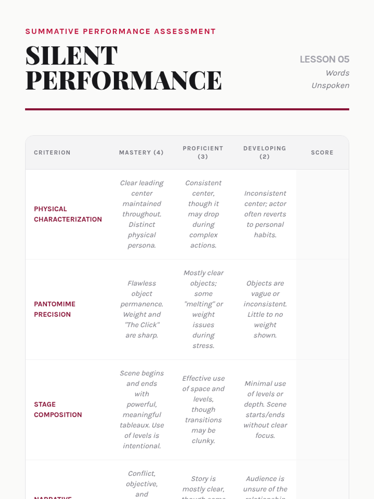 A comprehensive 5-lesson sequence for 8th-grade theater students focusing on physical characterization, movement centers, pantomime, and tableau. Students develop their body as a primary instrument to tell stories without relying on dialogue, culminating in a silent scene performance.