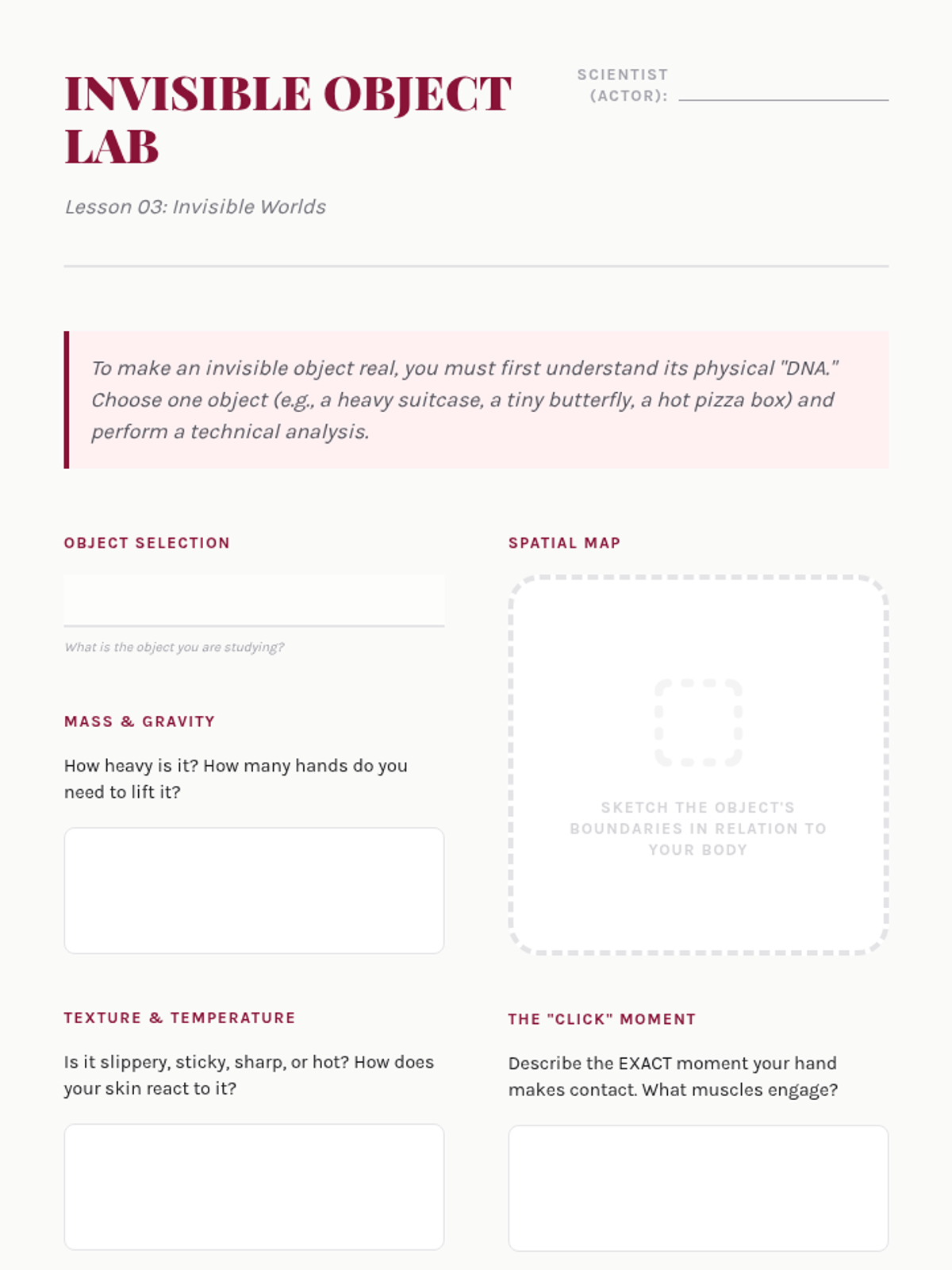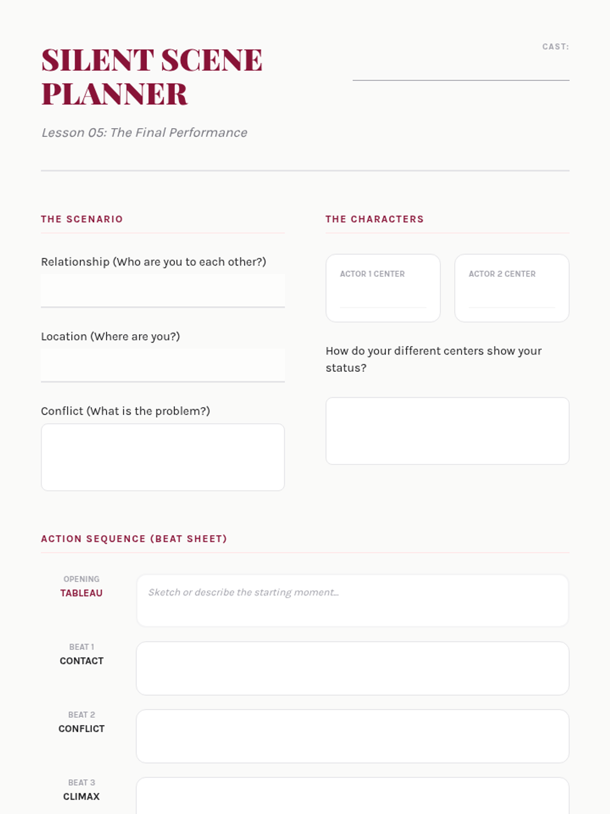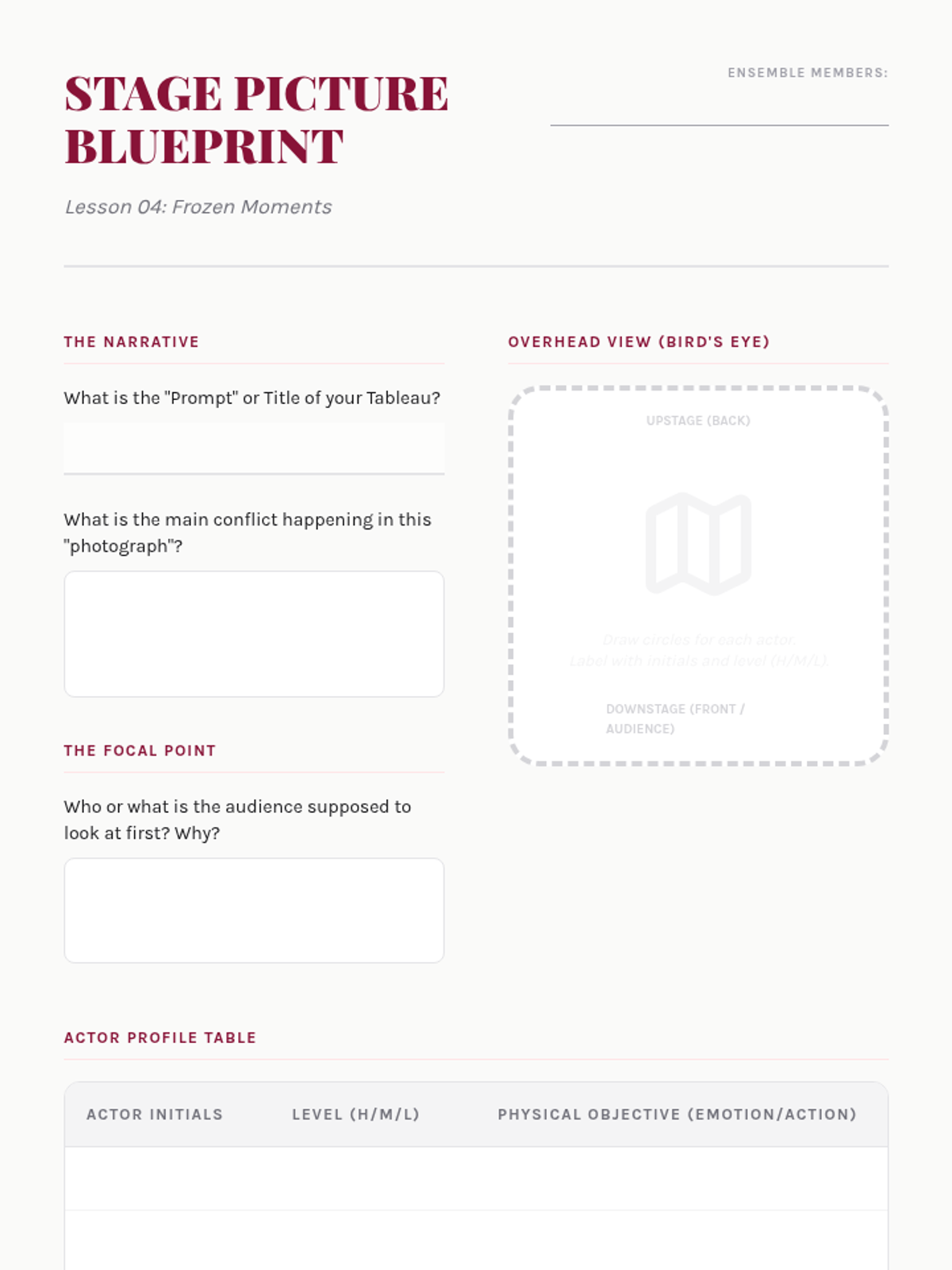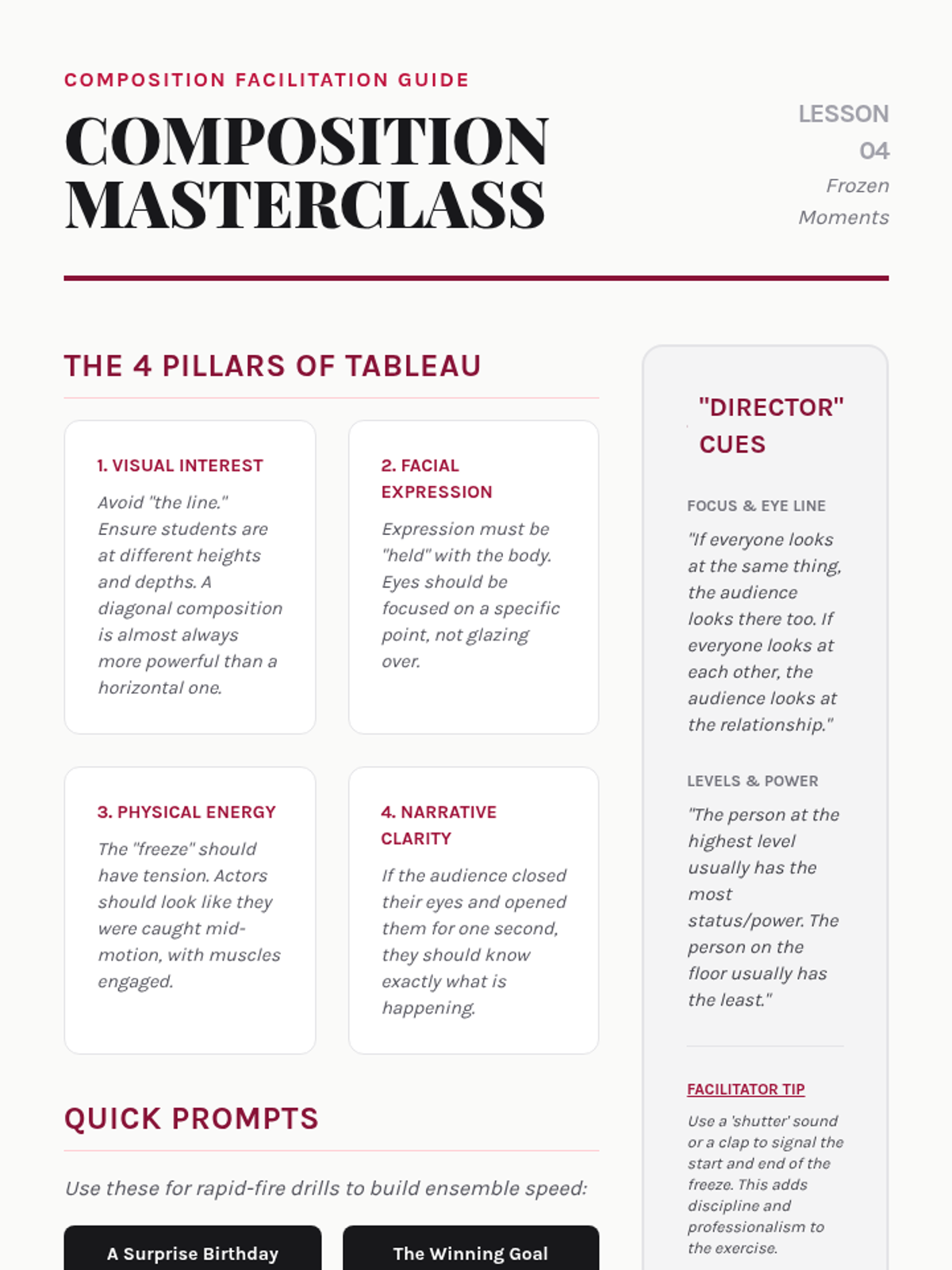 A comprehensive 5-lesson sequence for 8th-grade theater students focusing on physical characterization, movement centers, pantomime, and tableau. Students develop their body as a primary instrument to tell stories without relying on dialogue, culminating in a silent scene performance.