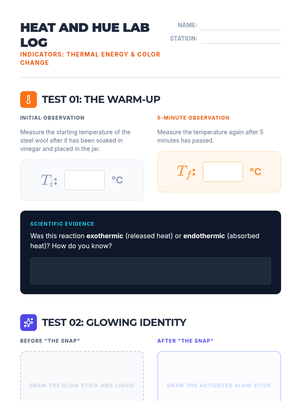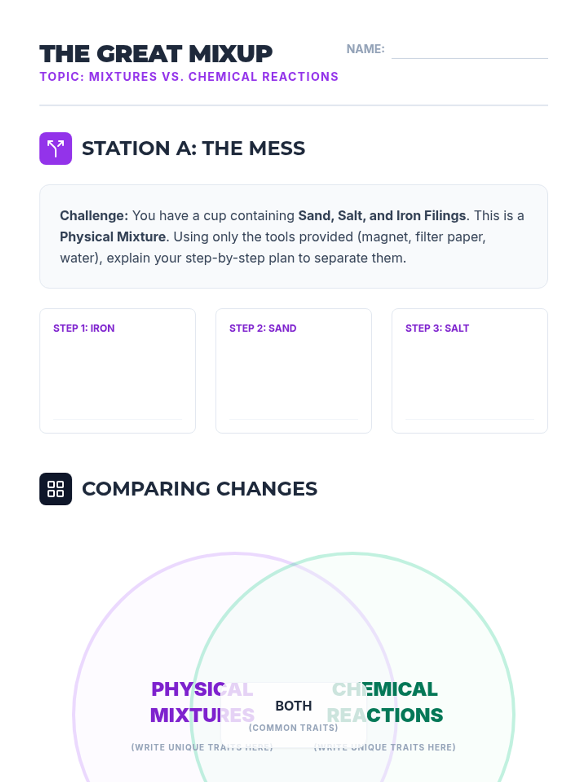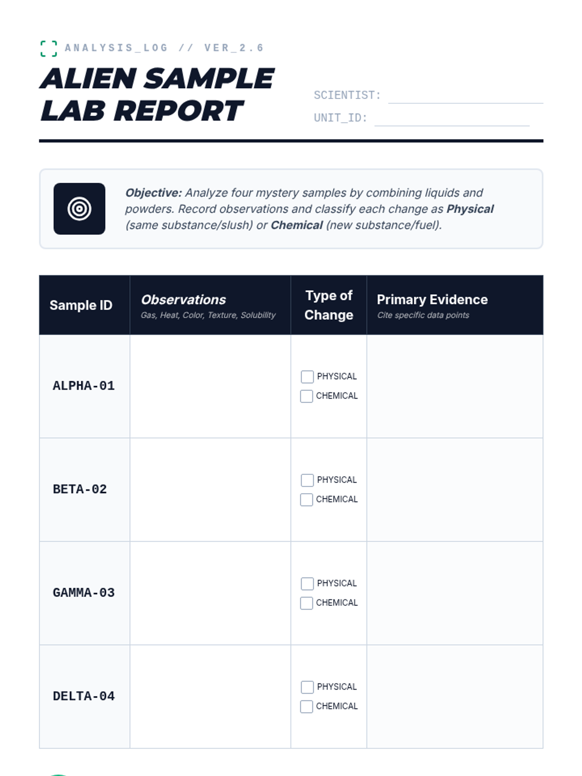 This sequence guides students through the scientific process of distinguishing between physical changes, where matter changes form but not identity, and chemical changes that create new substances. The unit emphasizes the concept of reversibility versus permanent alteration, culminating in a hands-on lab performance task.