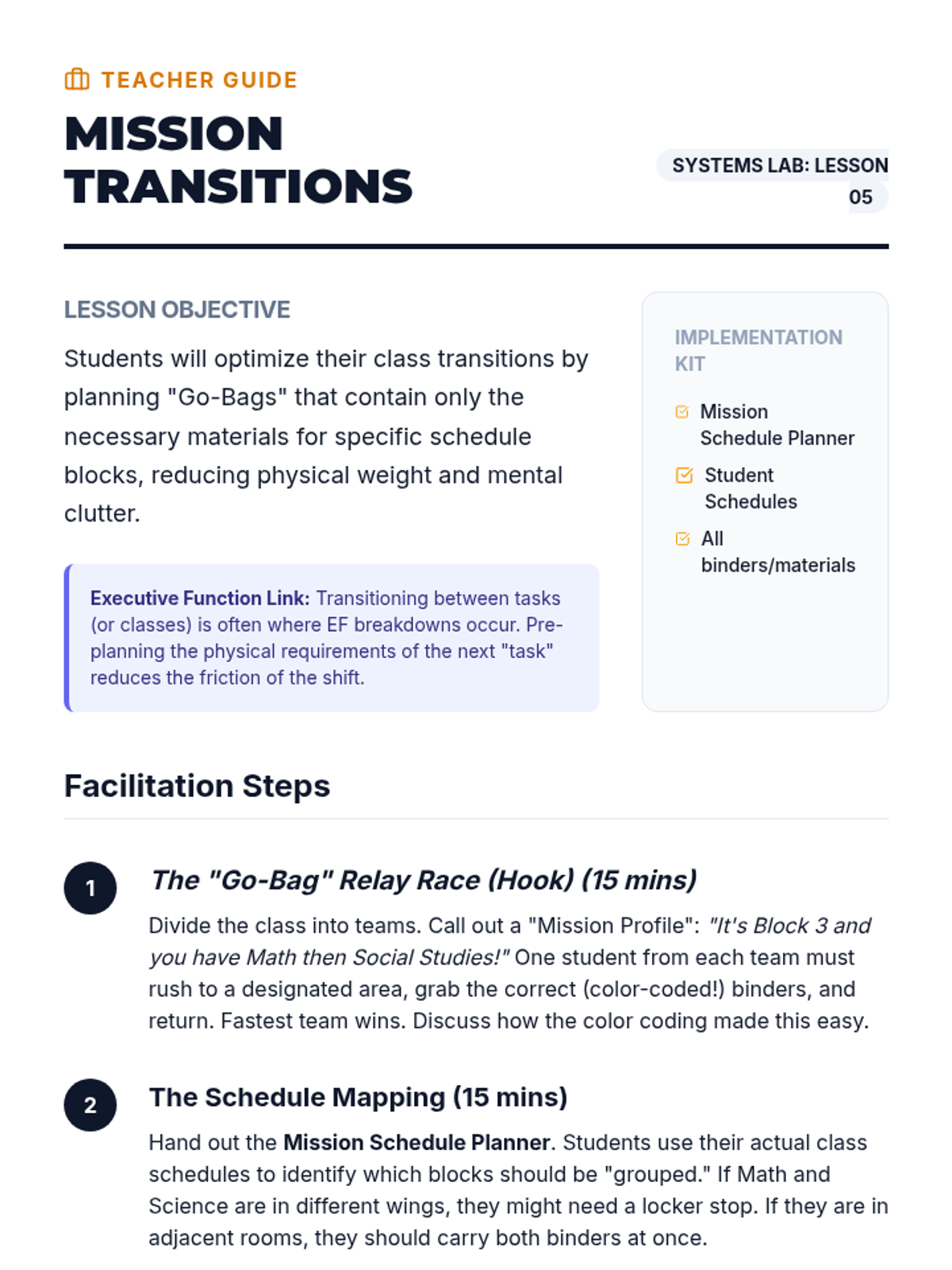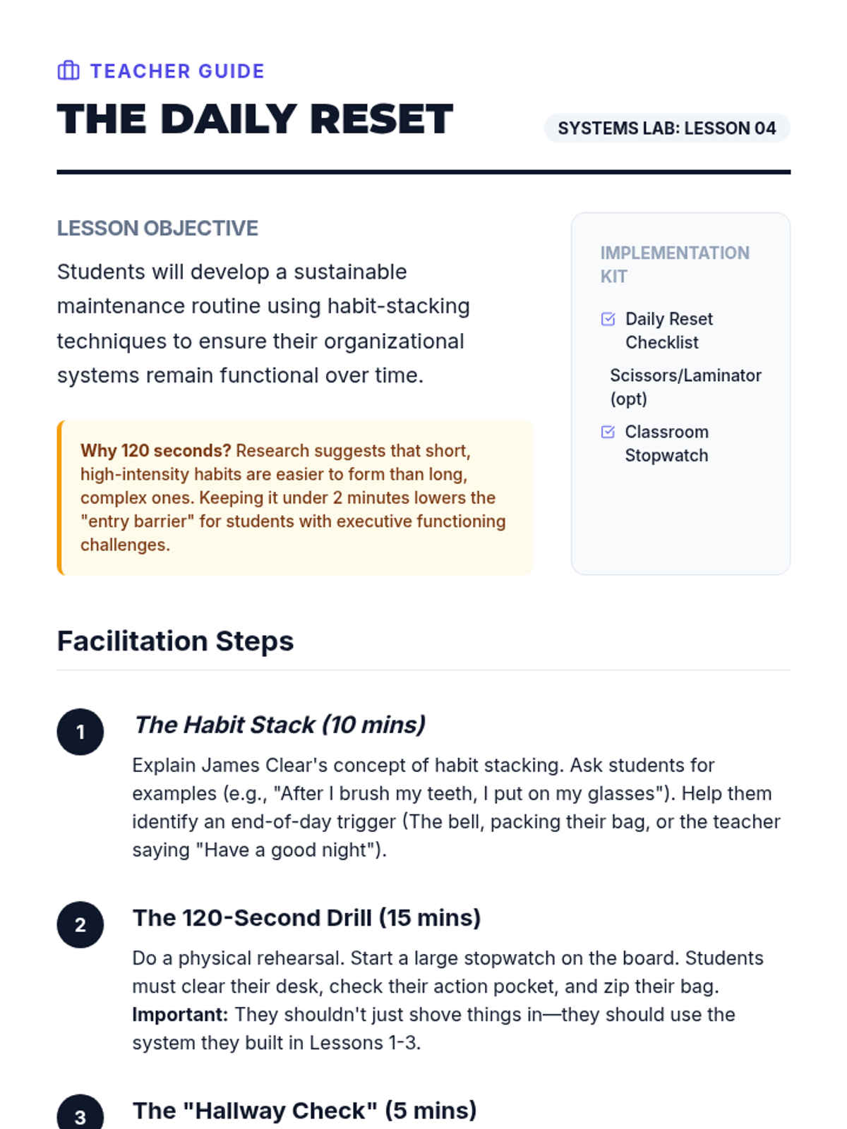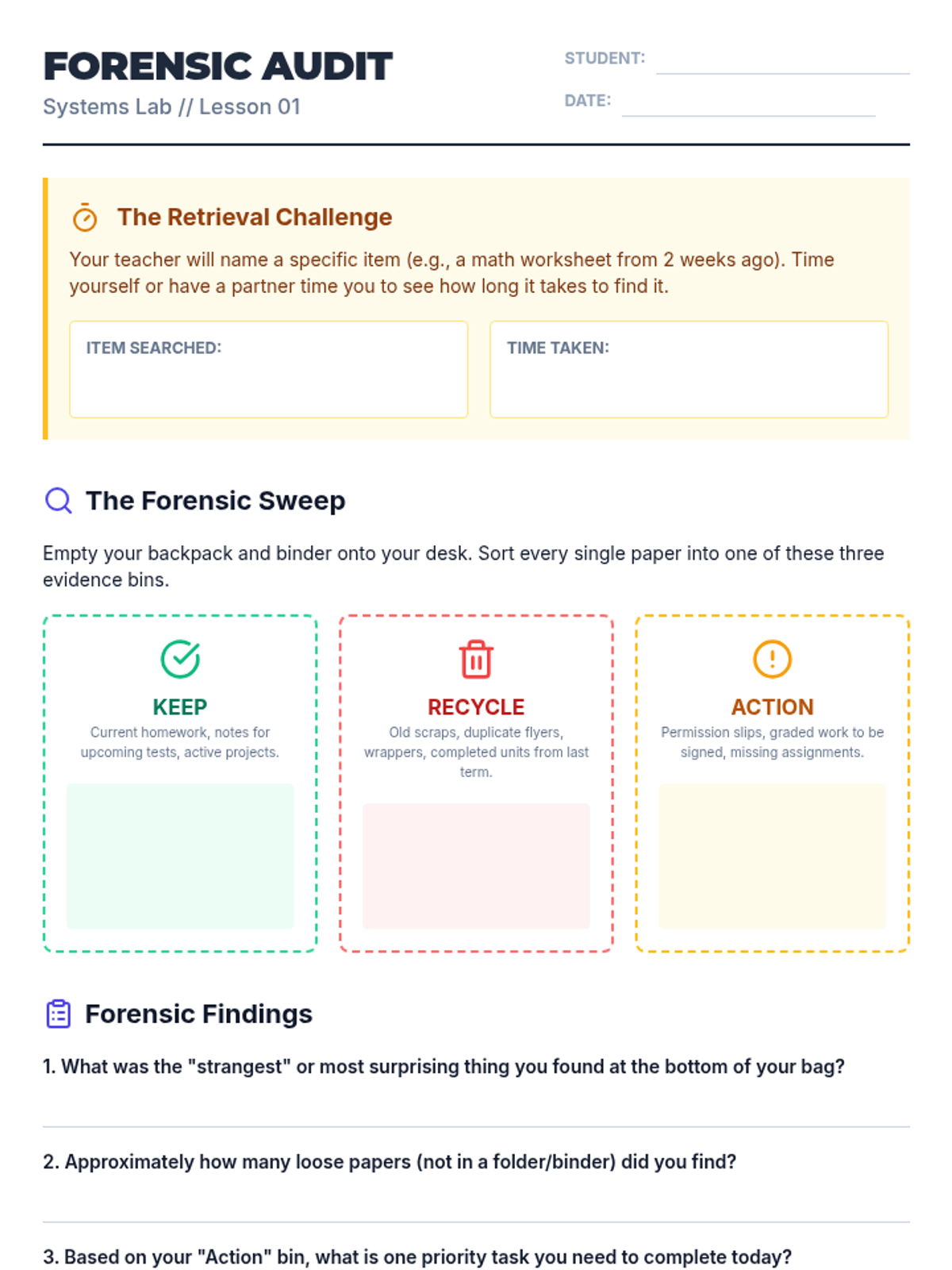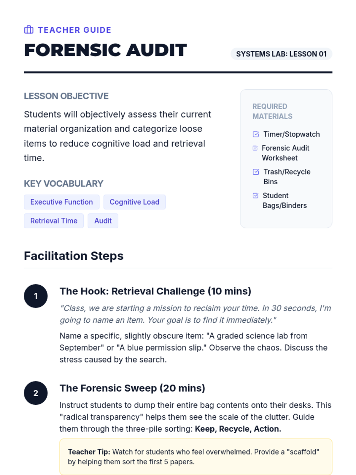 A comprehensive sequence designed to teach 7th-grade students the executive functioning skills needed to organize their physical materials, including backpacks, binders, and lockers. Students move from an initial 'forensic' audit to implementing color-coded systems and daily maintenance routines.