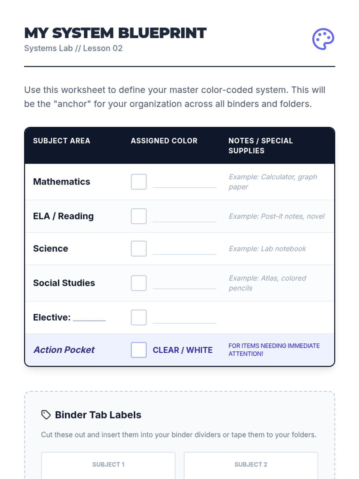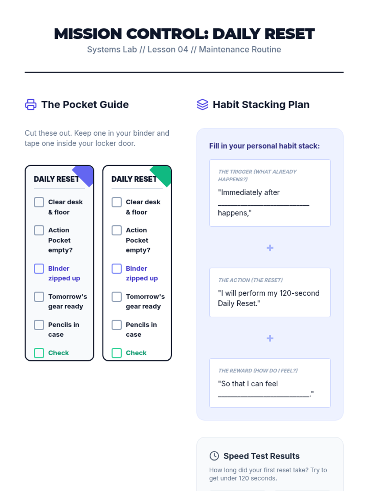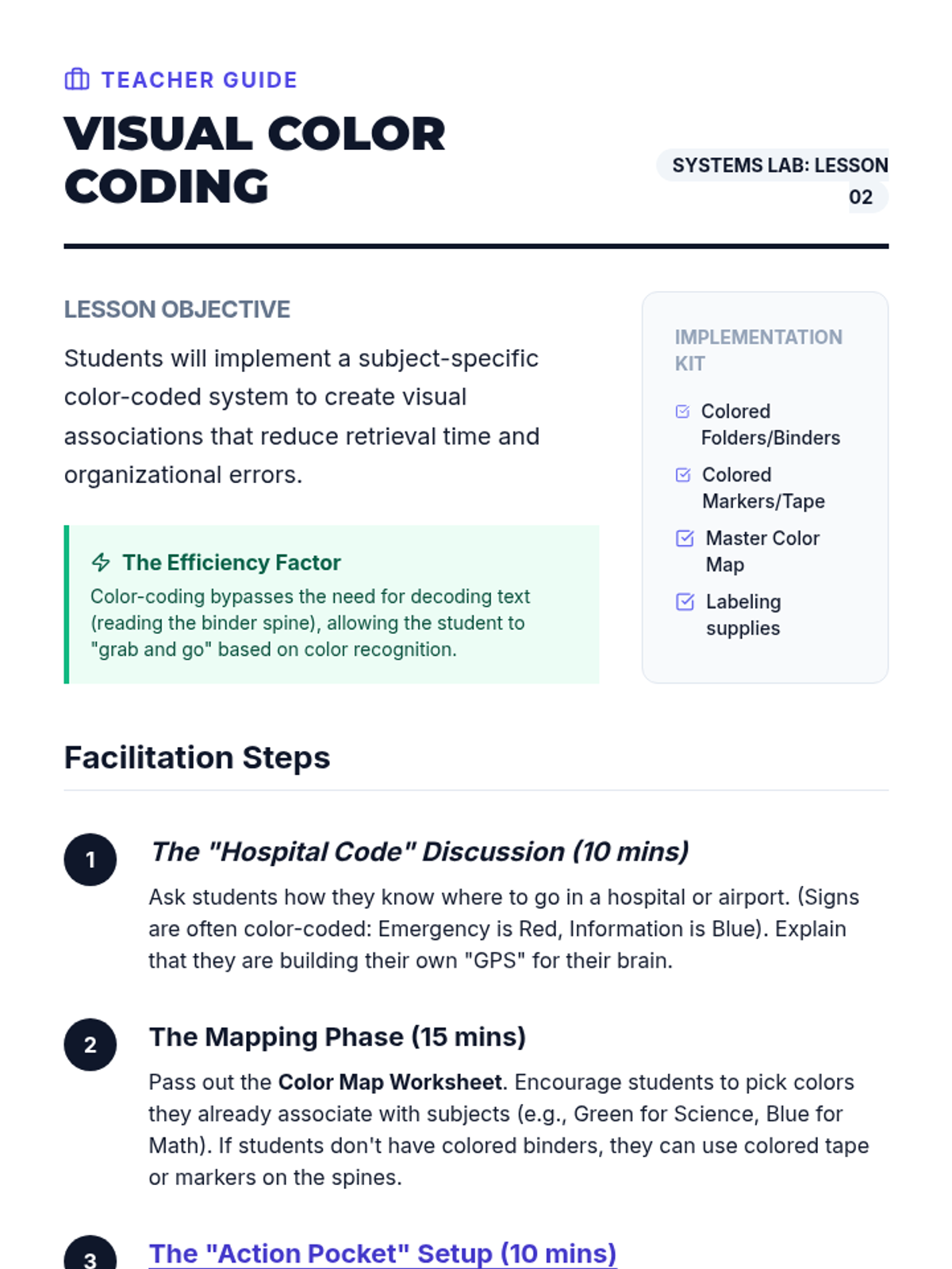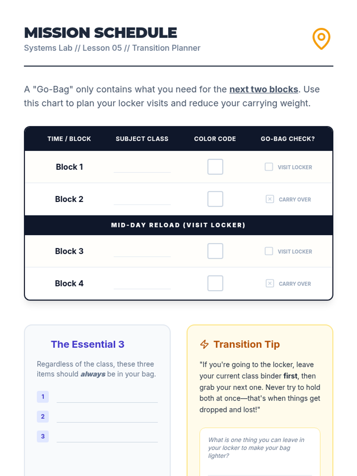 A comprehensive sequence designed to teach 7th-grade students the executive functioning skills needed to organize their physical materials, including backpacks, binders, and lockers. Students move from an initial 'forensic' audit to implementing color-coded systems and daily maintenance routines.