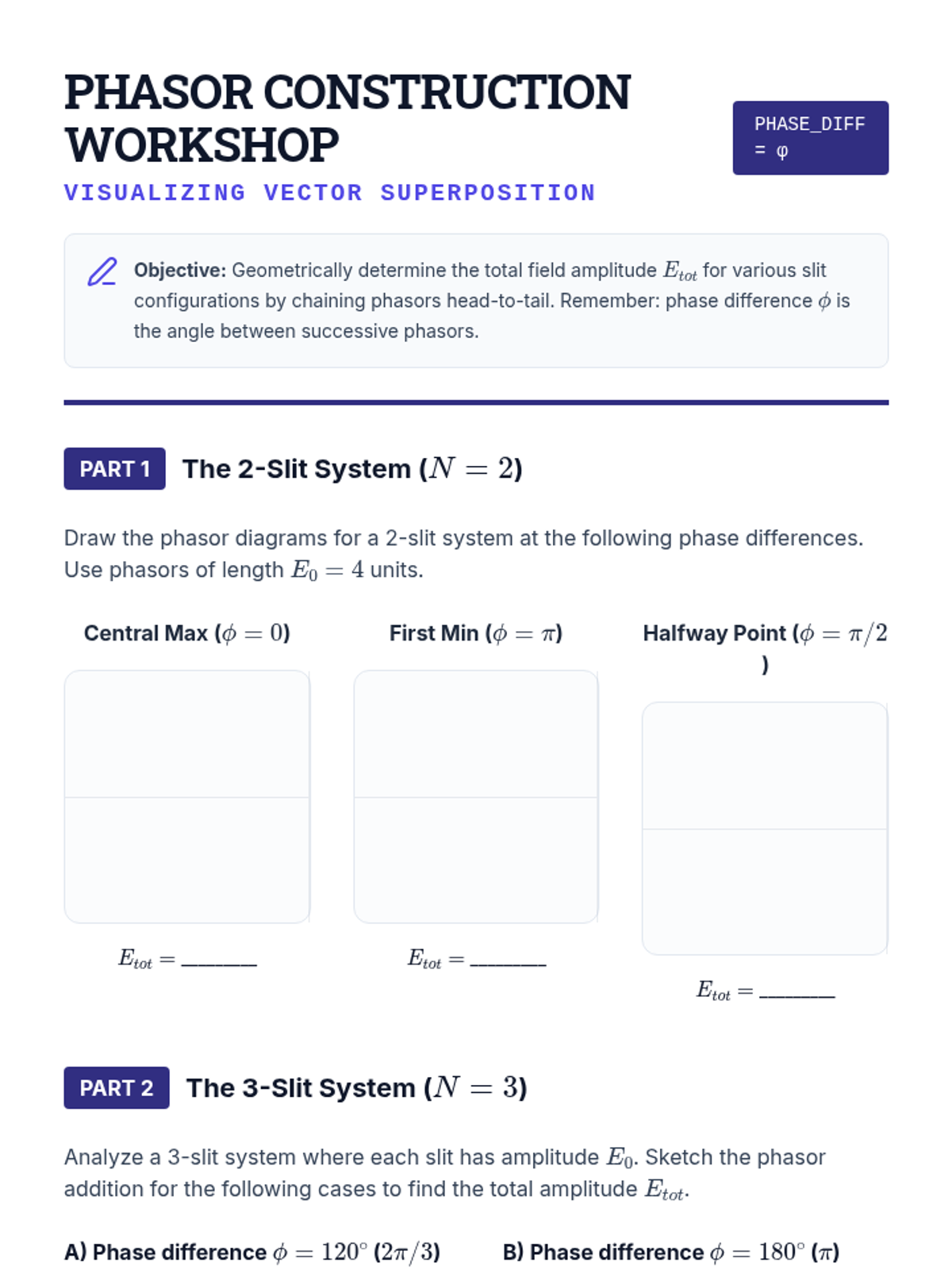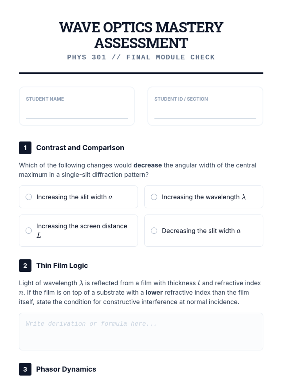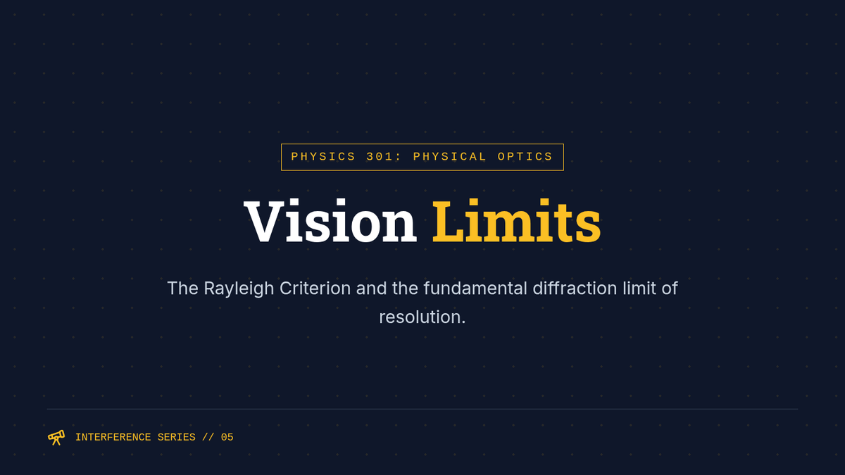 An undergraduate physics sequence exploring the wave nature of light through interference and diffraction. Students use phasor diagrams, calculus, and the Rayleigh criterion to analyze patterns from various aperture configurations and define the fundamental limits of optical resolution.