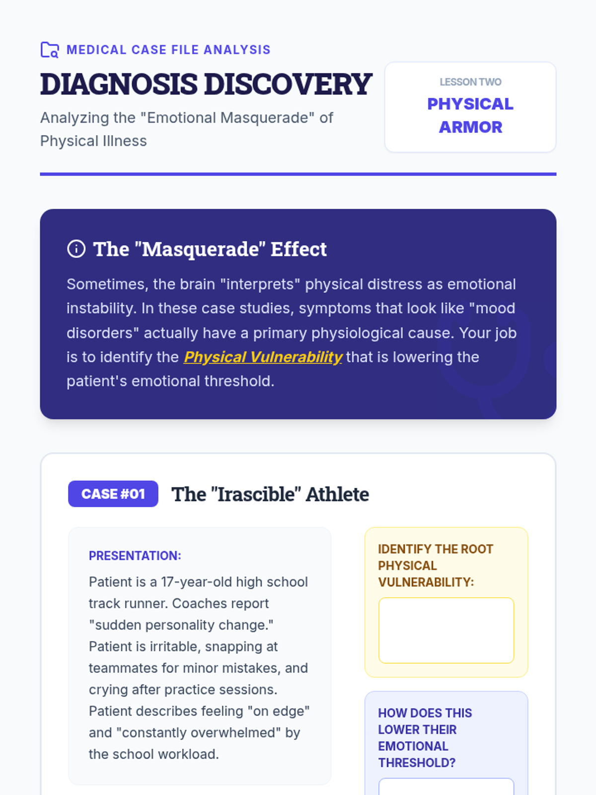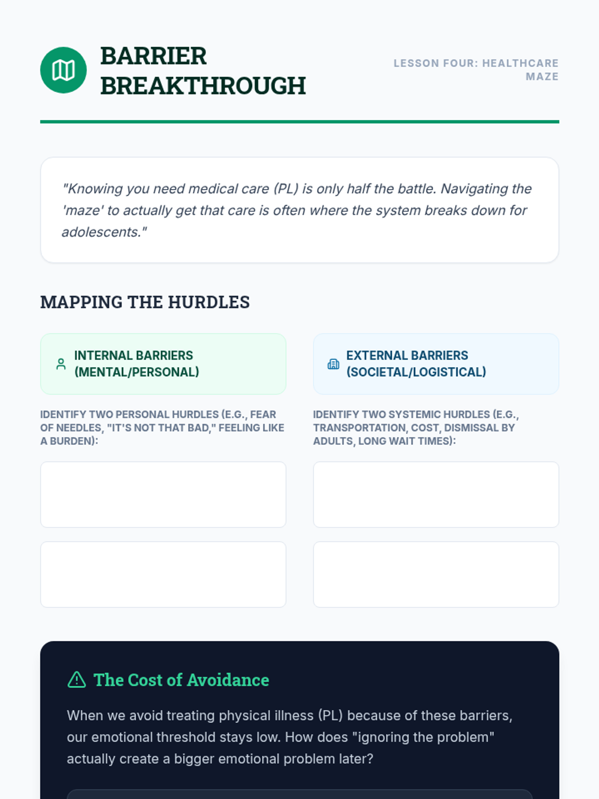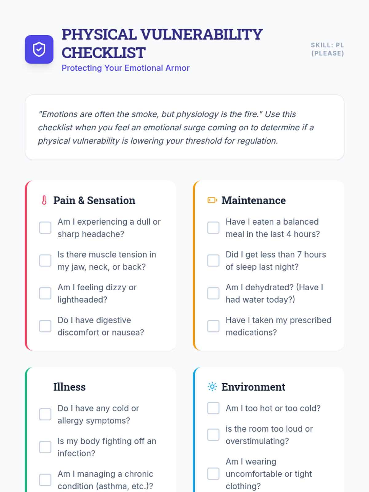 An 11th-grade sequence exploring the physiological foundations of emotional regulation, focusing on the Bio-Social Theory and the 'Treating Physical Illness' (PL) component of the PLEASE skills. Students investigate how physical health serves as the primary defense against emotional vulnerability.