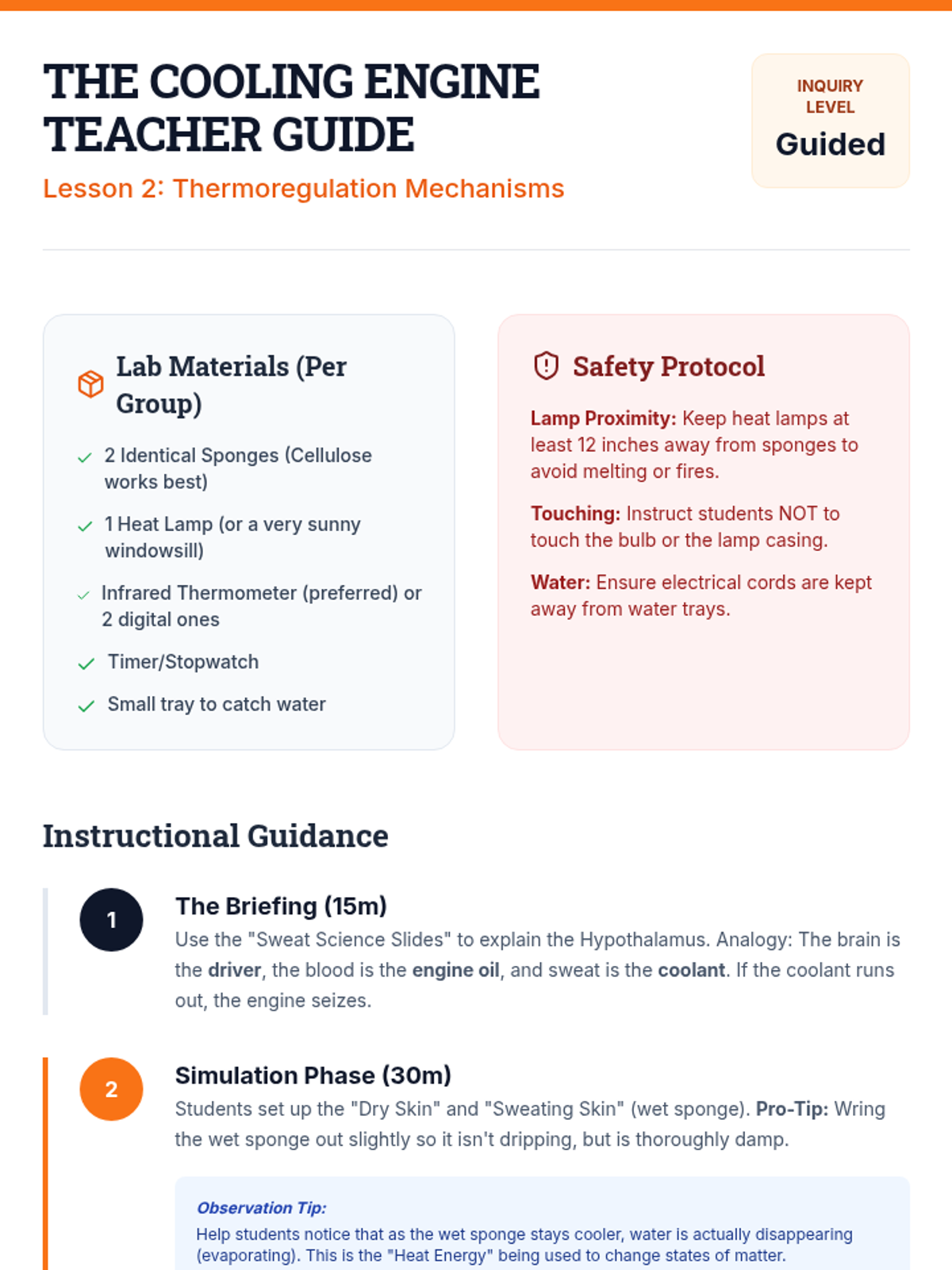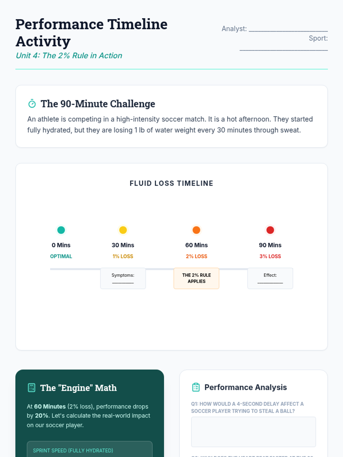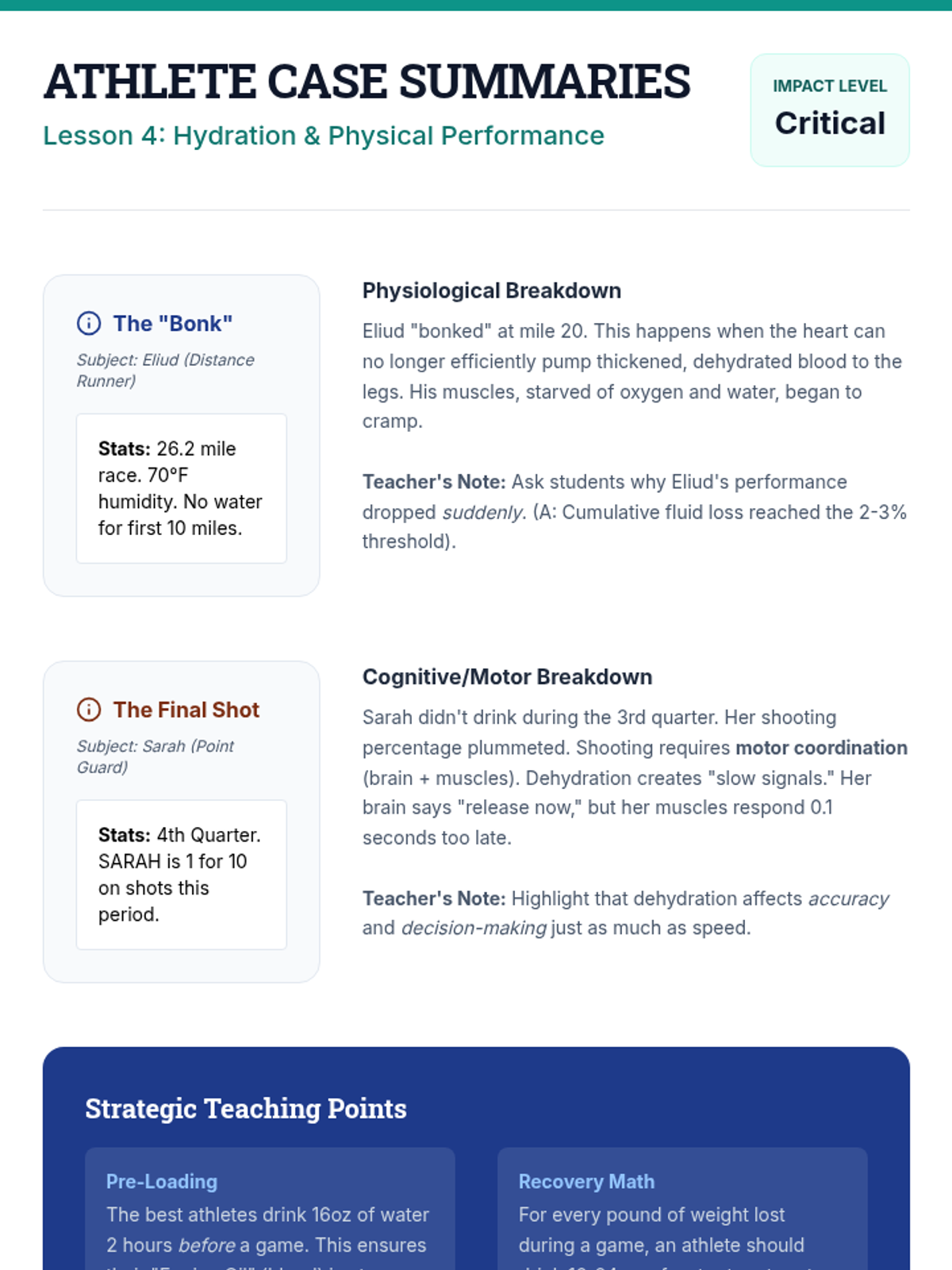 This scientific inquiry sequence guides 5th-grade students through the physiological roles water plays in the human body, from organ composition to thermoregulation and performance. Students transition from visualizing internal biology to identifying clinical signs of dehydration and creating personalized hydration strategies.