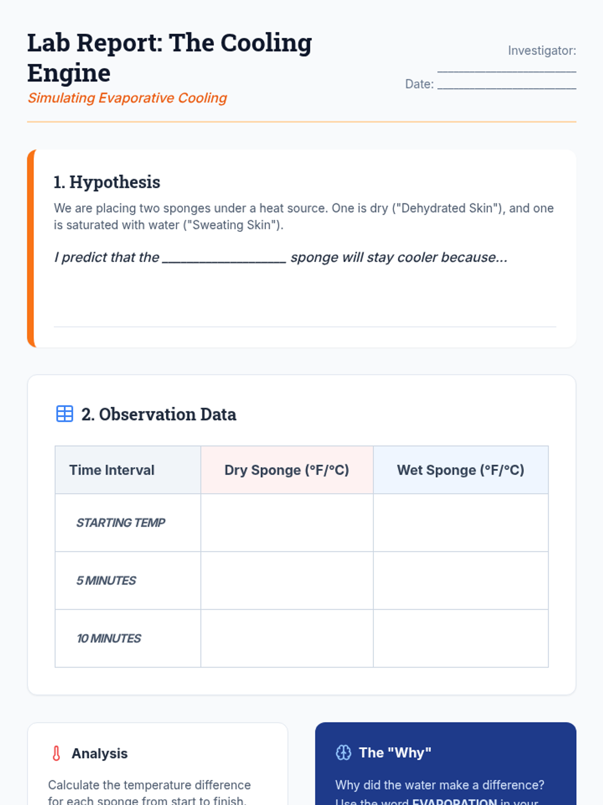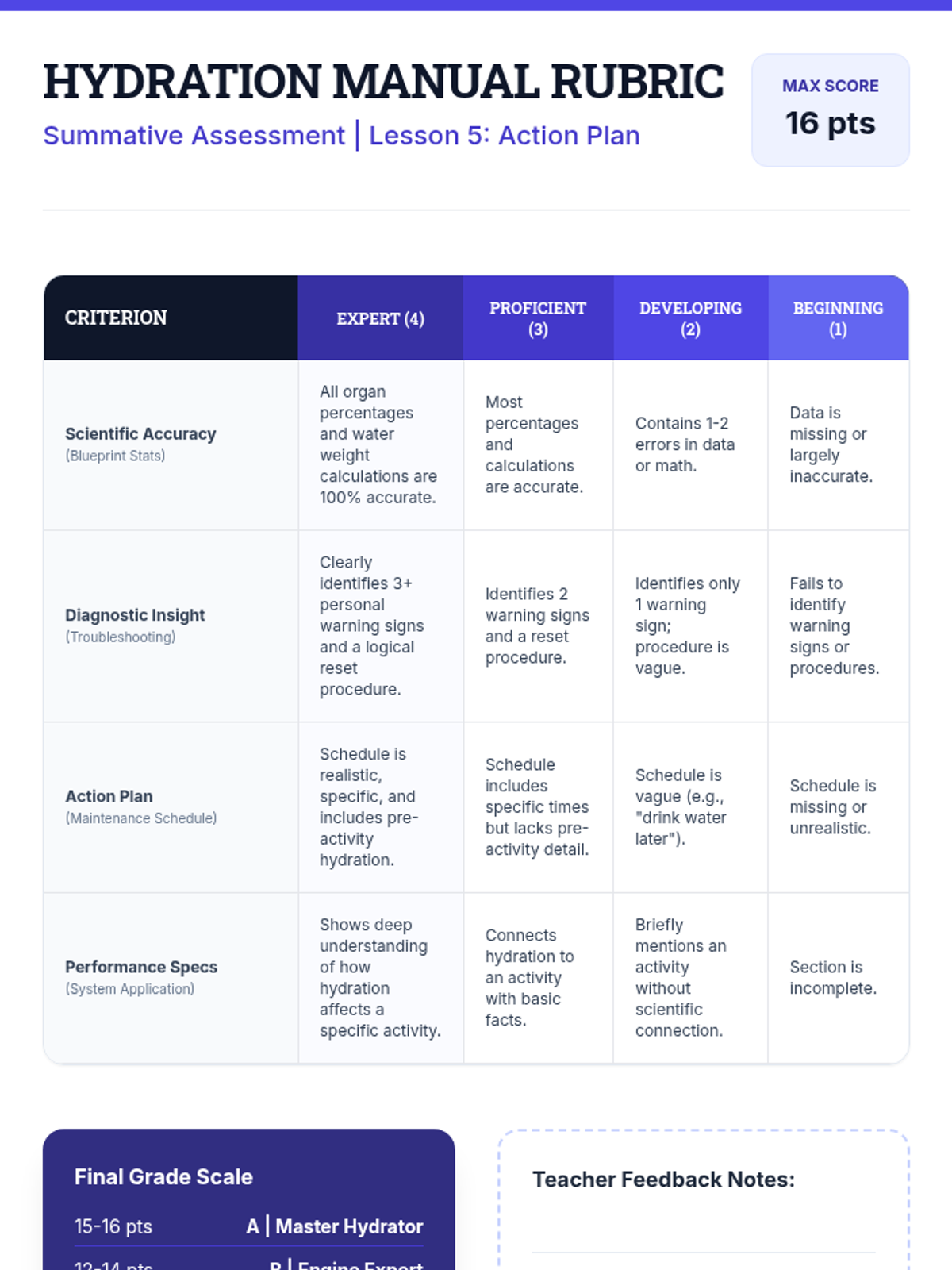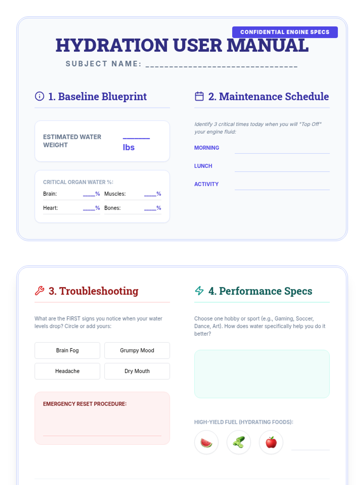 This scientific inquiry sequence guides 5th-grade students through the physiological roles water plays in the human body, from organ composition to thermoregulation and performance. Students transition from visualizing internal biology to identifying clinical signs of dehydration and creating personalized hydration strategies.