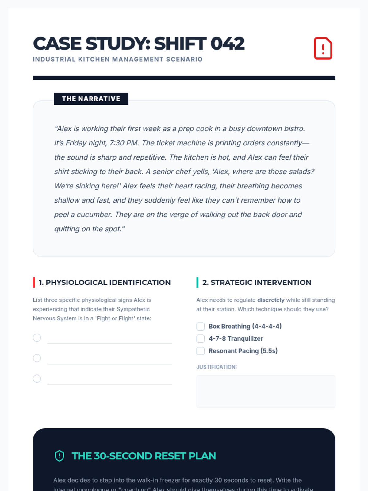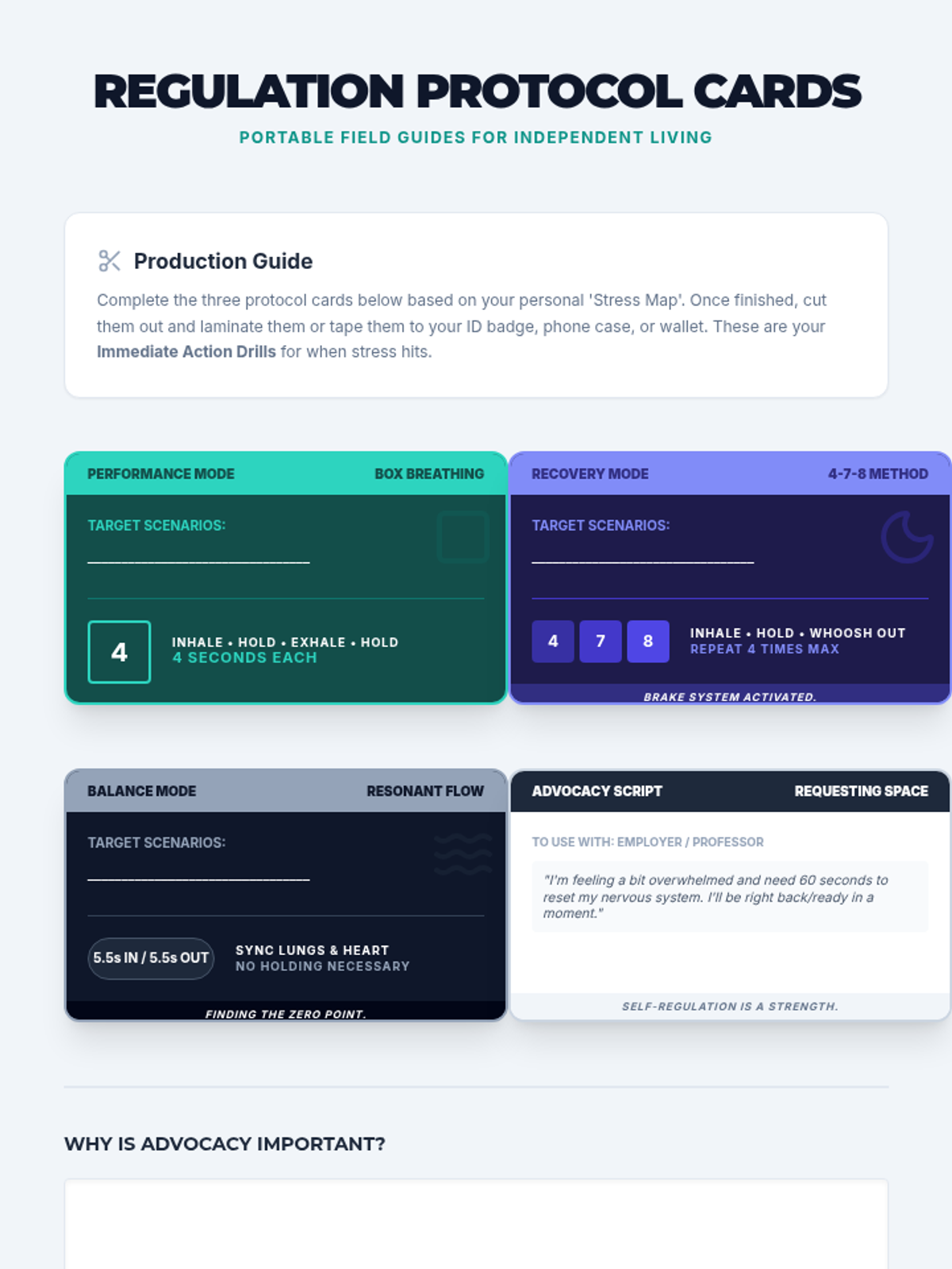 A sophisticated 5-lesson sequence for 11th-grade students exploring the biological connection between breathing and the nervous system. Students move from understanding anatomy to mastering specific techniques like box breathing and resonant frequency, culminating in a personalized regulation toolkit for independent living.