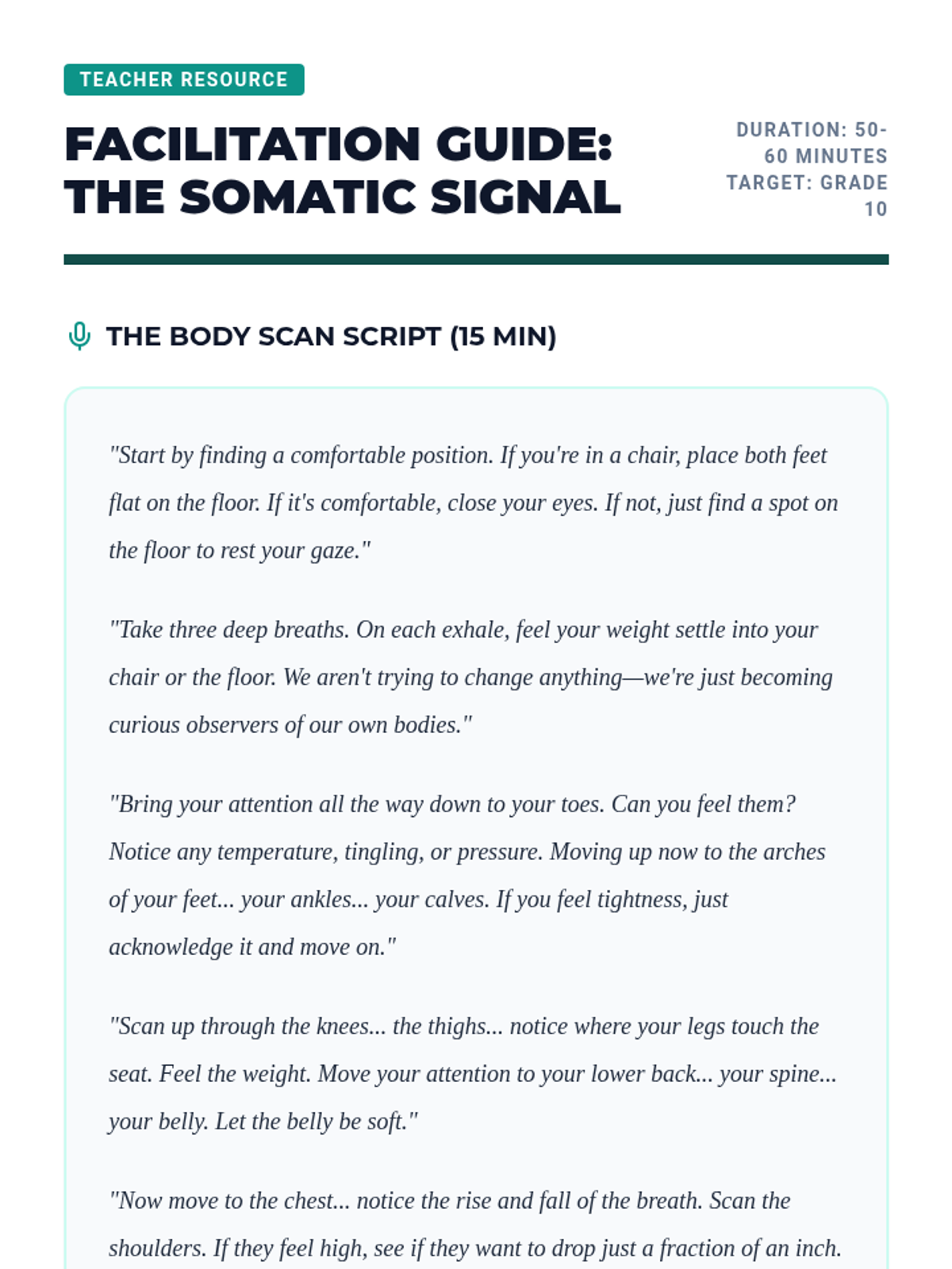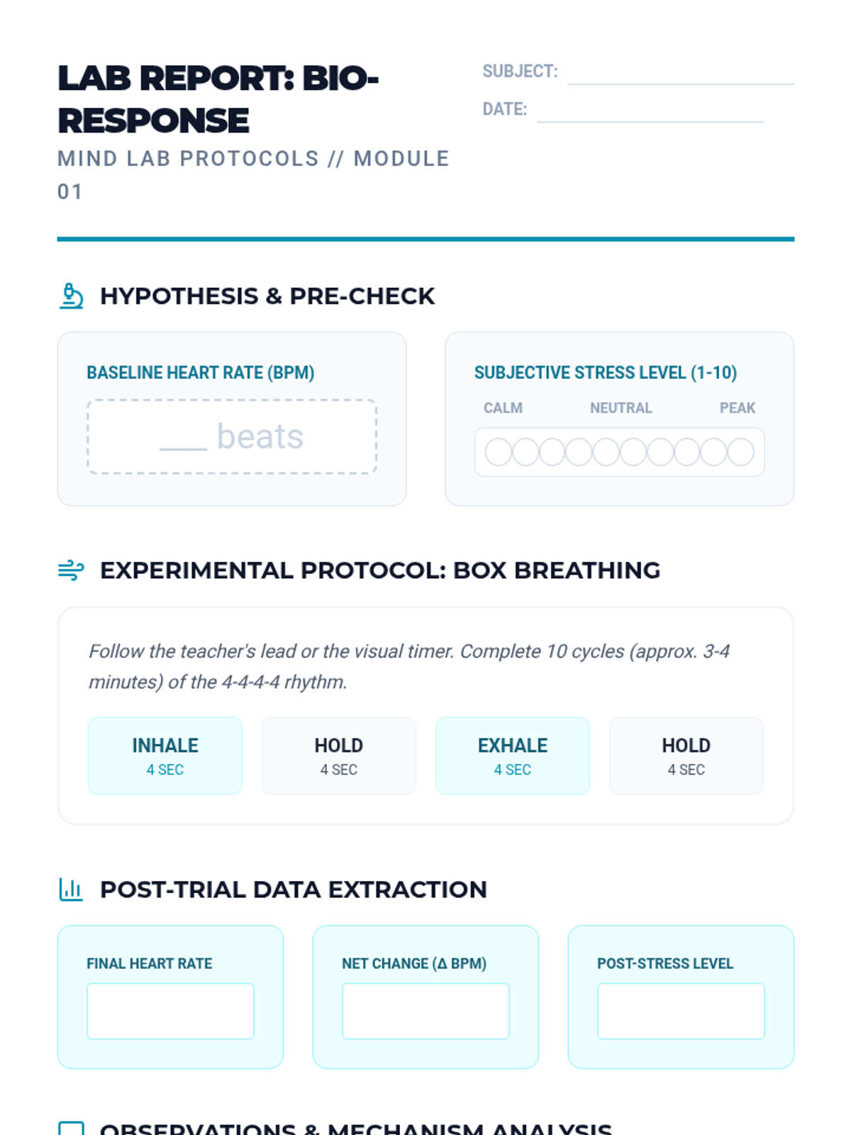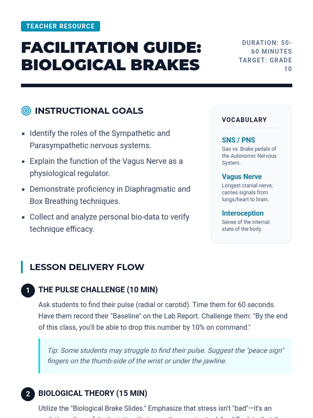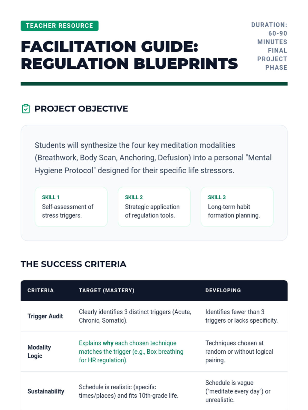 A comprehensive 10th-grade sequence exploring the intersection of neuroscience and mindfulness. Students learn the physiological basis of stress and master various meditation techniques—from box breathing to cognitive defusion—to build a personalized mental regulation protocol.