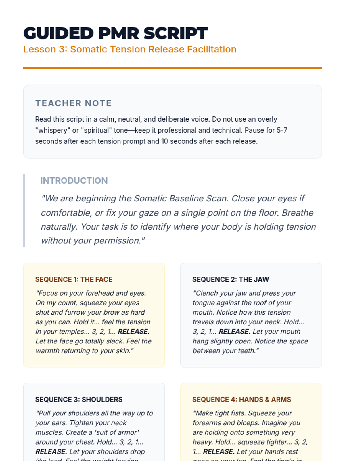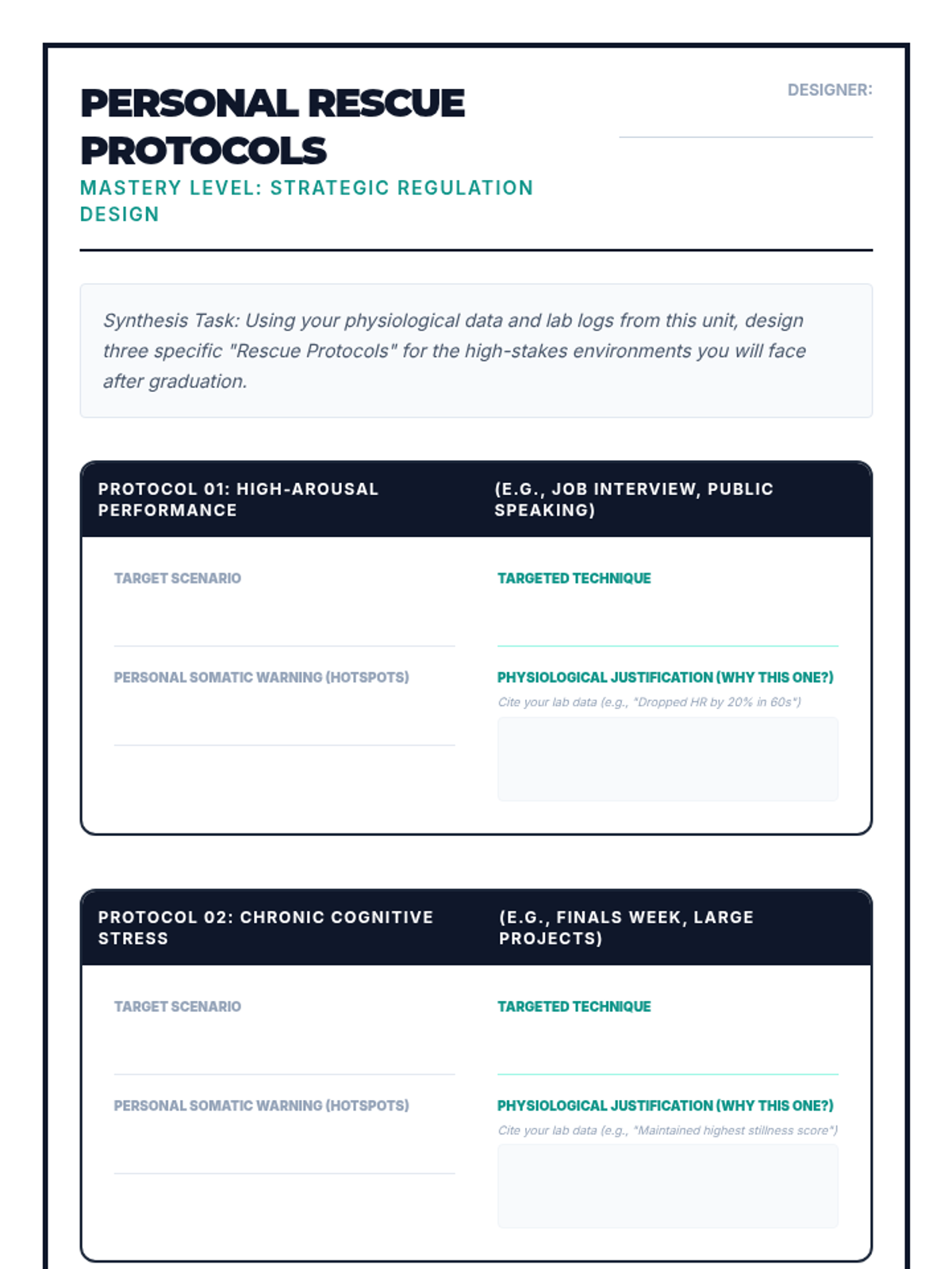 An advanced physiological regulation sequence for high school seniors, focusing on the biological mechanisms of the autonomic nervous system and practical techniques for stress management. Students move from understanding biology to designing personalized 'Rescue Protocols' for high-stakes post-graduation scenarios.