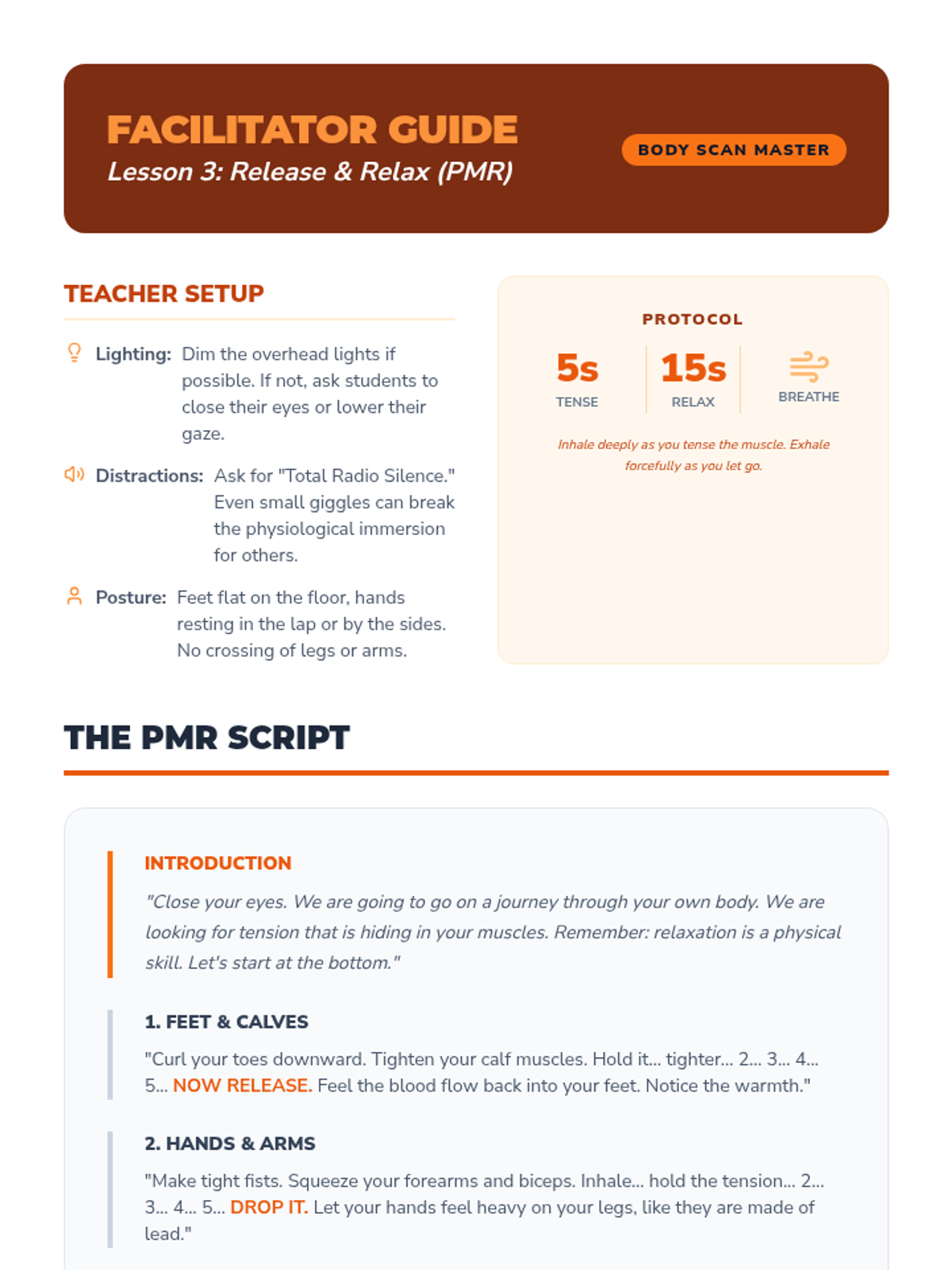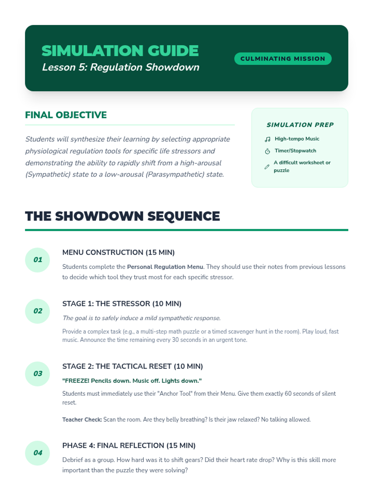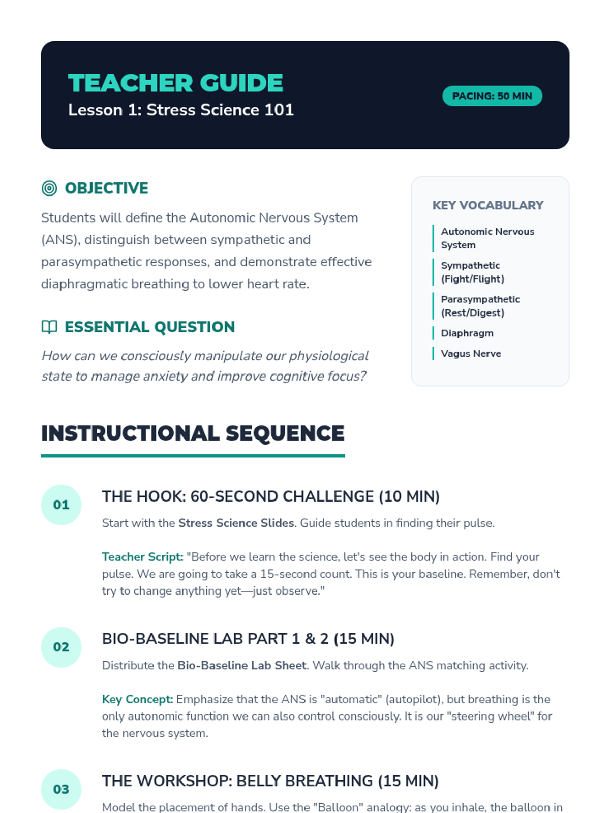A comprehensive sequence for 8th-grade students exploring the physiological mechanisms of stress and practical somatic regulation techniques including diaphragmatic breathing, rhythmic patterns, and progressive muscle relaxation.