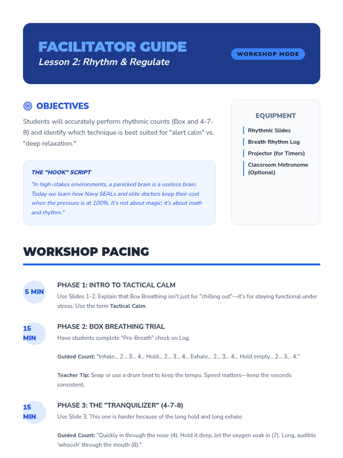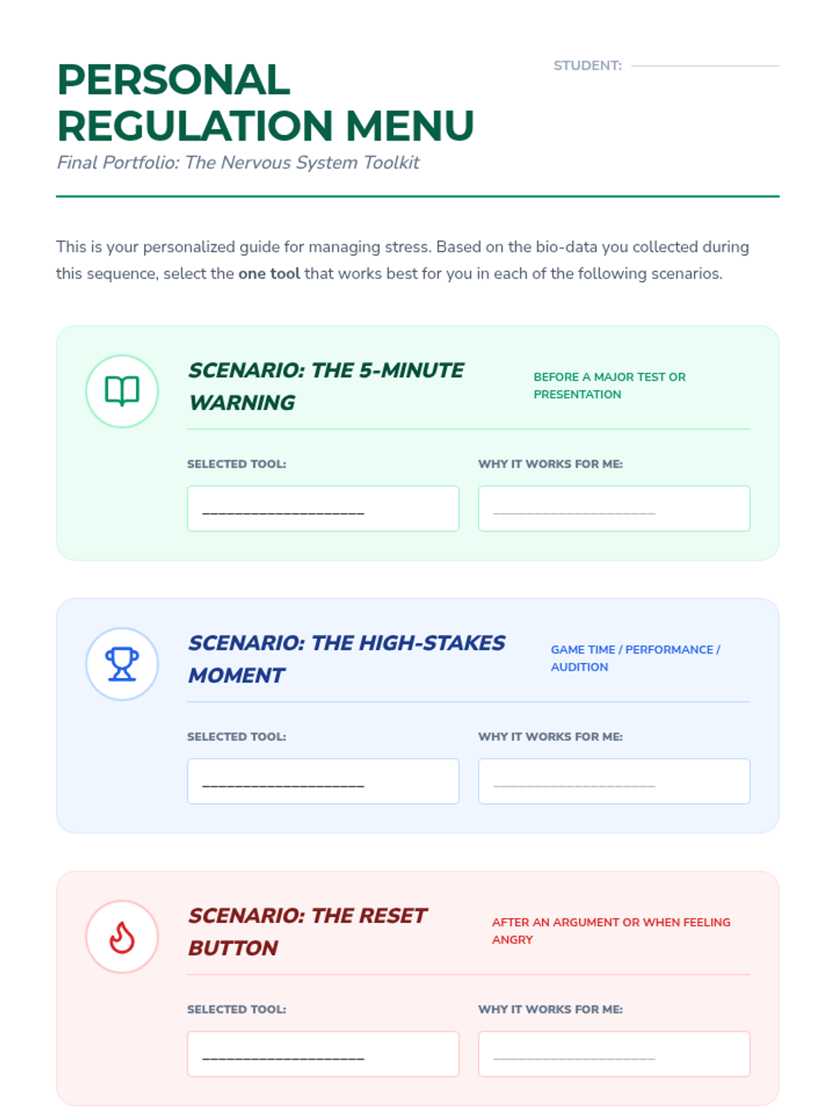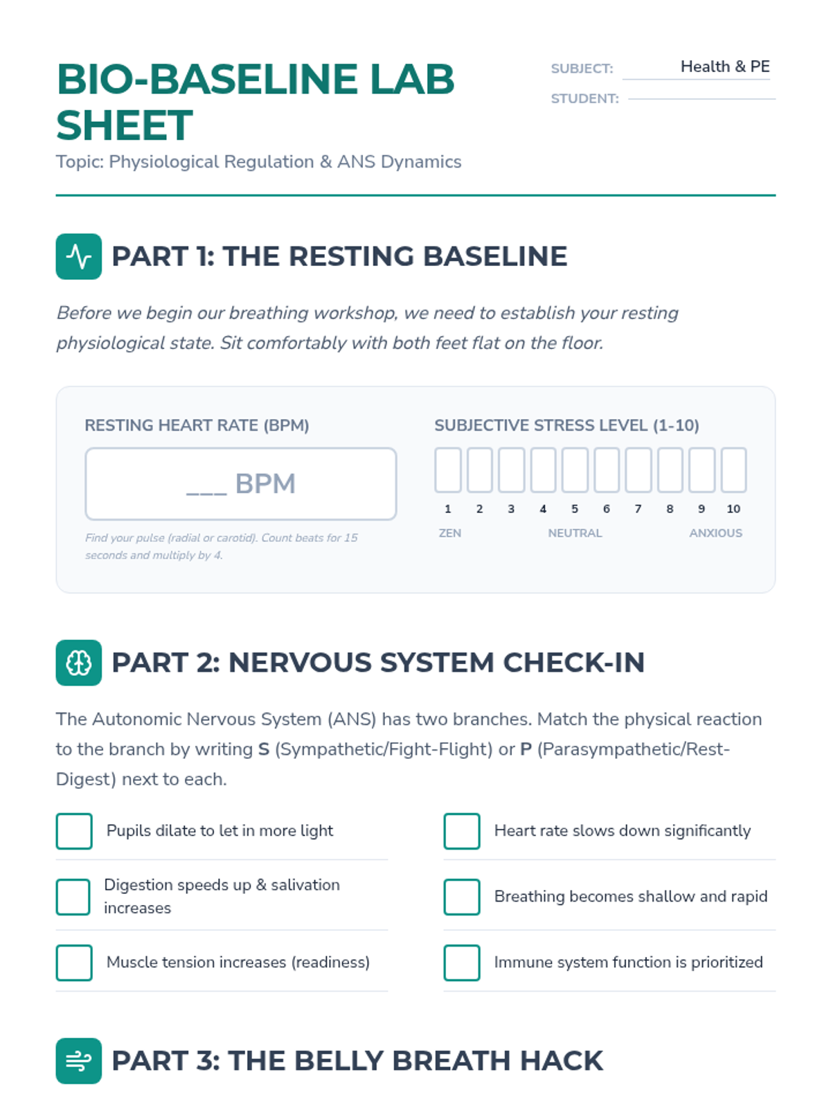 A comprehensive sequence for 8th-grade students exploring the physiological mechanisms of stress and practical somatic regulation techniques including diaphragmatic breathing, rhythmic patterns, and progressive muscle relaxation.