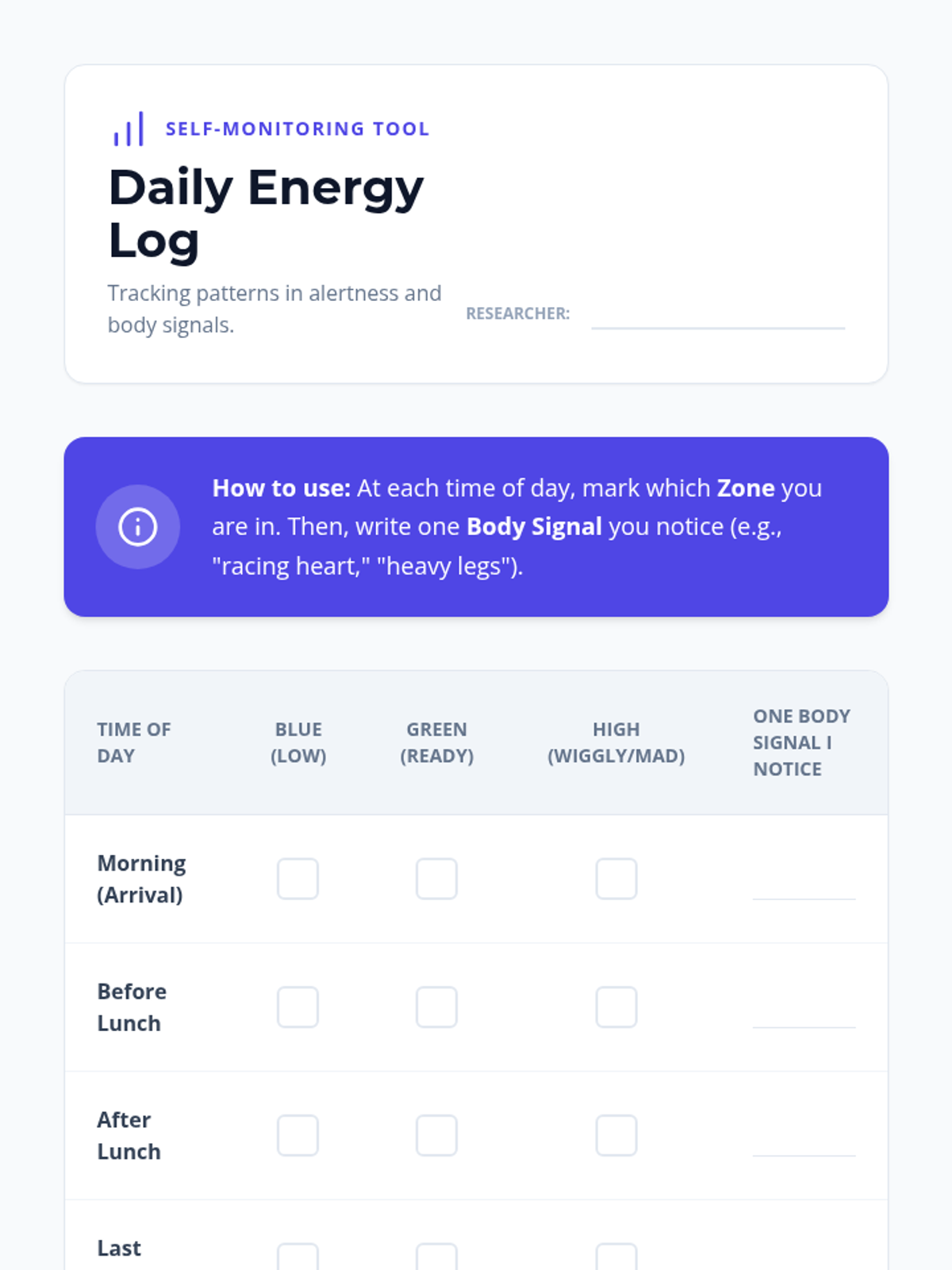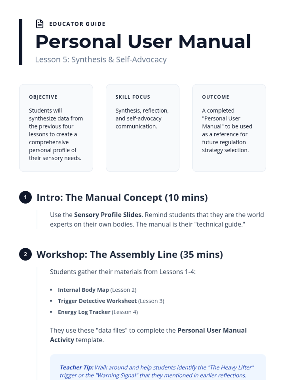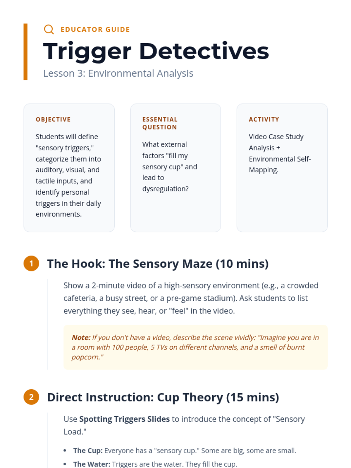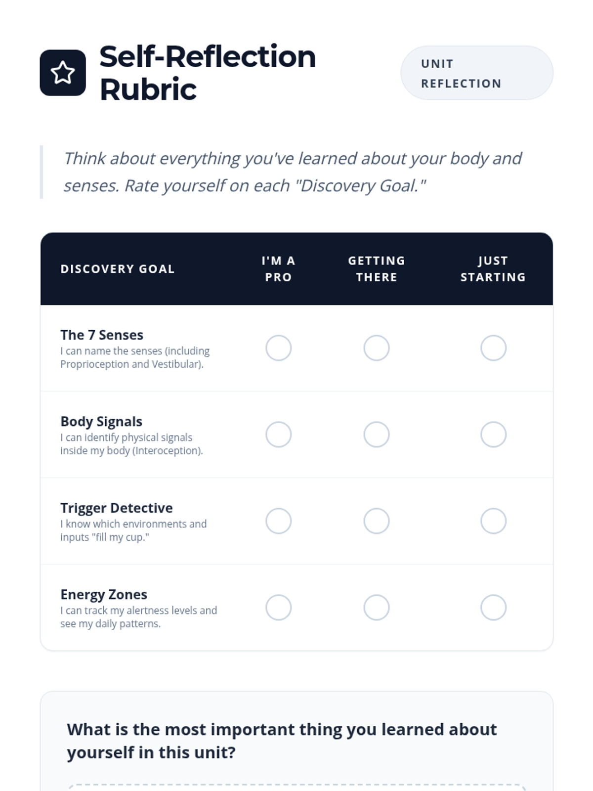 A comprehensive inquiry-based sequence for 7th-grade students to explore the biological foundations of sensory processing. Students learn to identify interoceptive signals, recognize environmental triggers, and track their energy levels to create a personalized 'Body Battery' profile for proactive self-regulation.