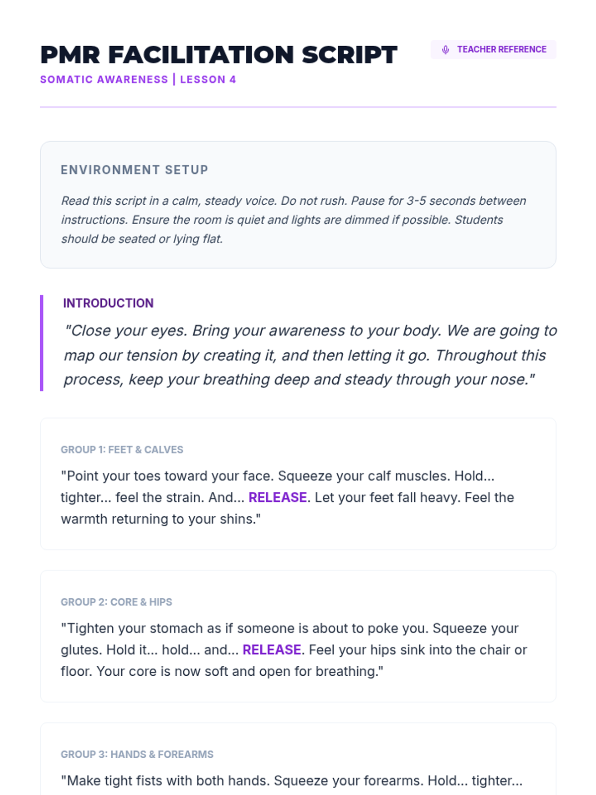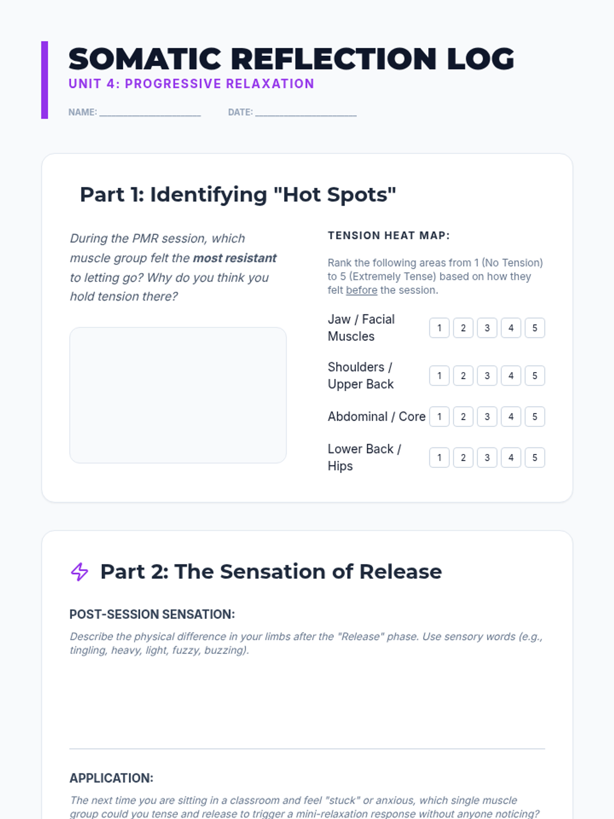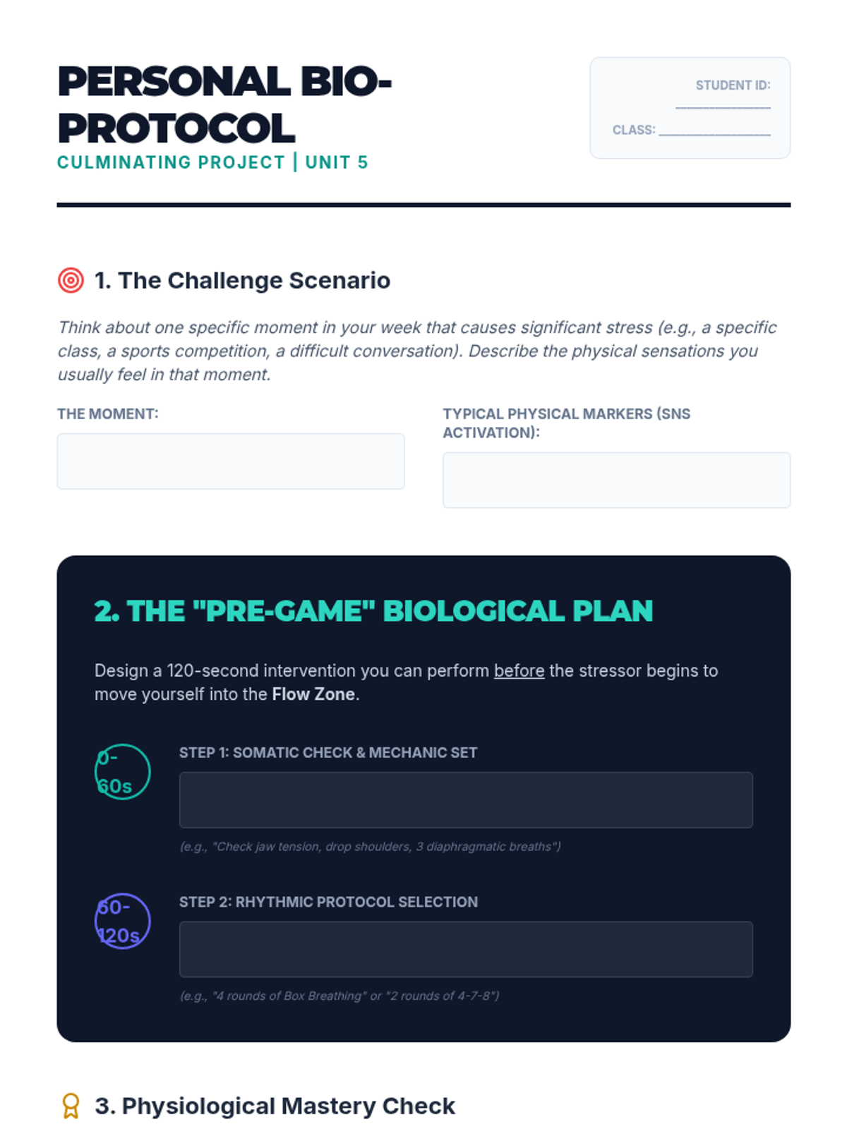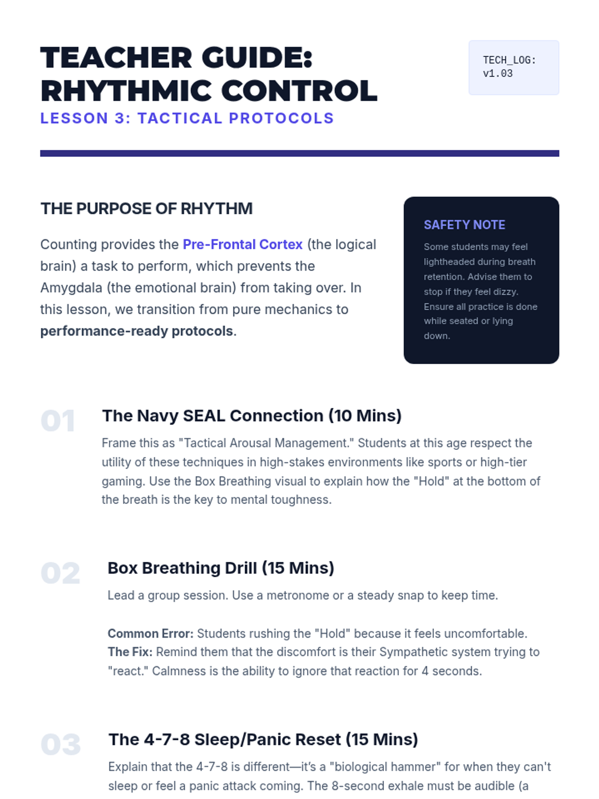 This sequence grounds meditation practice in scientific principles, focusing on the physiological connection between respiration and the nervous system. Students explore the biology of stress, learn diaphragmatic breathing, practice rhythmic protocols like box breathing, and apply these tools to manage performance anxiety.