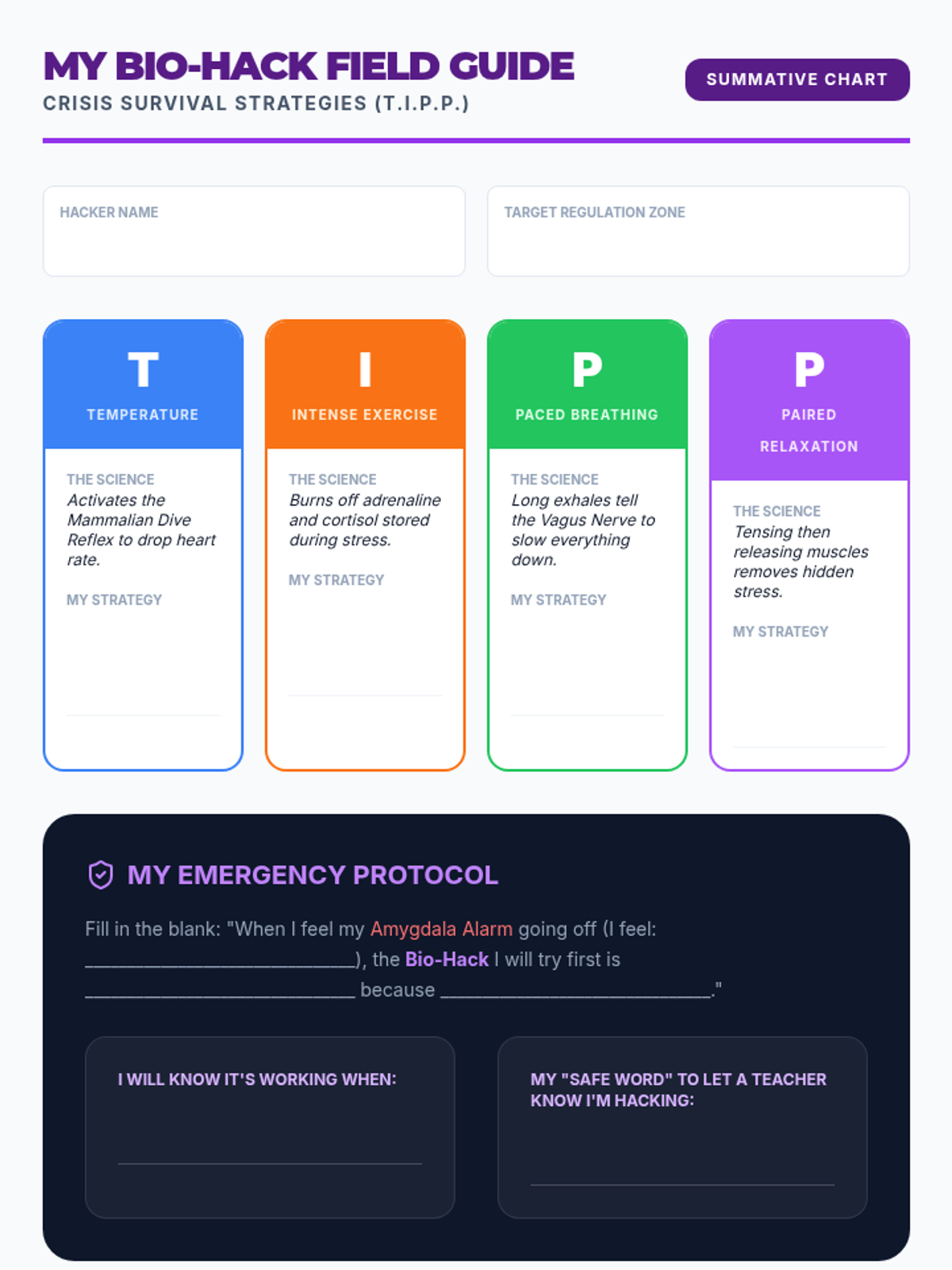 A 5-lesson unit for 7th graders exploring the physiological basis of the TIPP crisis survival skills. Students learn how to 'hack' their nervous system using temperature, exercise, breathing, and muscle relaxation to override the brain's stress response.
