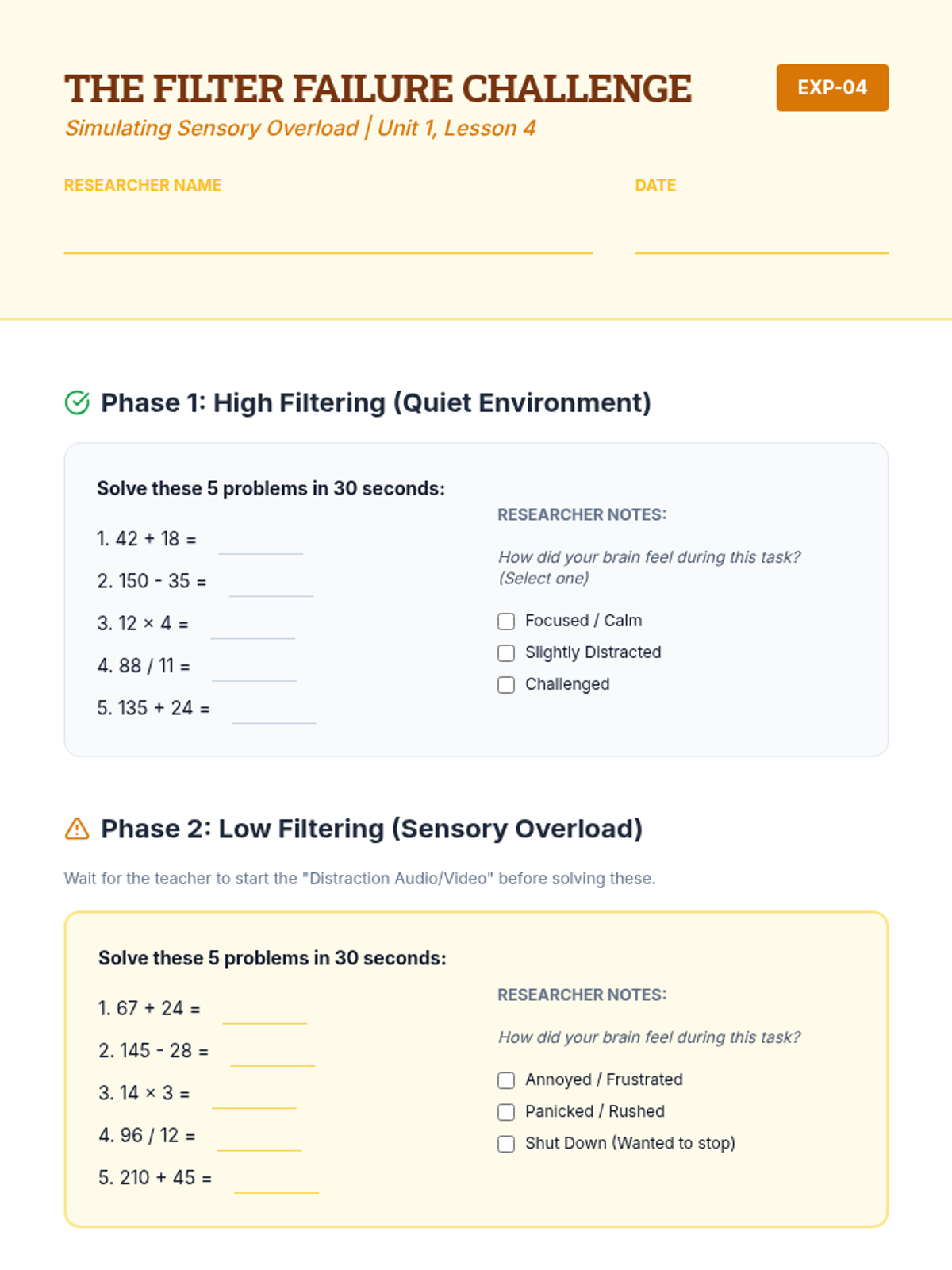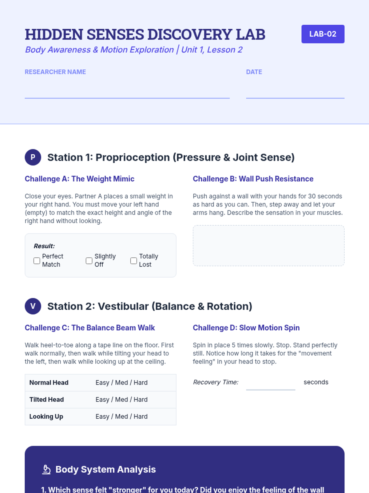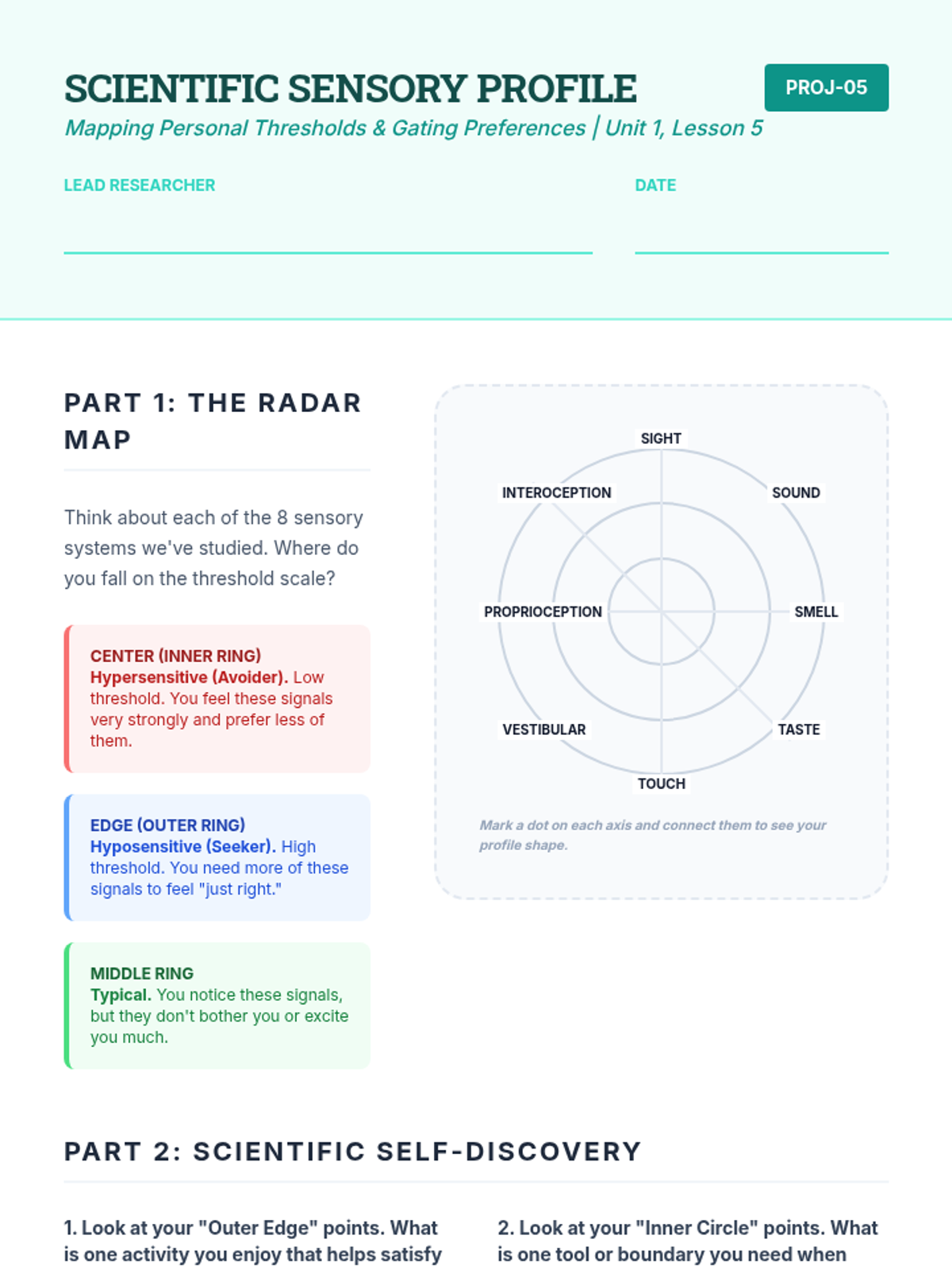 This sequence introduces students to the biological and neurological basis of sensory processing, expanding their understanding beyond the standard five senses to include the vestibular, proprioceptive, and interoceptive systems. Students participate in labs and simulations to isolate specific sensory inputs, learning how the brain filters and prioritizes information.