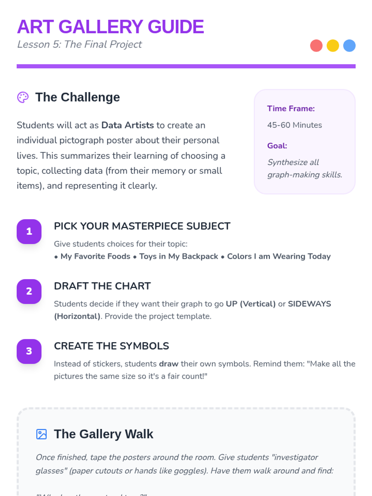 A Kindergarten math sequence introducing pictographs through surveys, vertical and horizontal construction, and data interpretation. Students move from whole-class voting to independent data art projects.