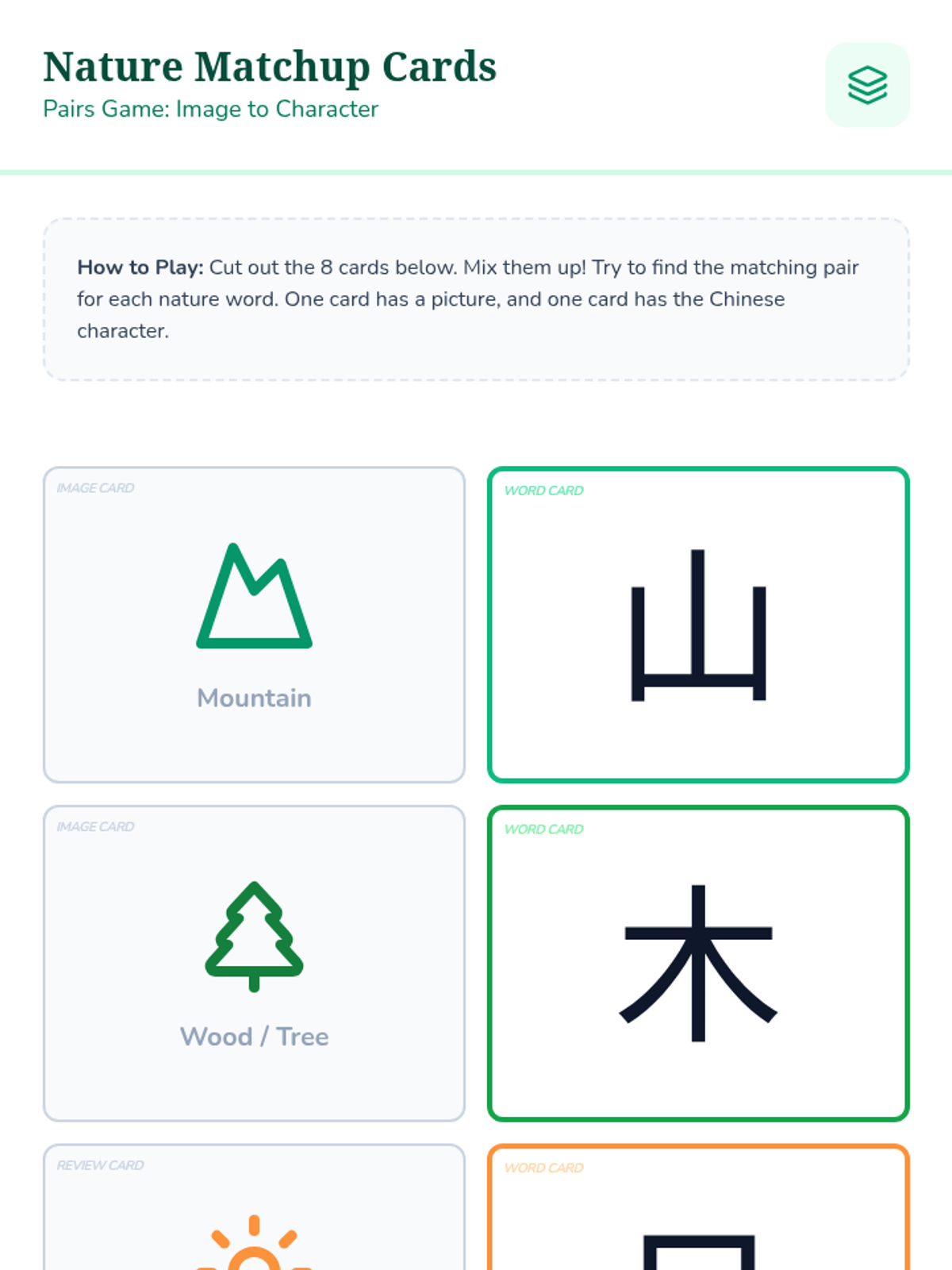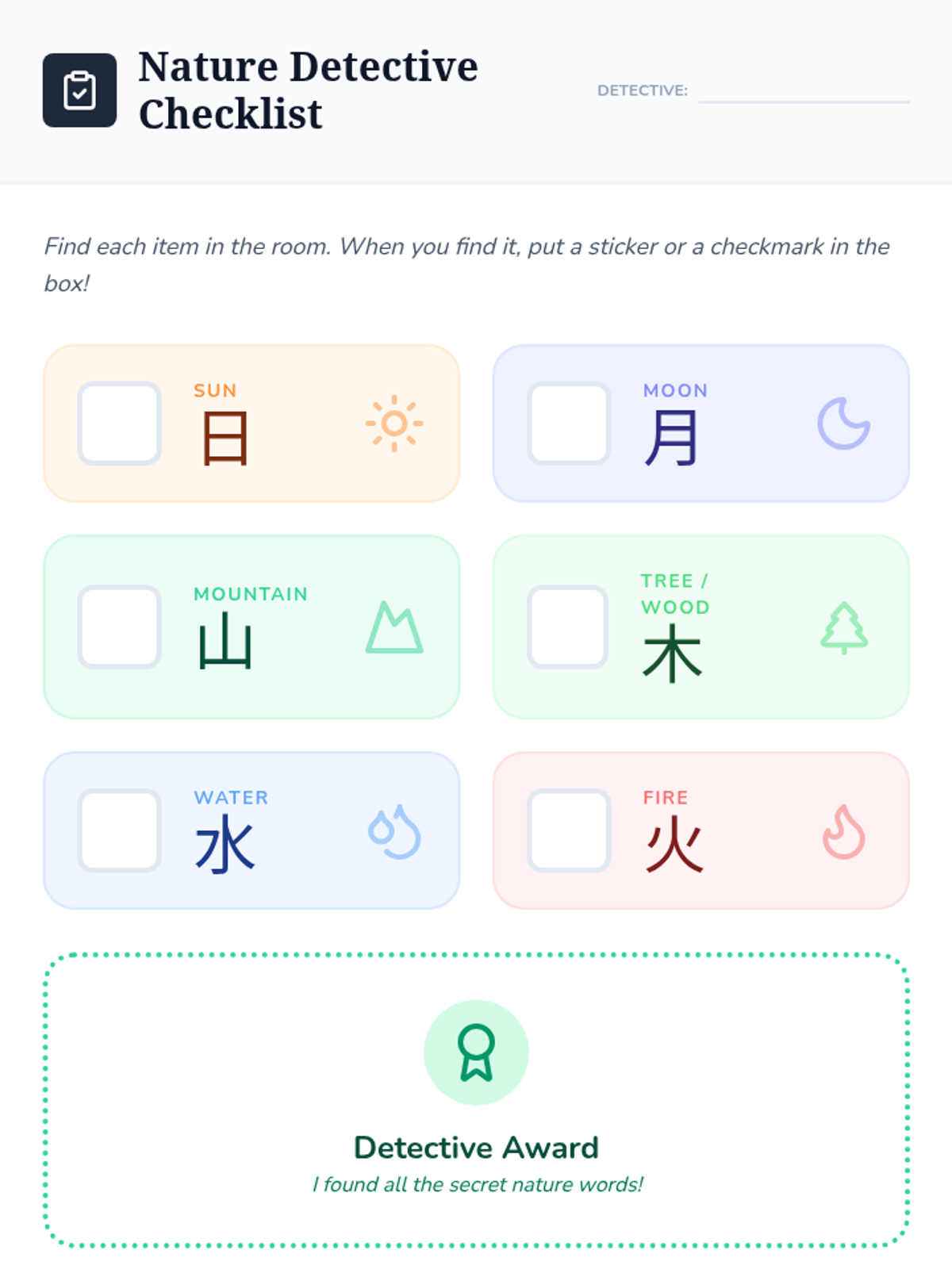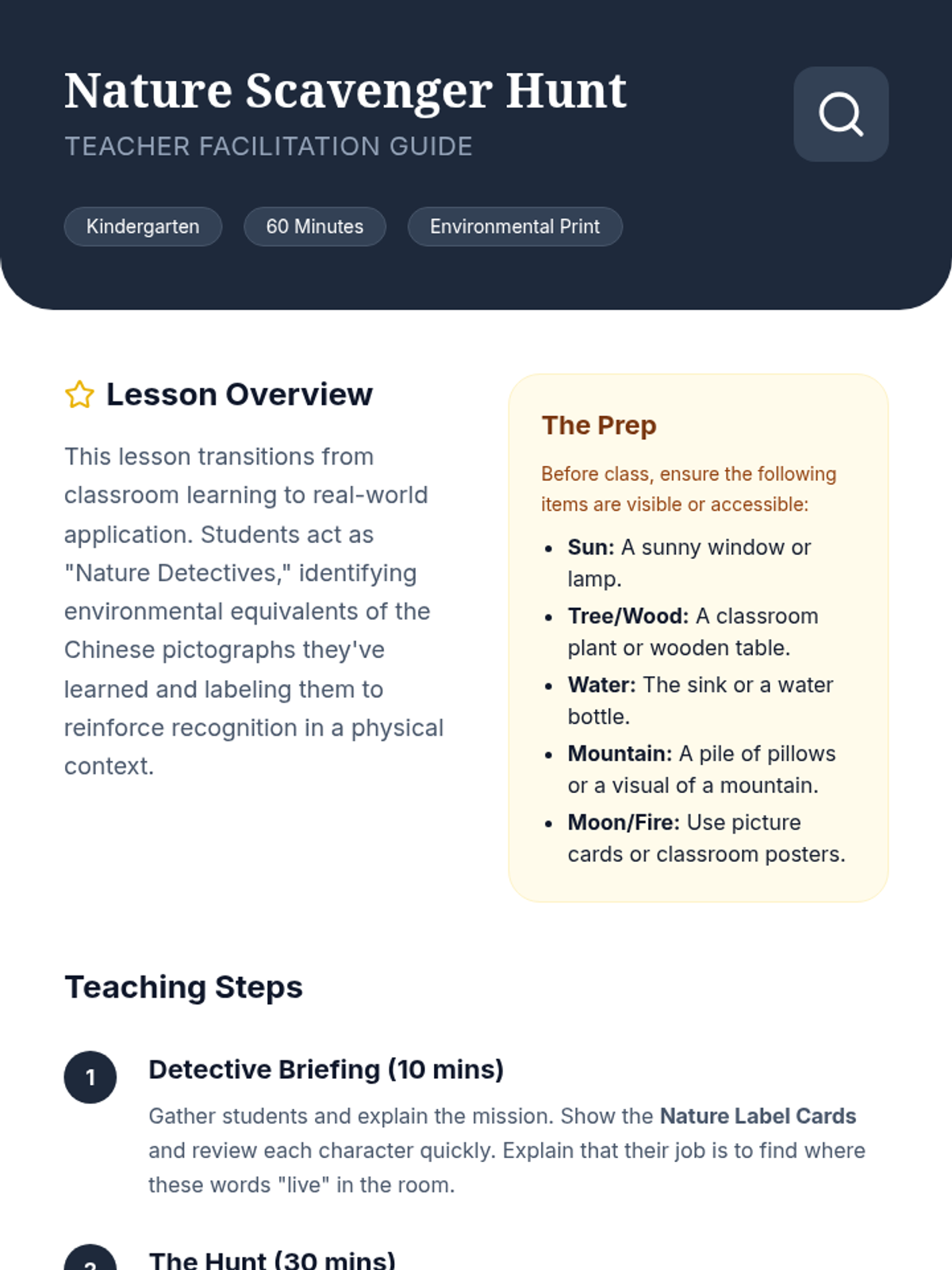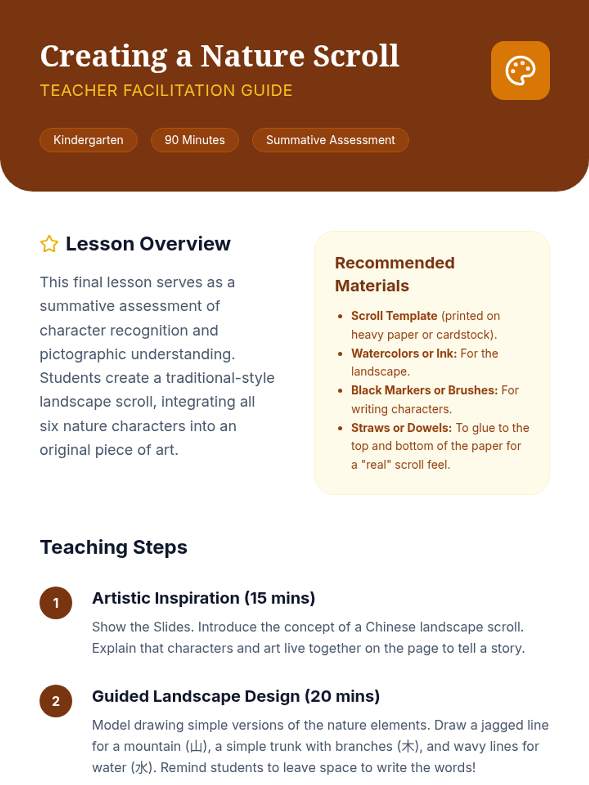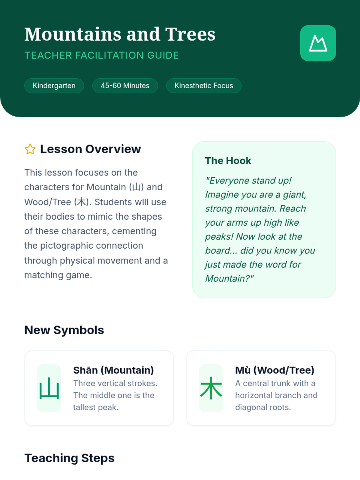 A Kindergarten sequence exploring the pictographic origins of Mandarin Chinese characters. Students learn to connect natural elements like the sun, moon, mountains, and water to their written symbols through art, movement, and observation.