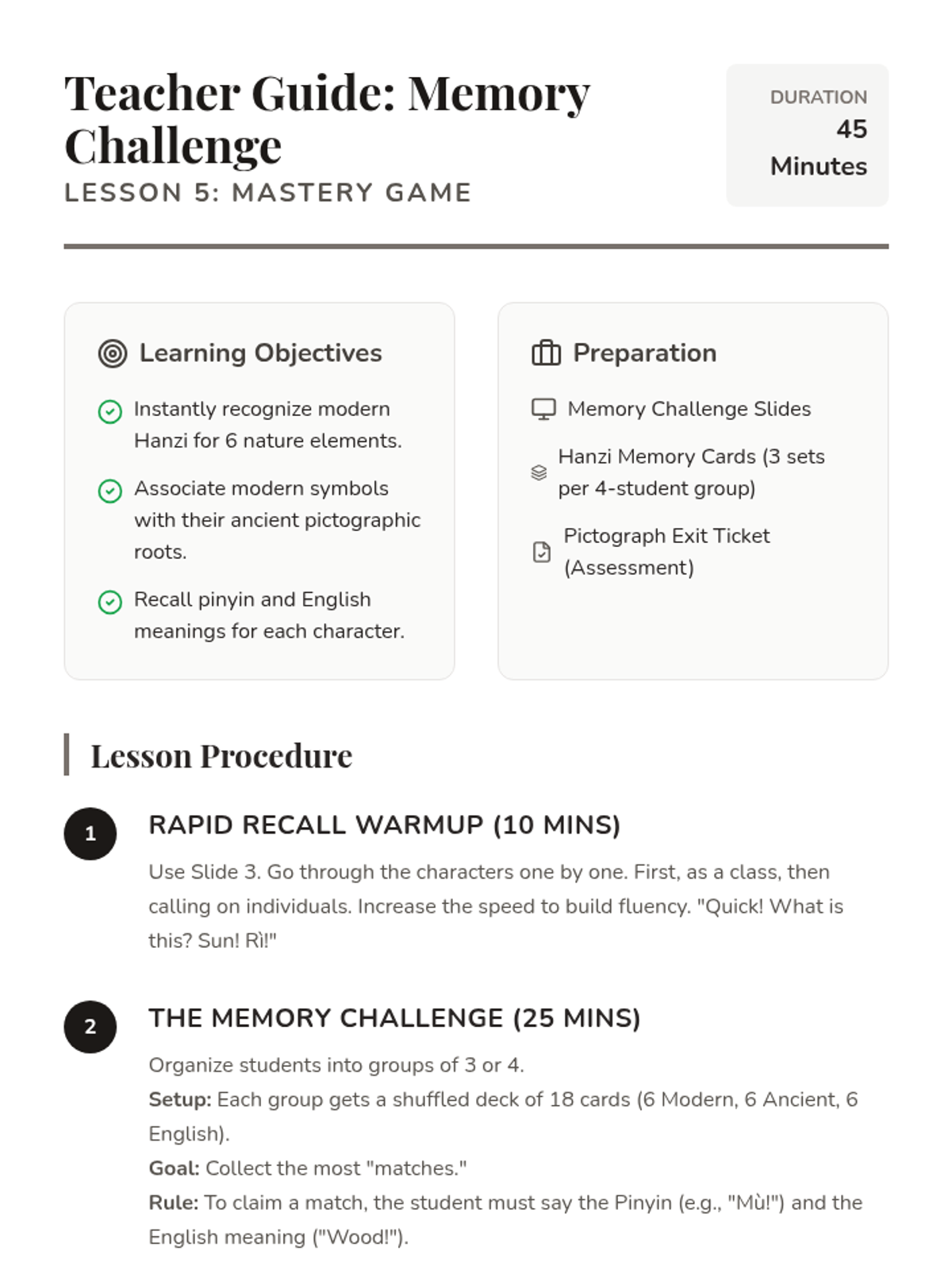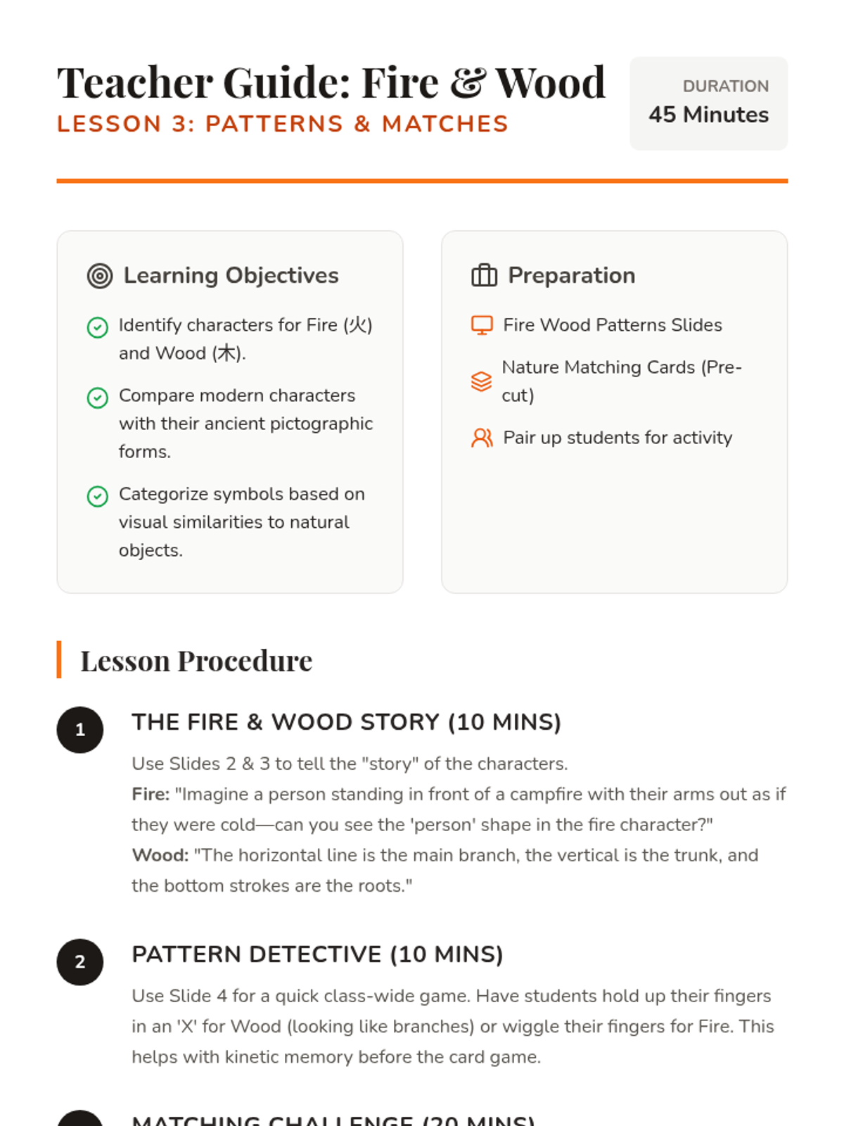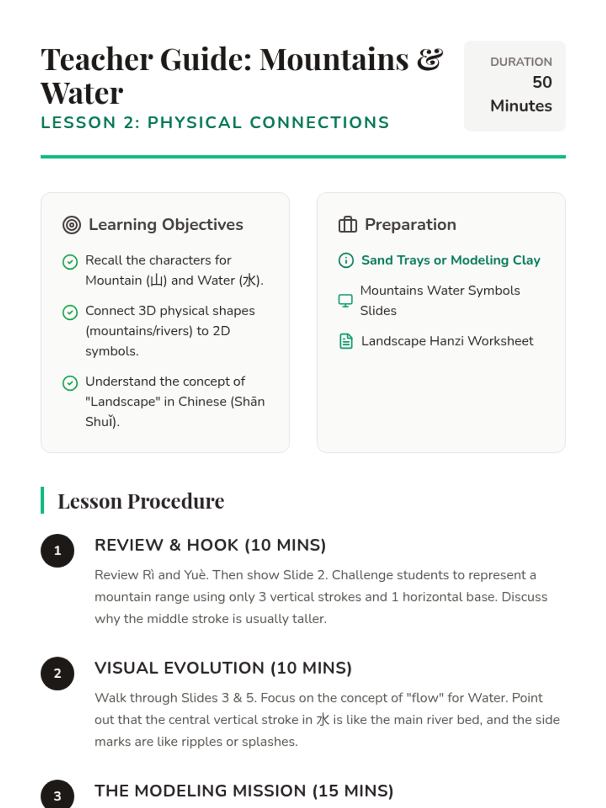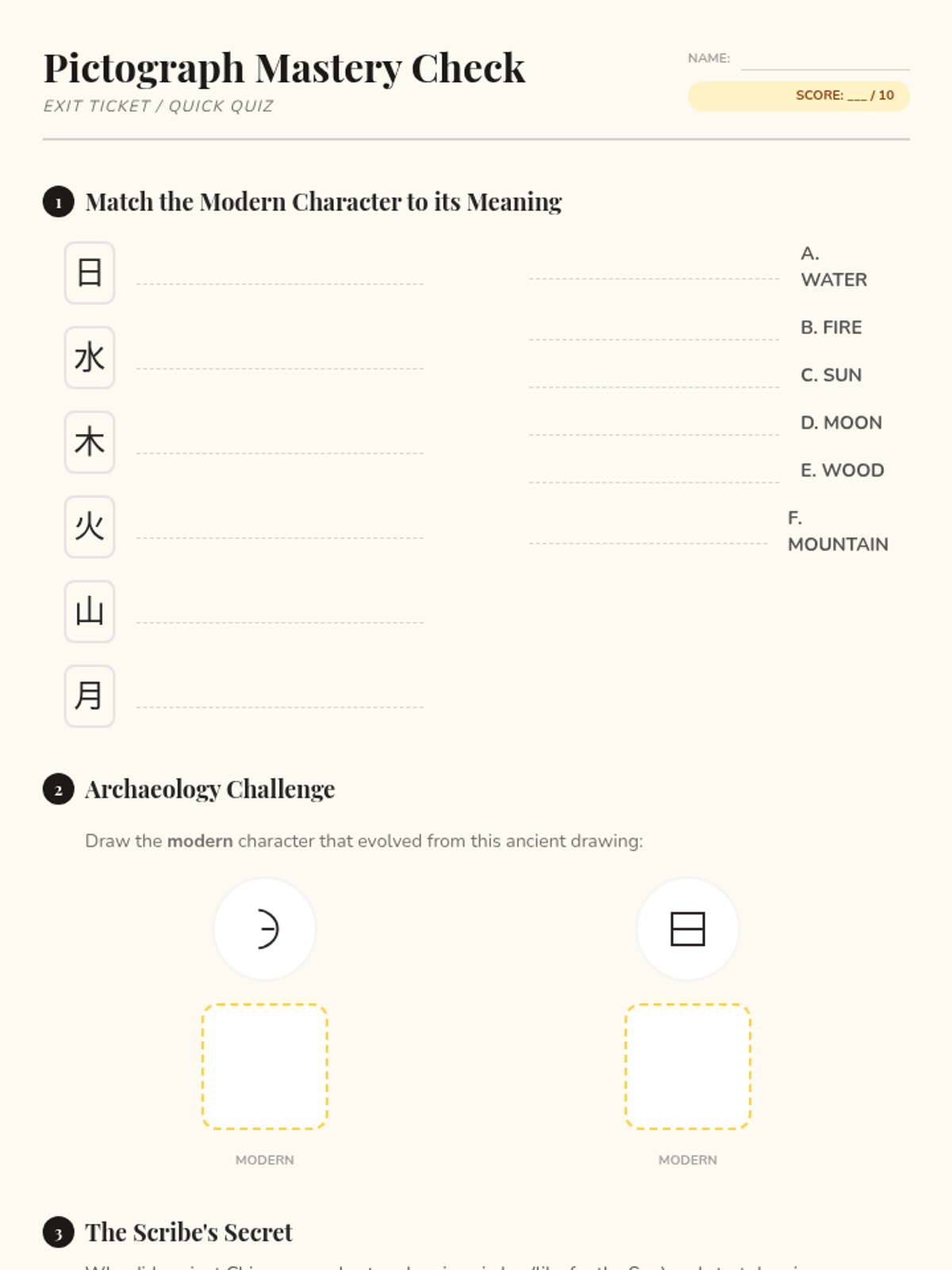 Students explore the historical evolution of Chinese characters from ancient pictures to modern forms. This inquiry-based sequence focuses on high-frequency nouns related to nature (sun, moon, water, mountain, fire) through the lens of visual archaeology.