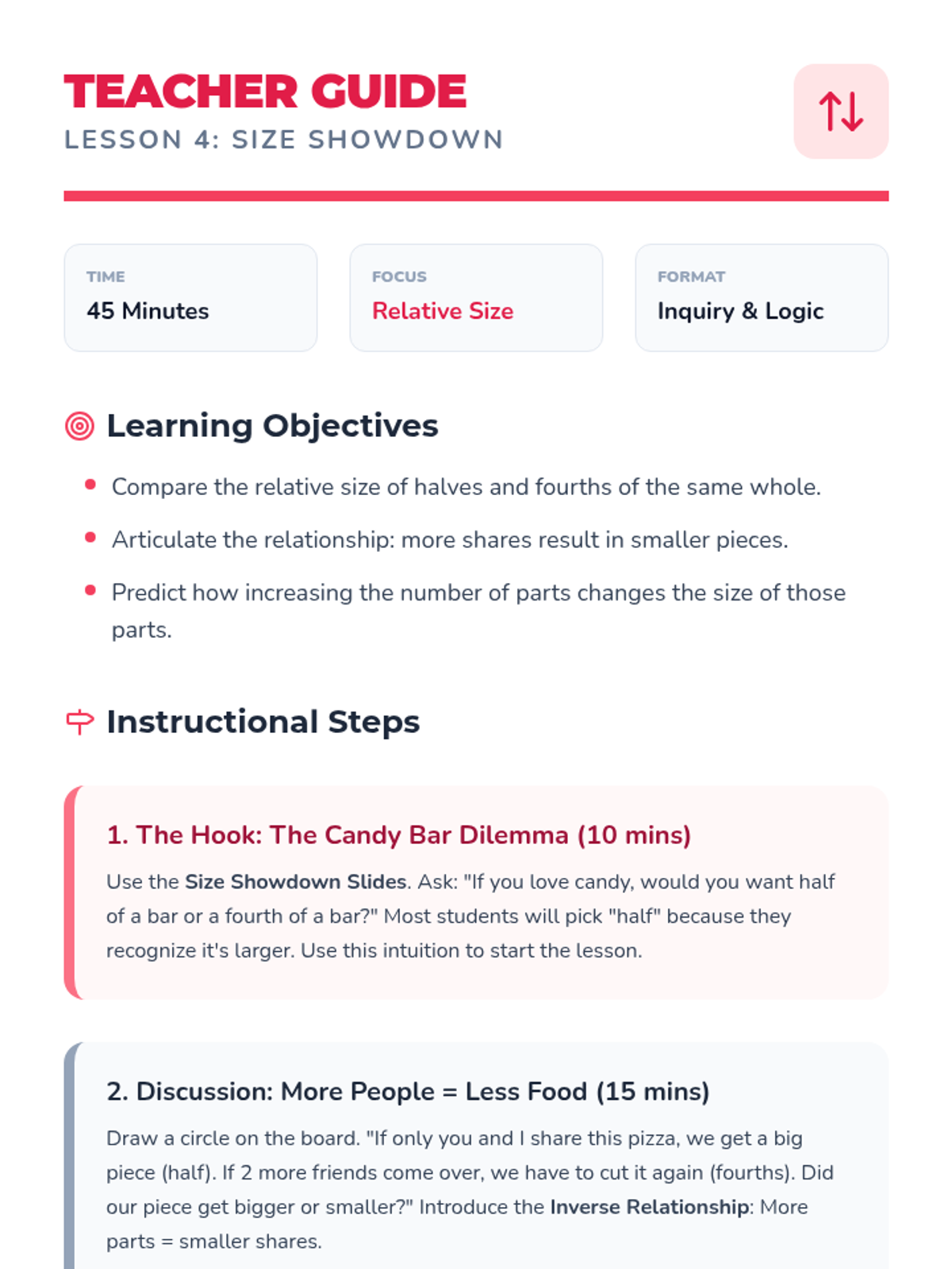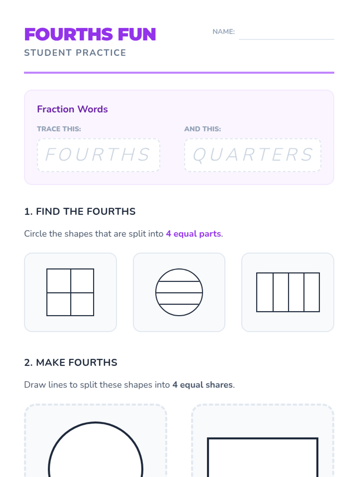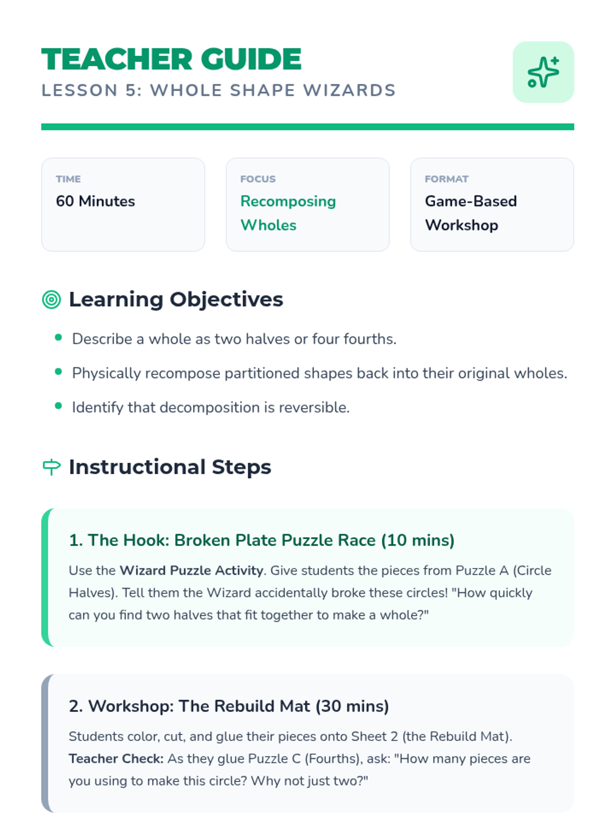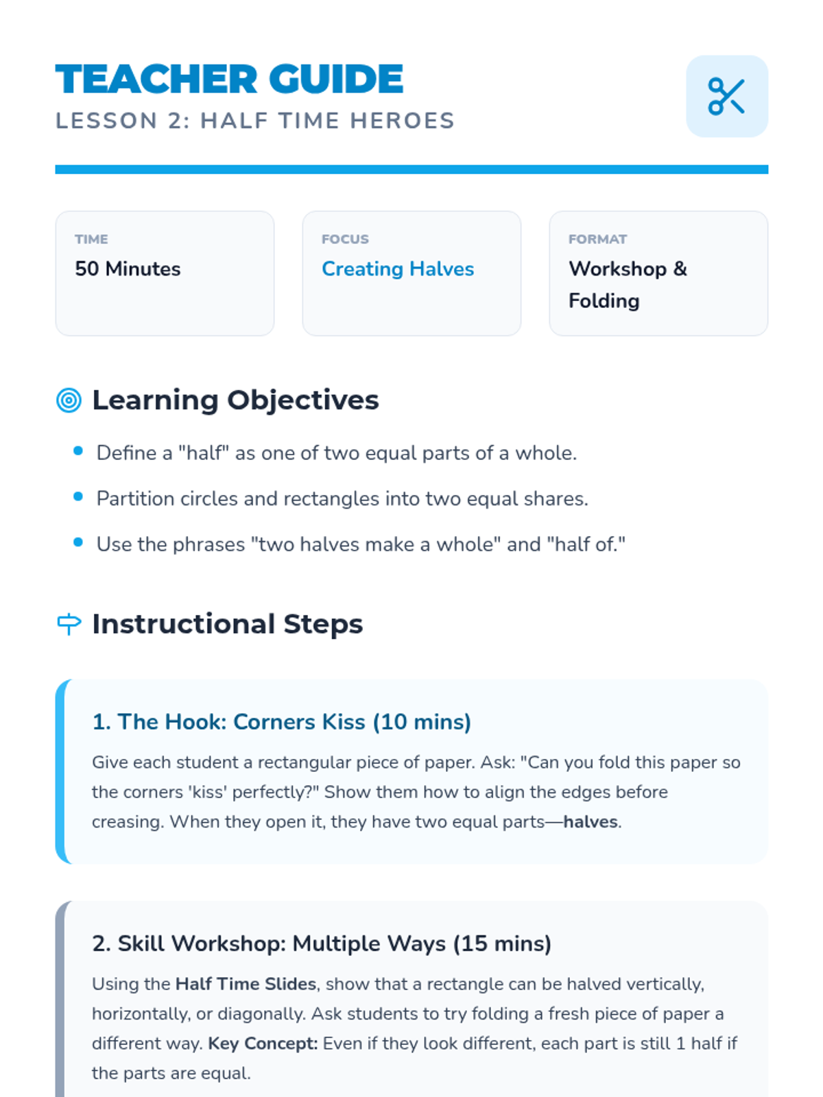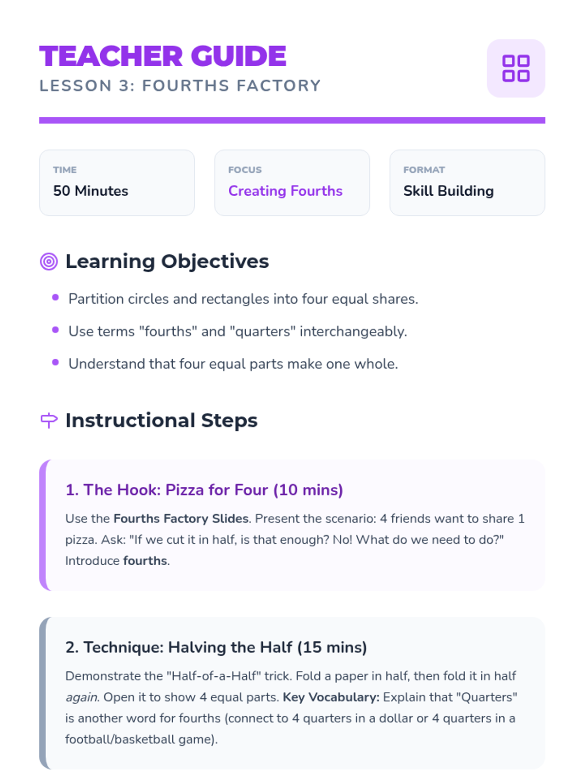 A Tier 2 intervention sequence for Grade 1 students focusing on partitioning circles and rectangles into halves and fourths using a concrete folding approach. Includes instructional slides, teacher guidance, printable manipulatives, and progress monitoring.