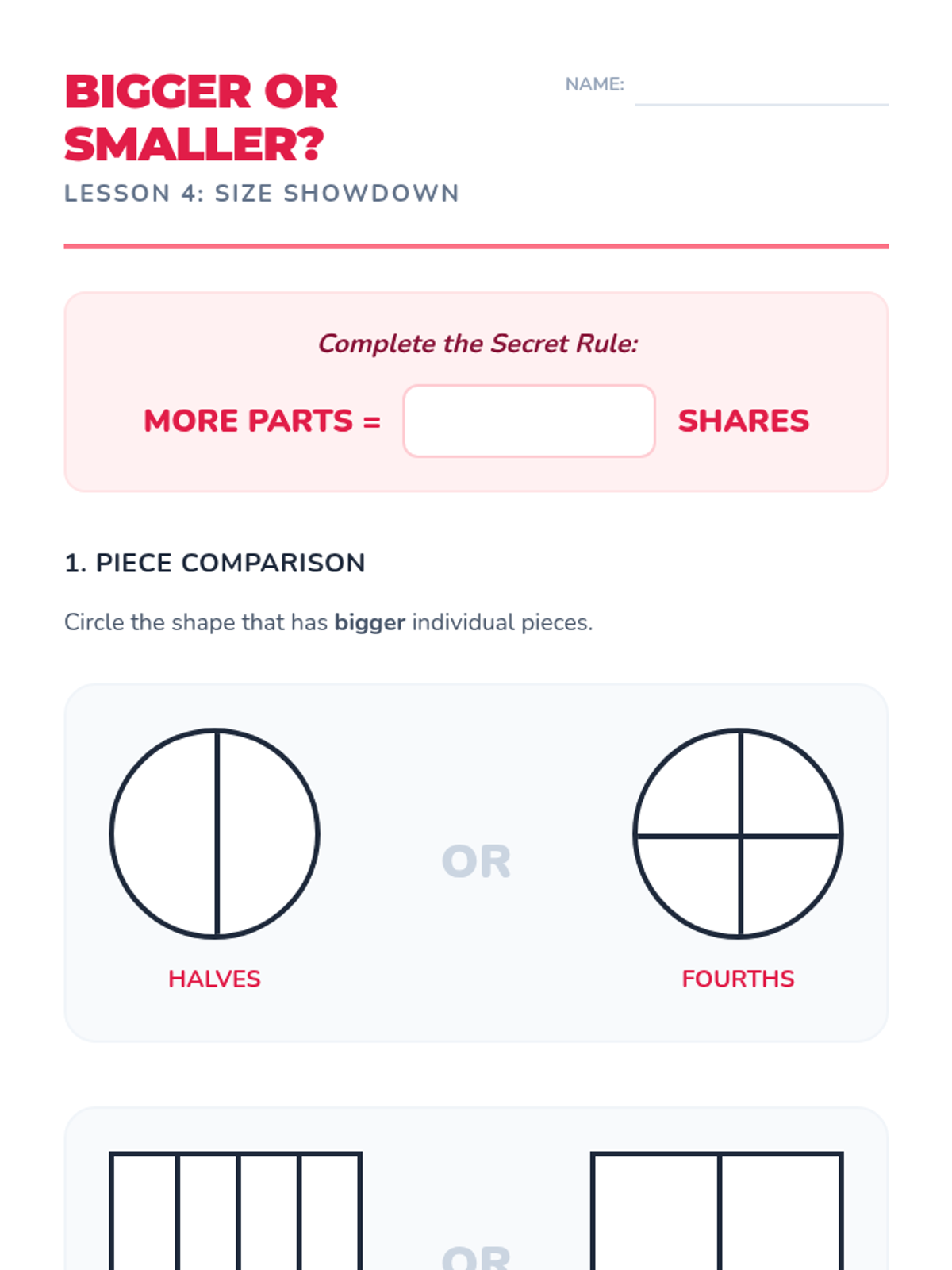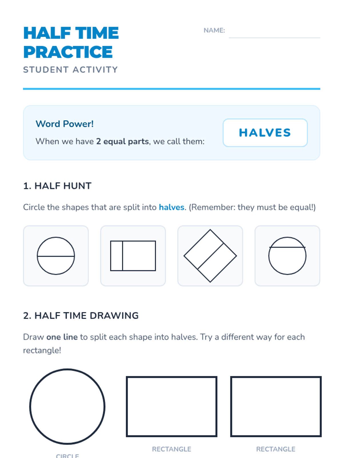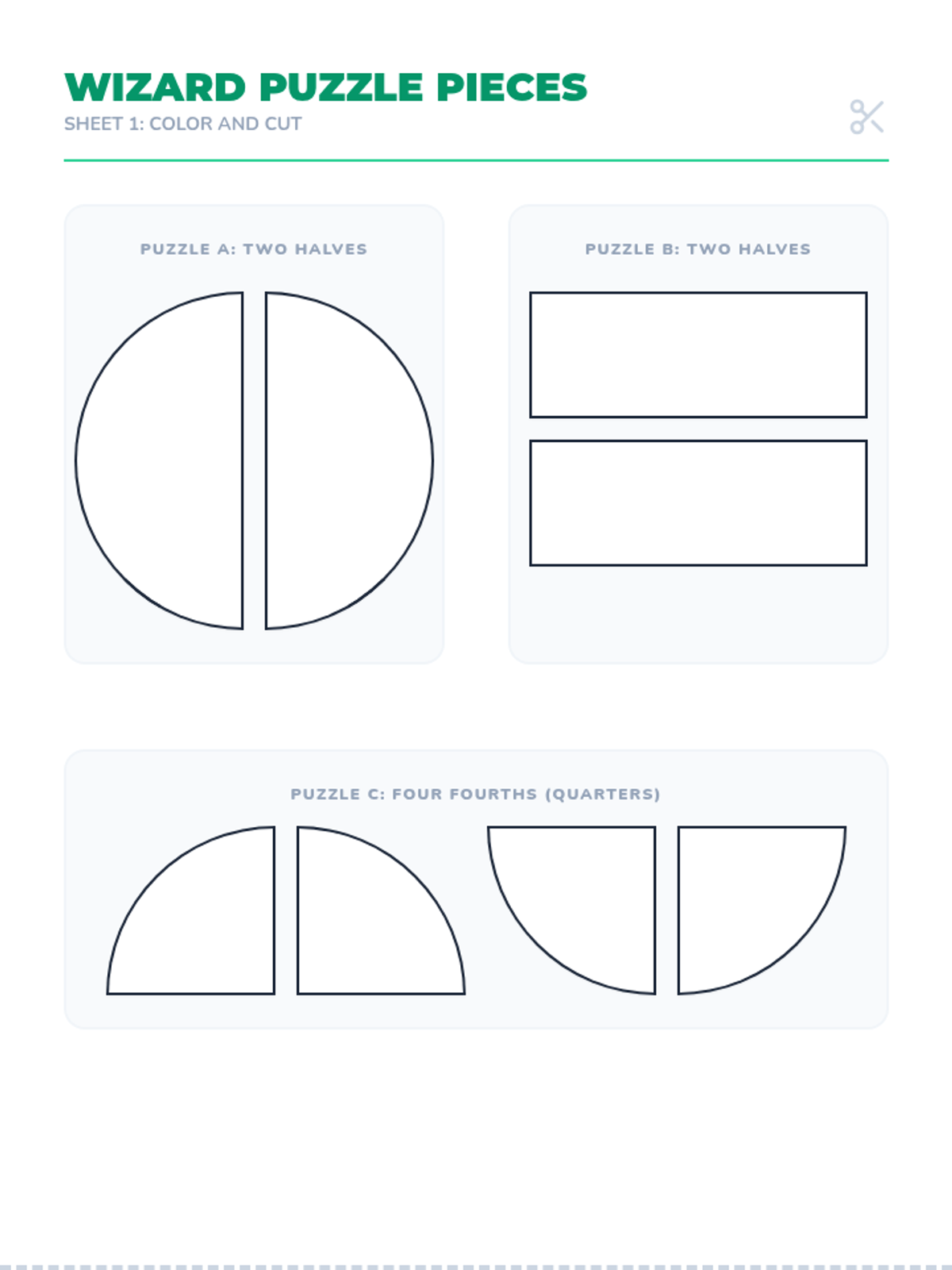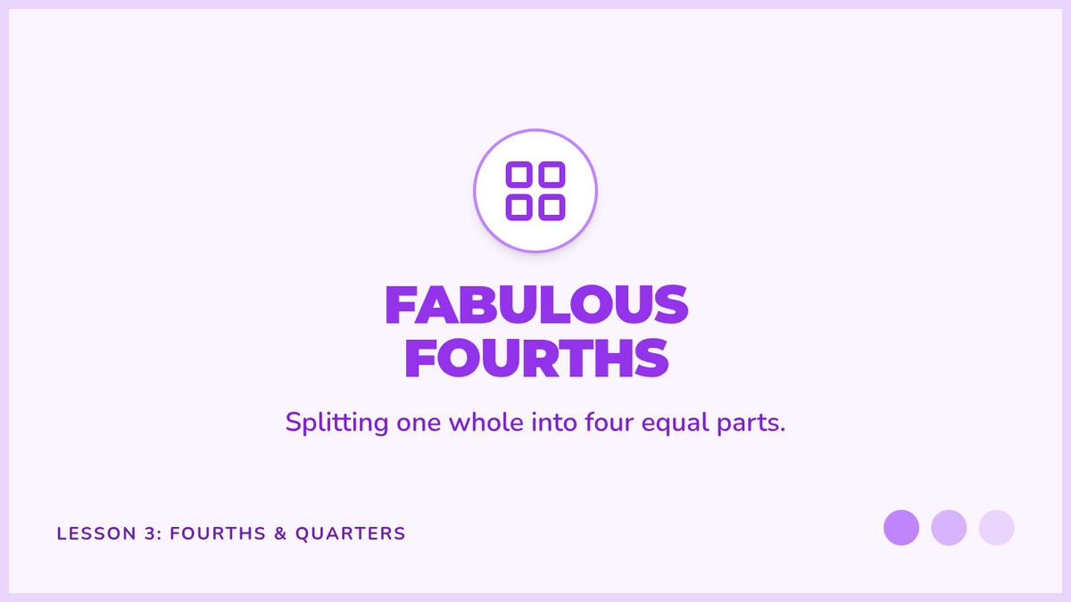 A 1st-grade geometry sequence introducing partitioning circles and rectangles into halves and fourths. Students explore equal shares, learn foundational fraction vocabulary, and understand the relationship between the number of parts and their size.