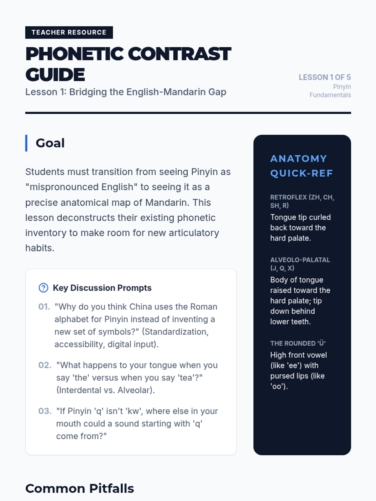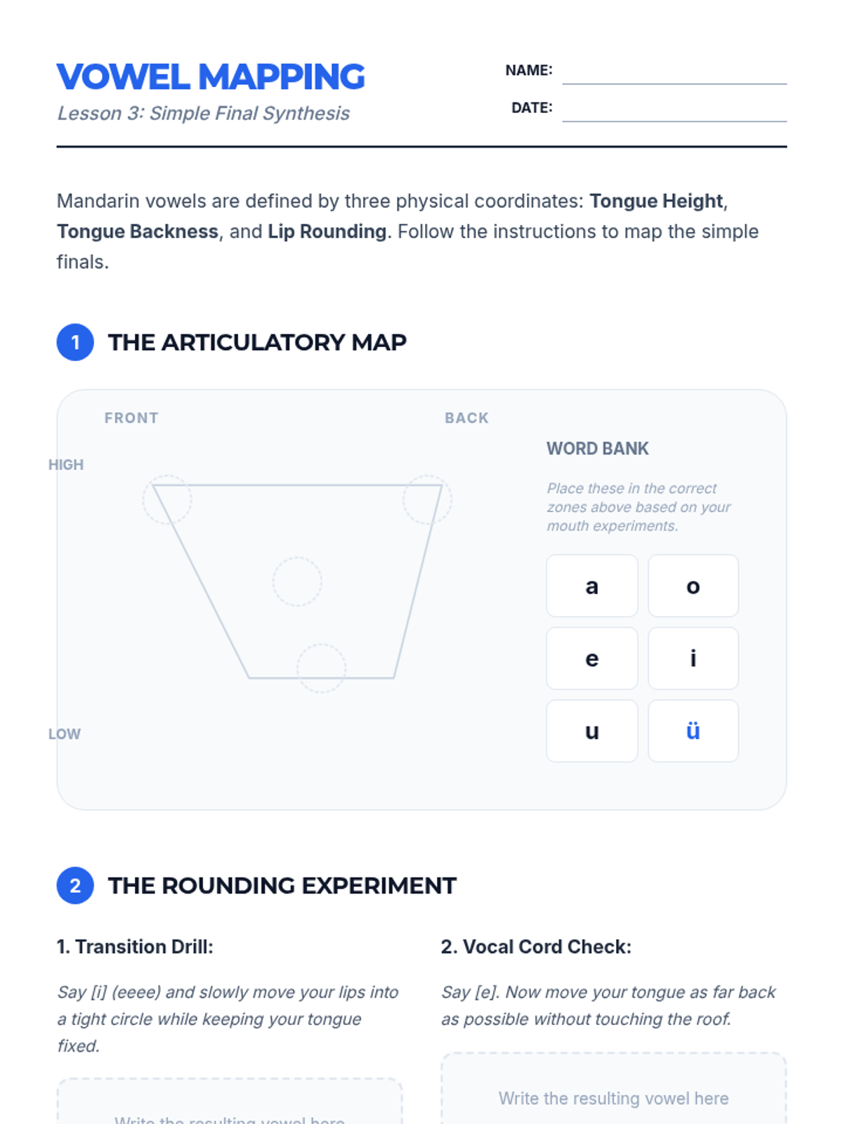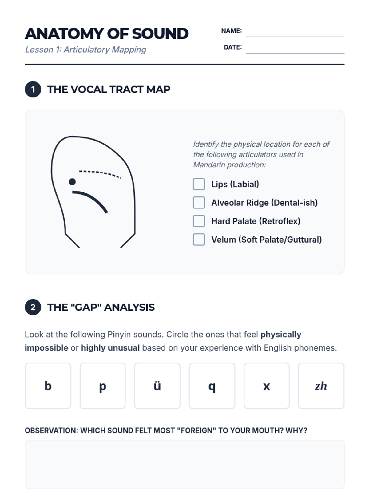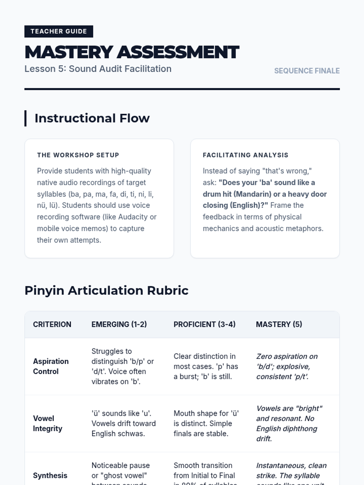 This sequence introduces 11th-grade students to the anatomical and linguistic foundations of Mandarin Pinyin. Students explore articulatory phonetics, aspiration control, and vowel mapping to build a scientific understanding of how Mandarin sounds are produced and combined.