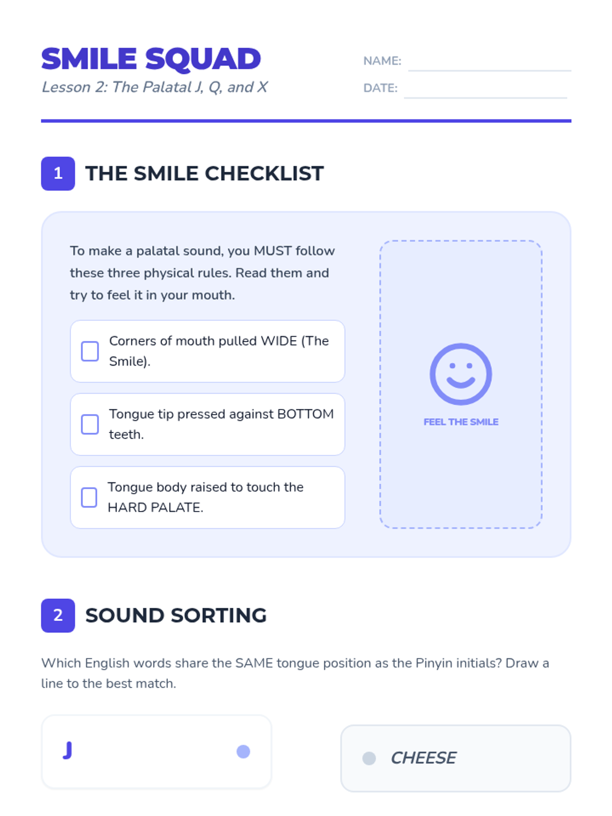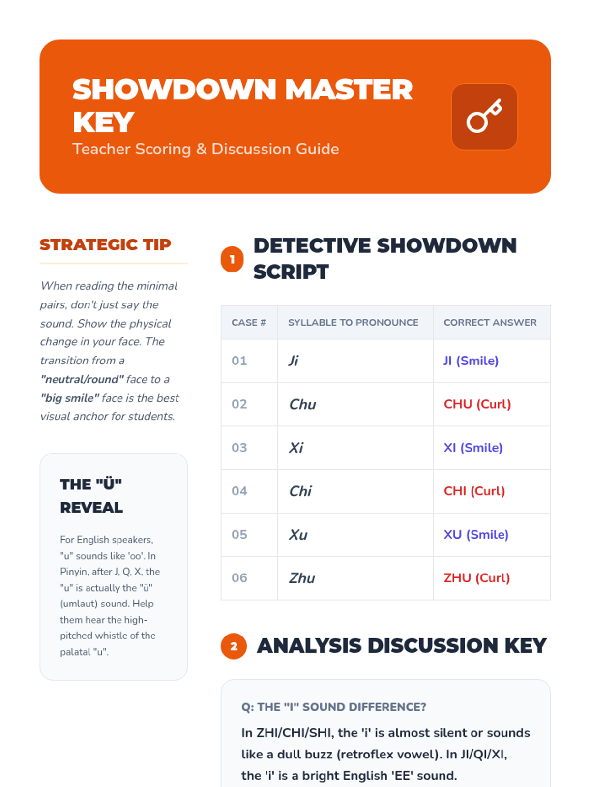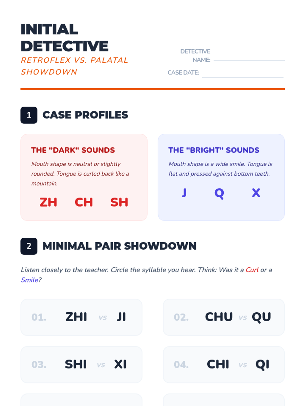 This sequence targets the most difficult consonants for English speakers learning Mandarin: the retroflex sounds (zh, ch, sh, r) and the palatal sounds (j, q, x). Using an inquiry and game-based approach, students investigate tongue placement and air flow to differentiate these similar-sounding initials, moving from physical articulation to auditory discrimination.