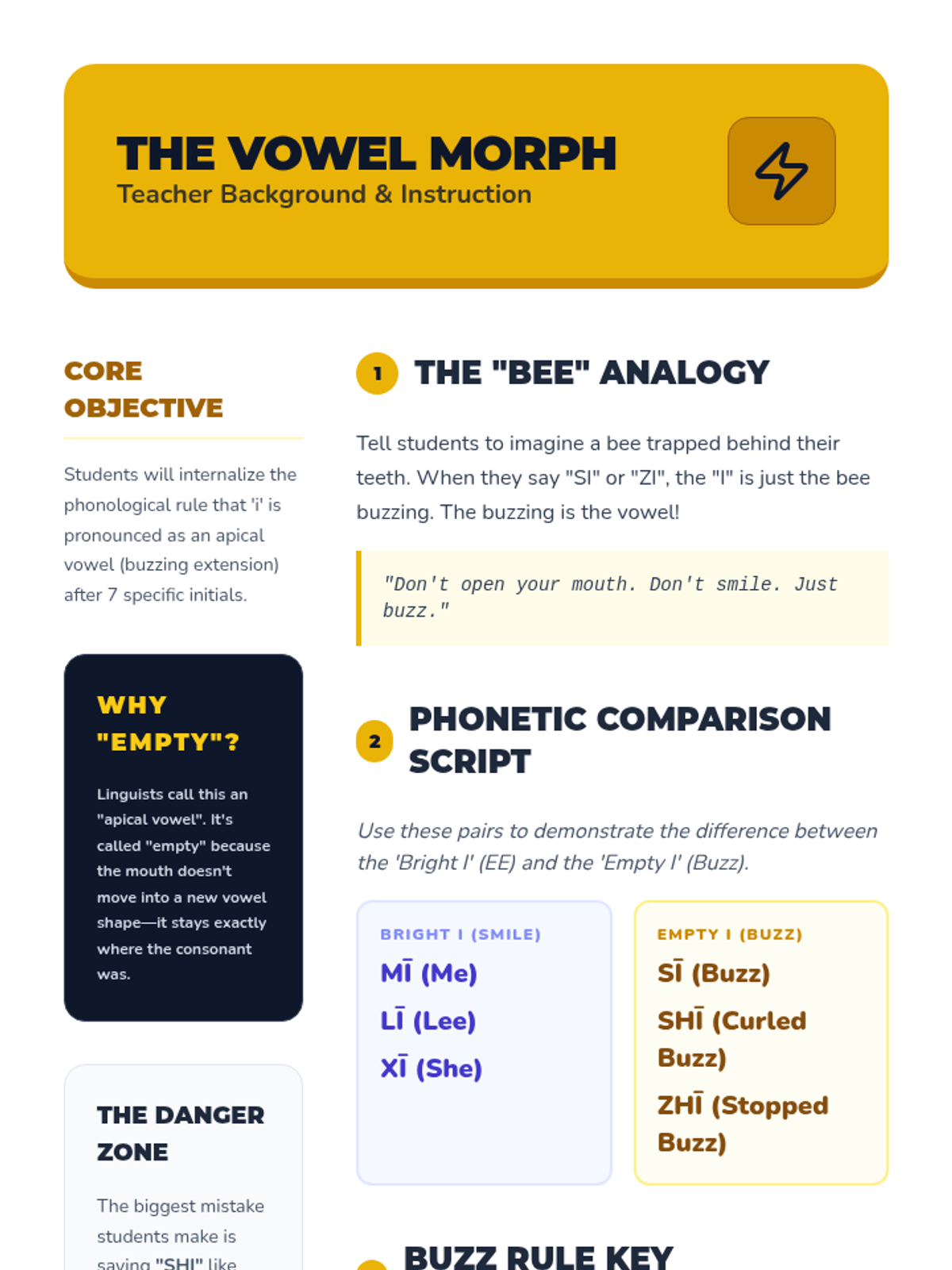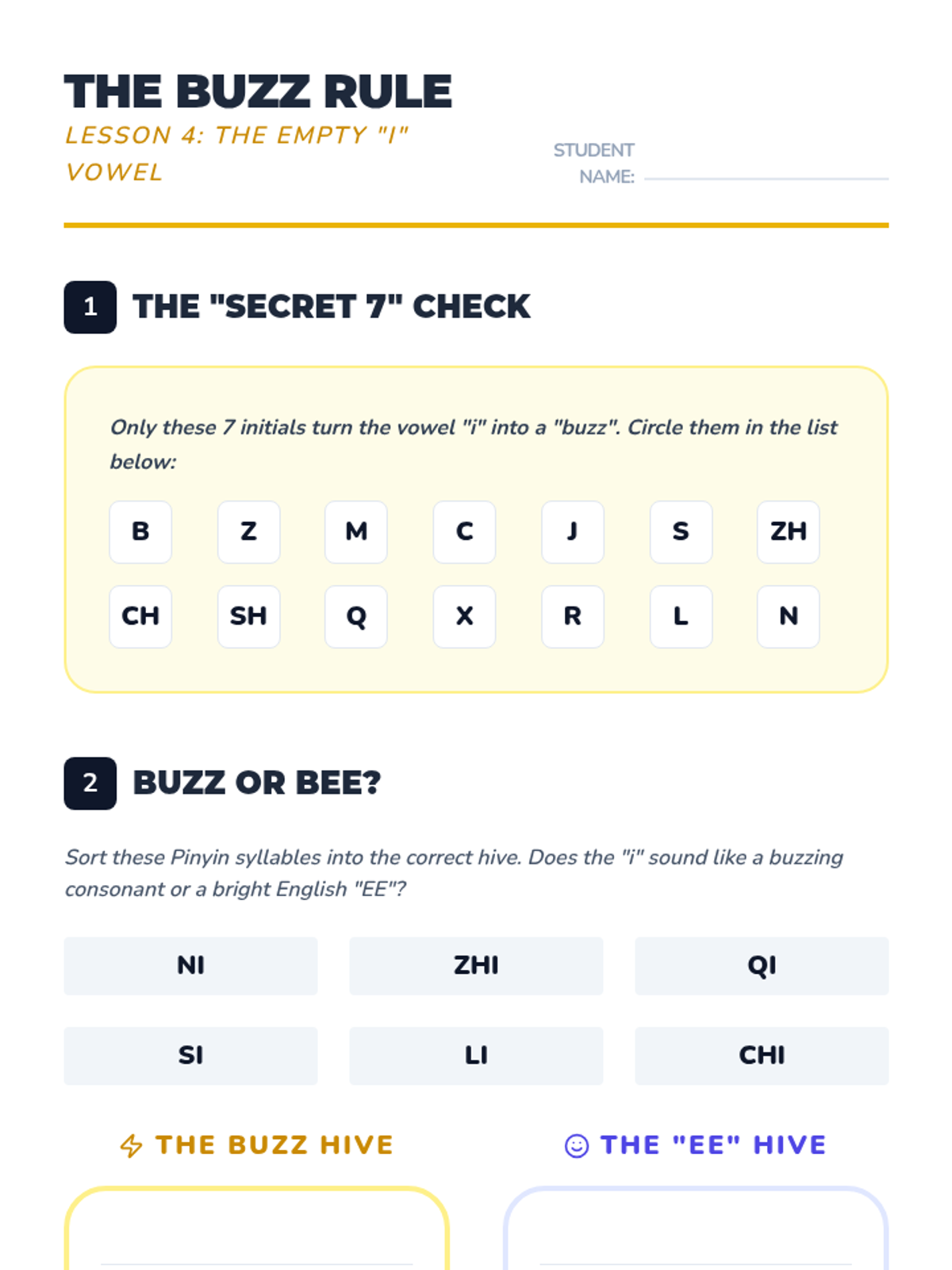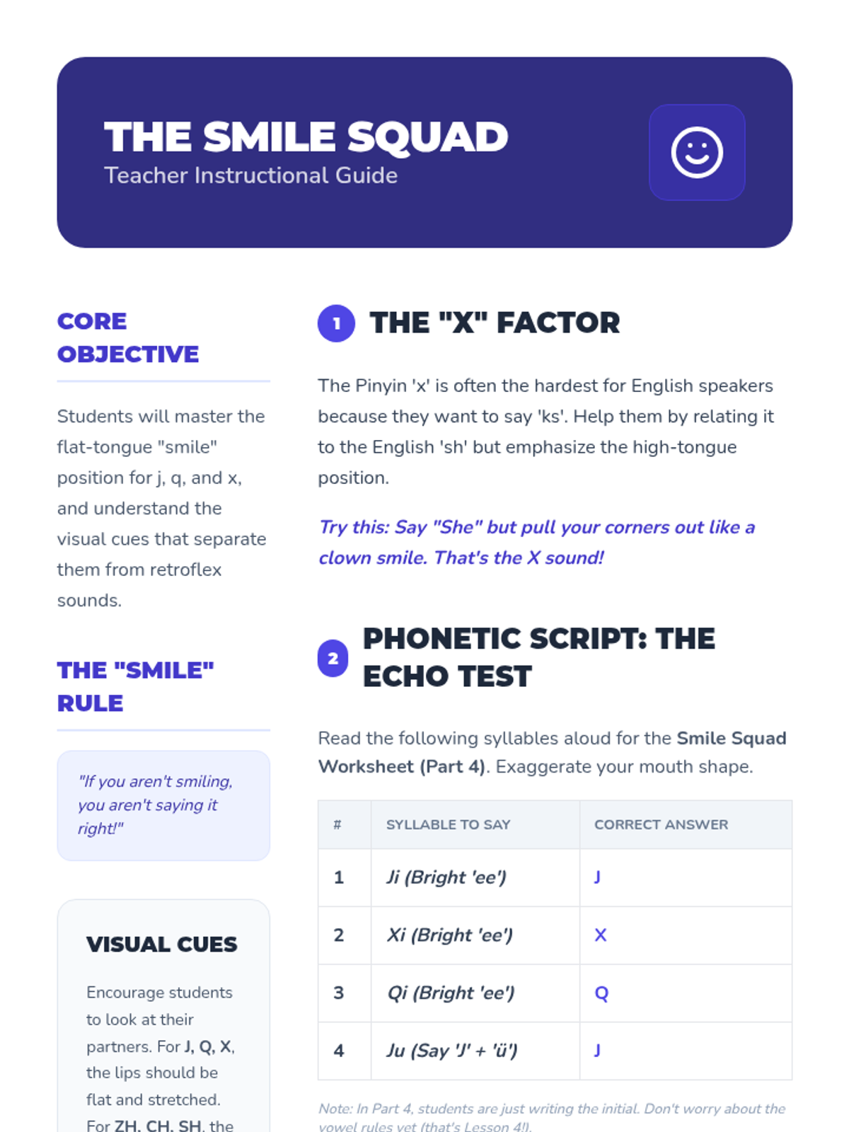 This sequence targets the most difficult consonants for English speakers learning Mandarin: the retroflex sounds (zh, ch, sh, r) and the palatal sounds (j, q, x). Using an inquiry and game-based approach, students investigate tongue placement and air flow to differentiate these similar-sounding initials, moving from physical articulation to auditory discrimination.