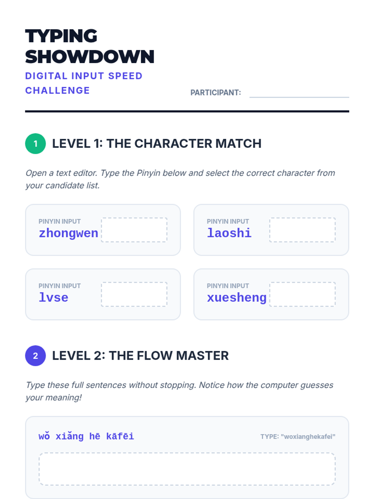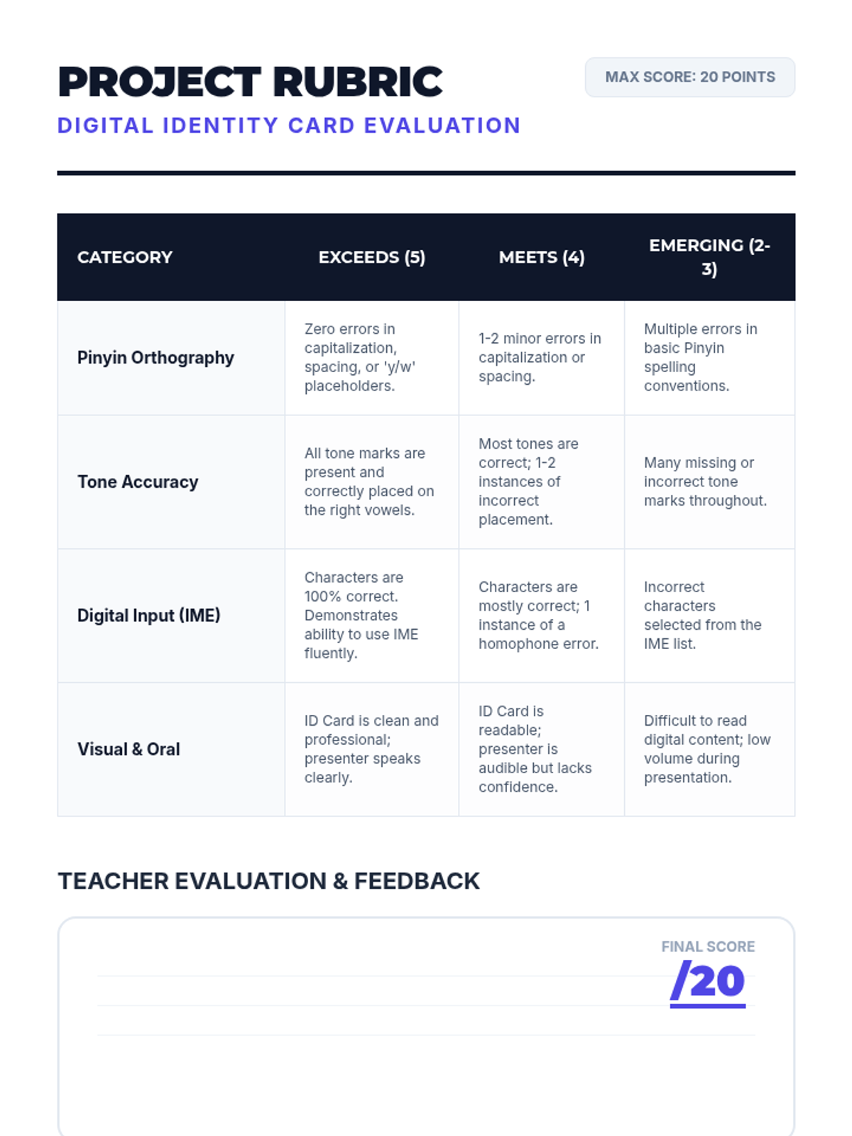 A comprehensive sequence for 6th-grade students to master Pinyin orthography, digital typing input methods, and real-world transcription. Students progress from learning spelling rules to creating a digital identity using Mandarin input tools.