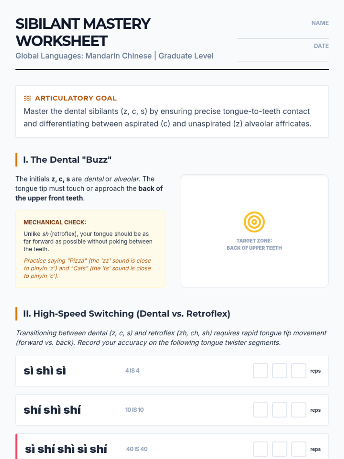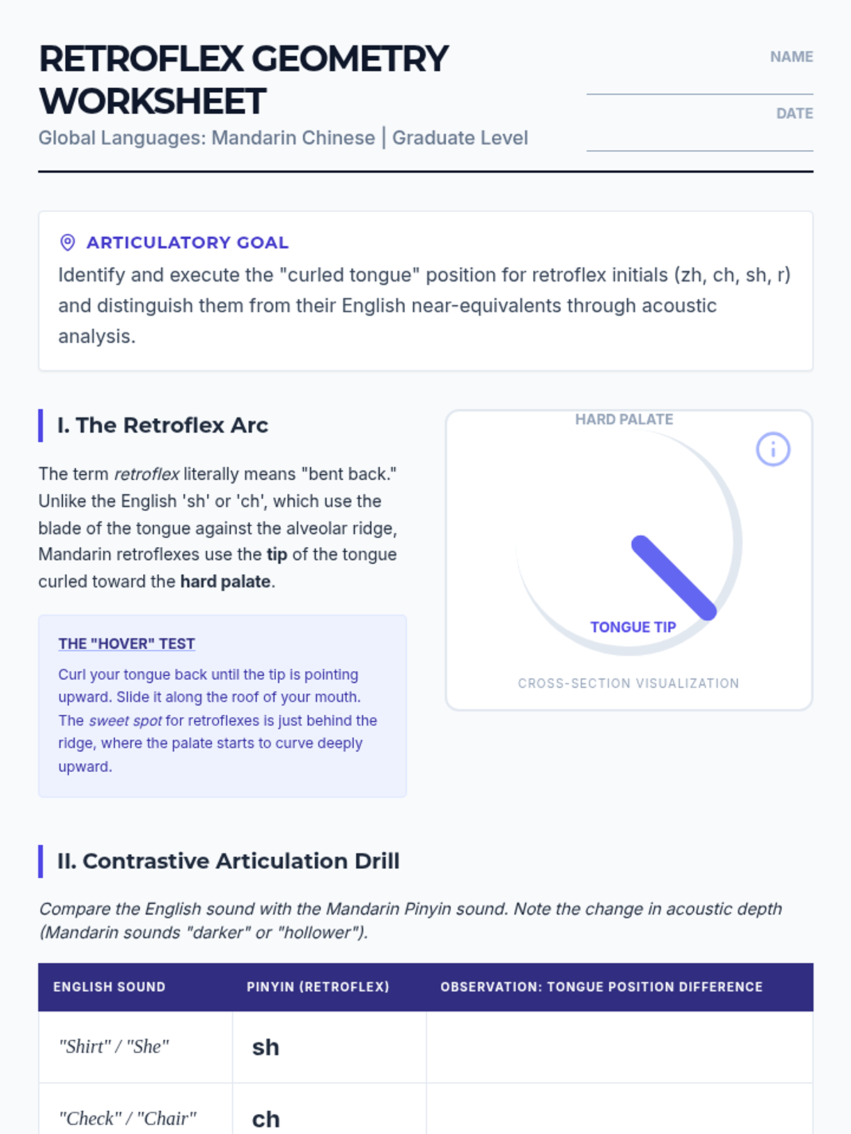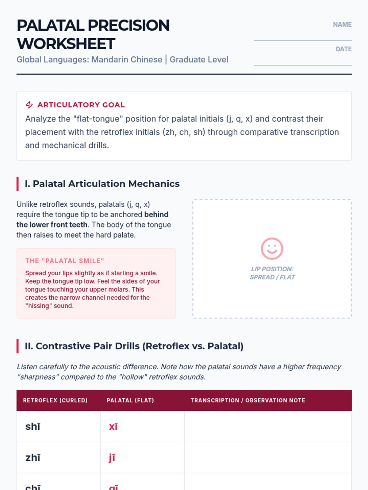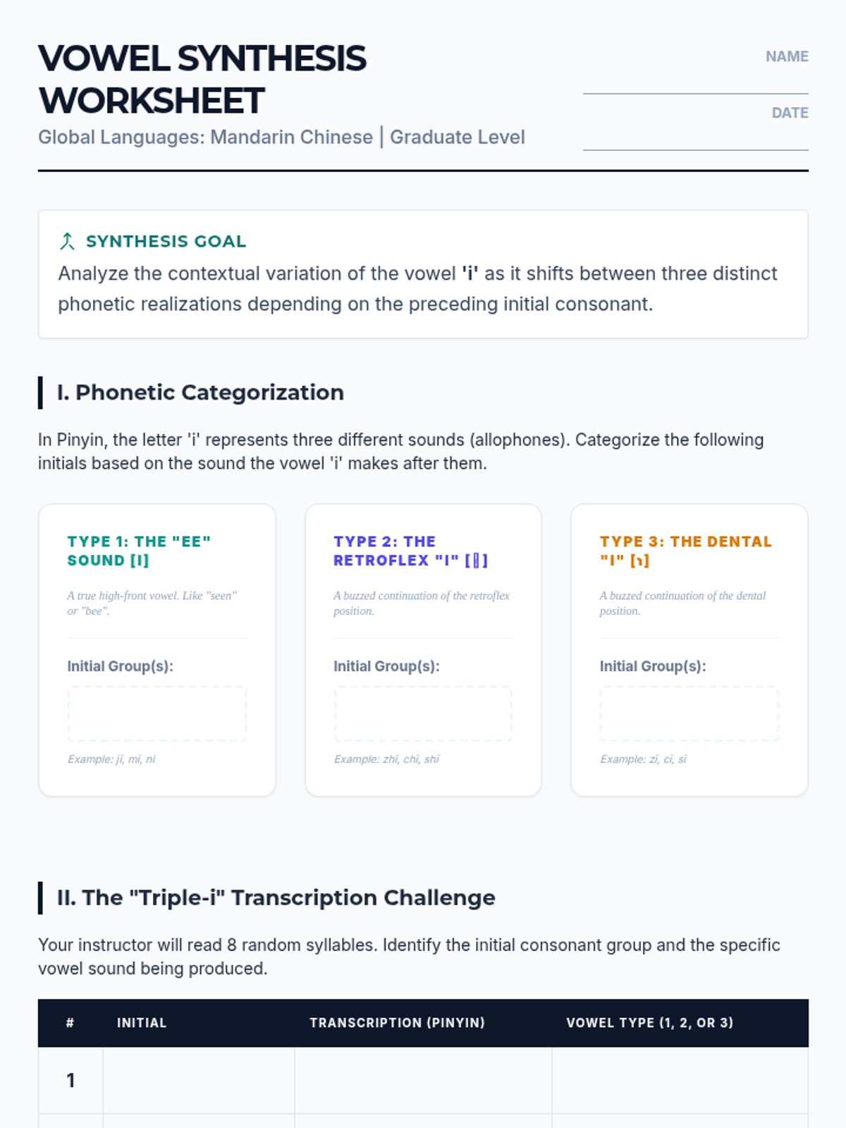 An intensive linguistic approach to Mandarin Pinyin for graduate students, focusing on the phonetics of aspiration, tongue placement (retroflex vs. palatal), and the contextual variation of the 'i' vowel. Students move from mechanical breath control to precise articulatory geometry.