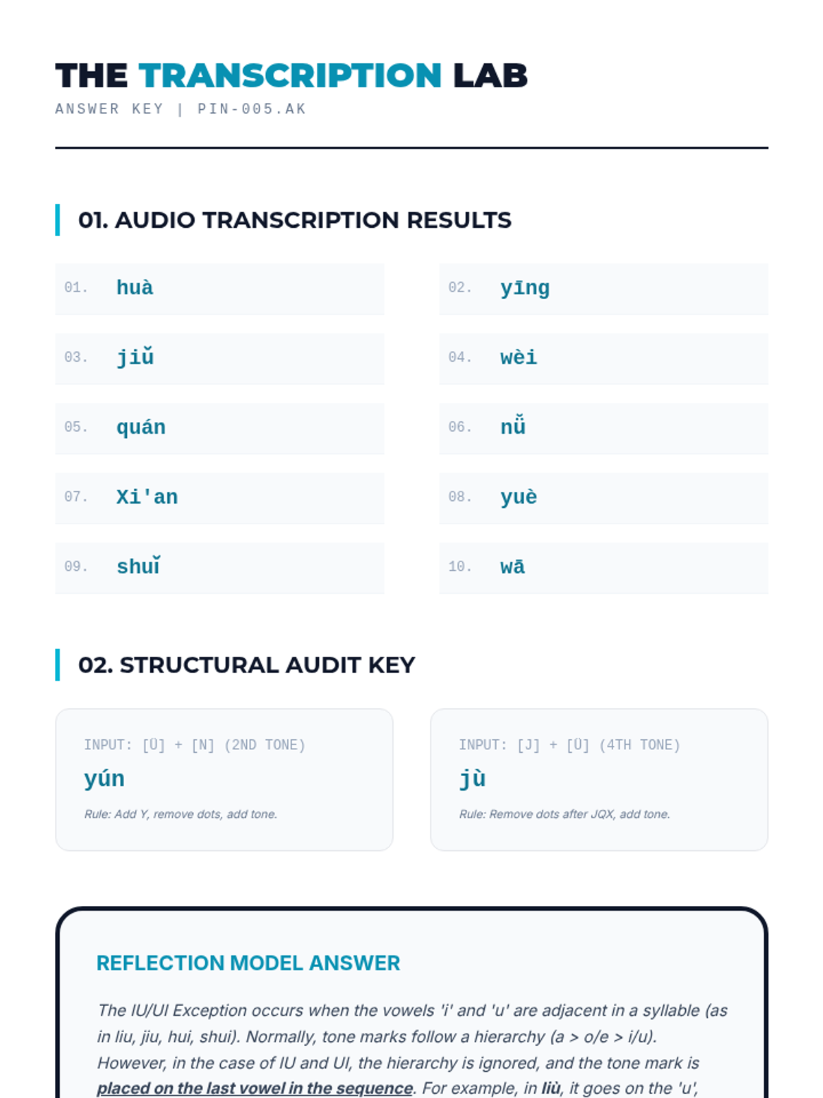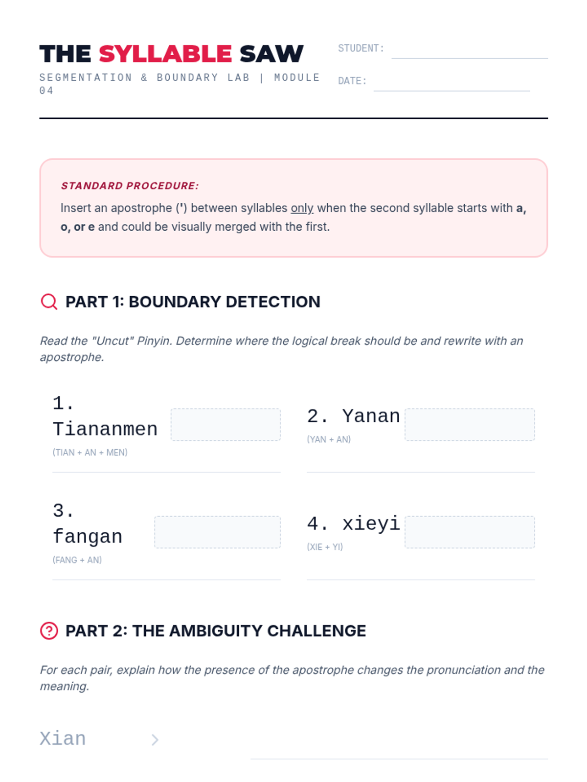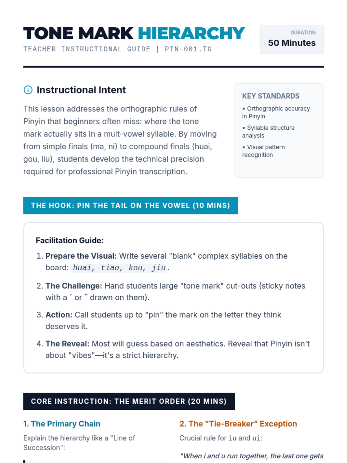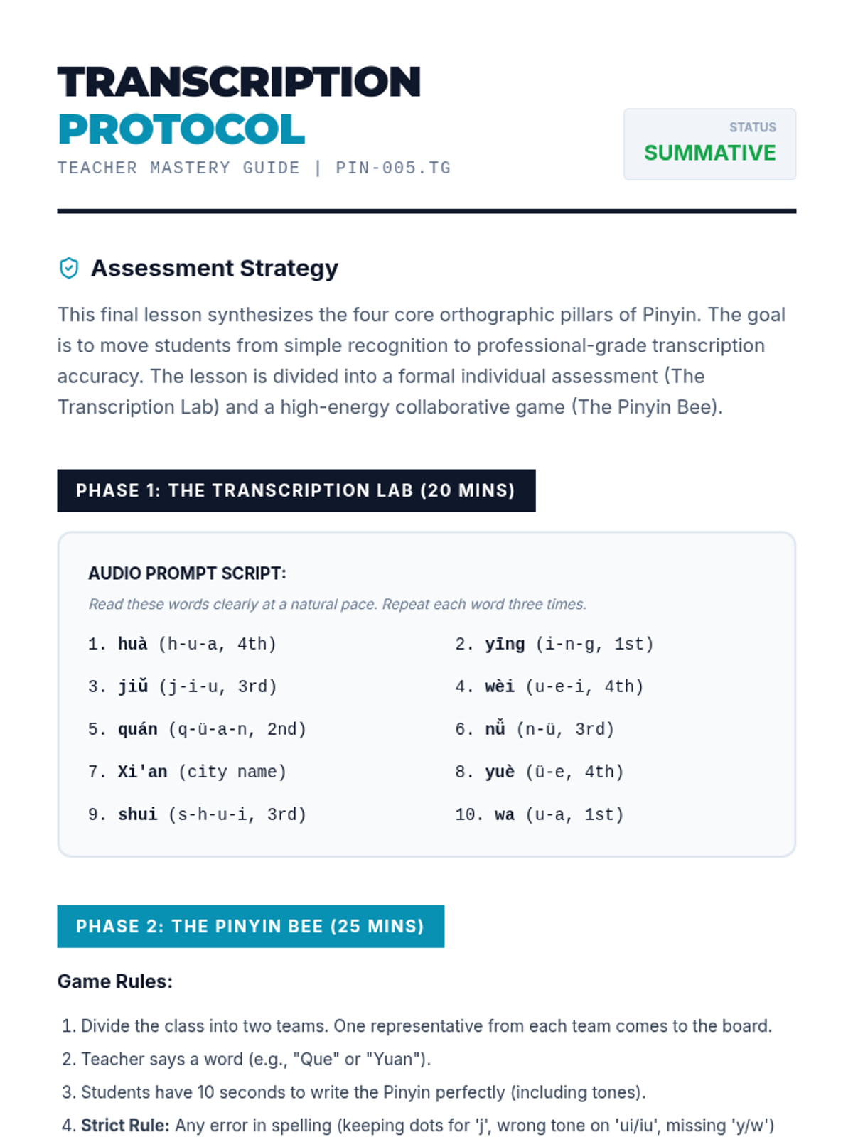A comprehensive unit for 11th-grade Mandarin learners focusing on the technical orthography of Pinyin. Students master tone mark placement, zero-initial transformations (y/w), the j/q/x/ü umlaut rule, and syllable segmentation using apostrophes.