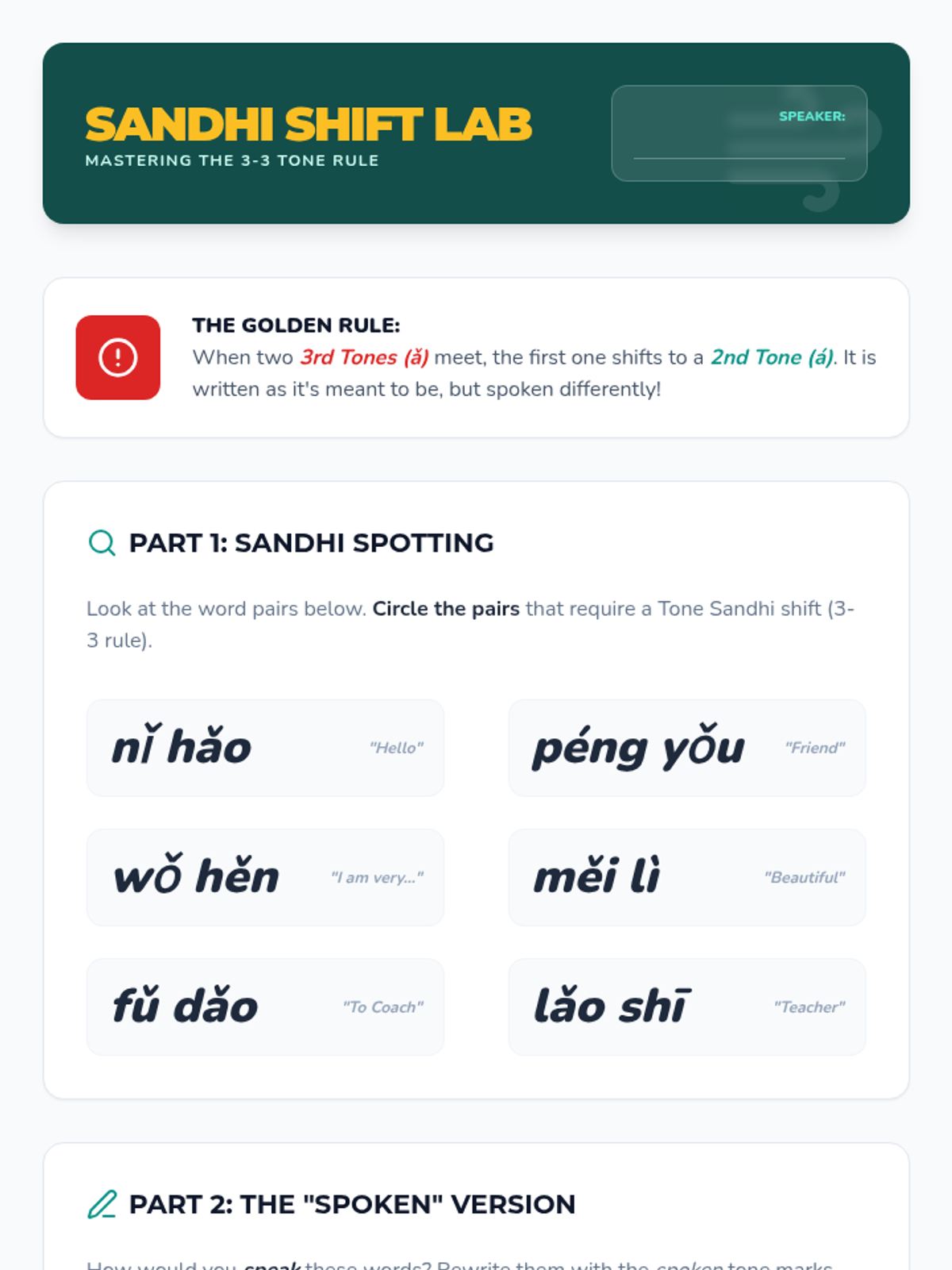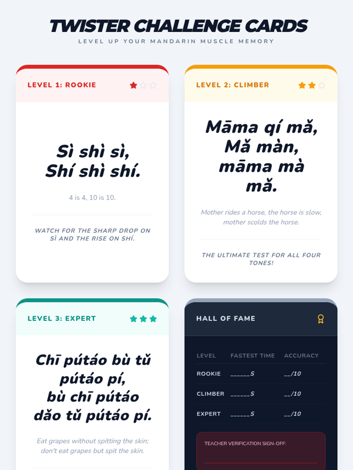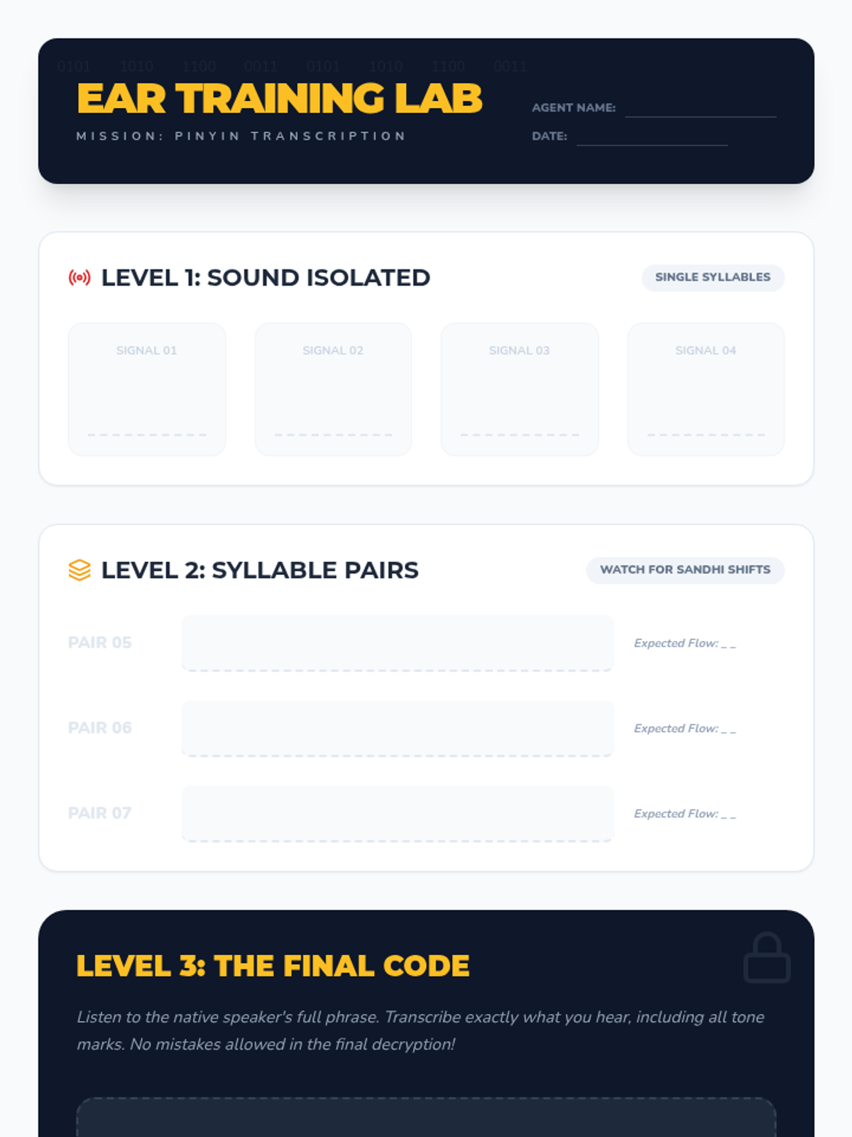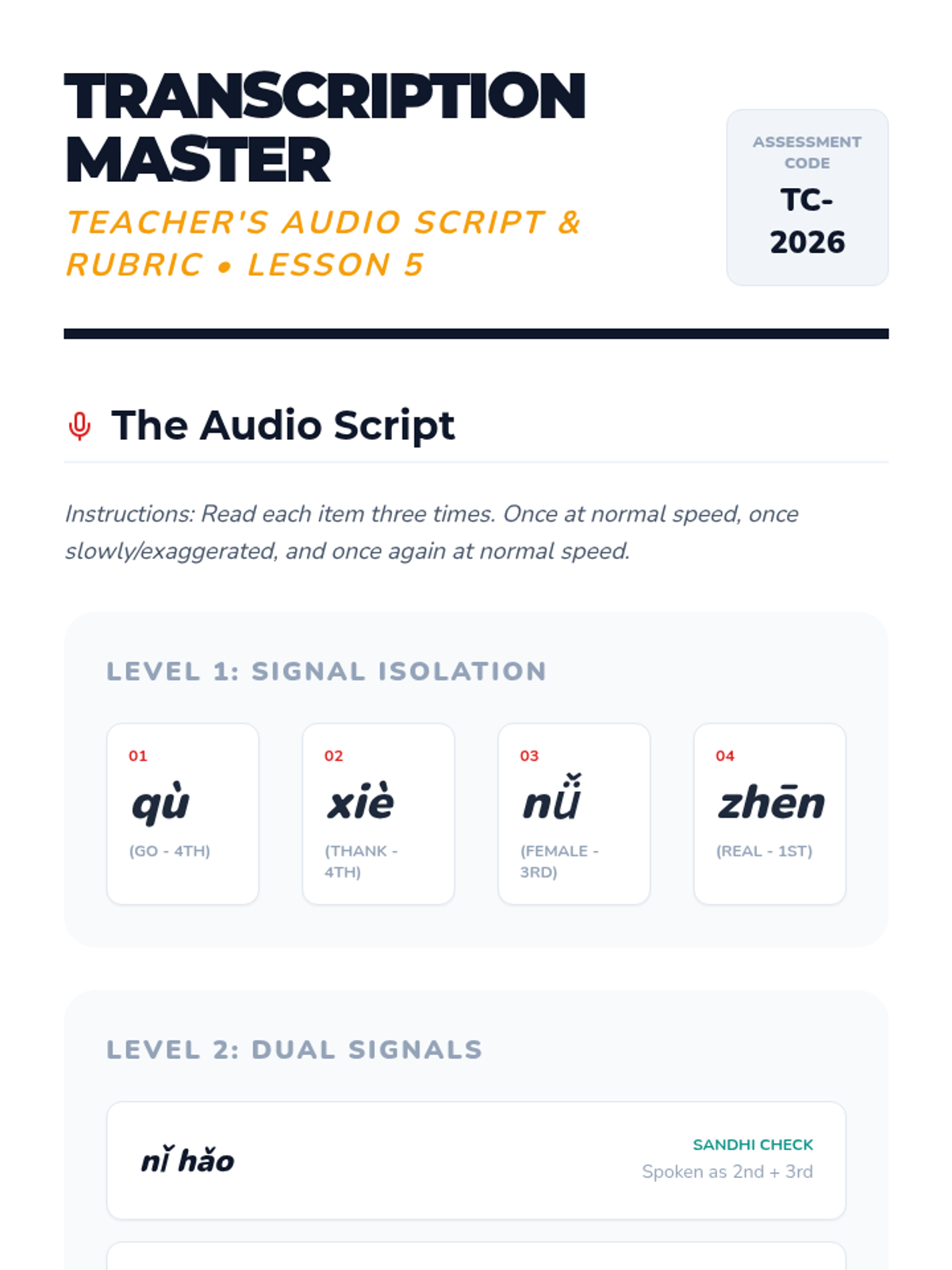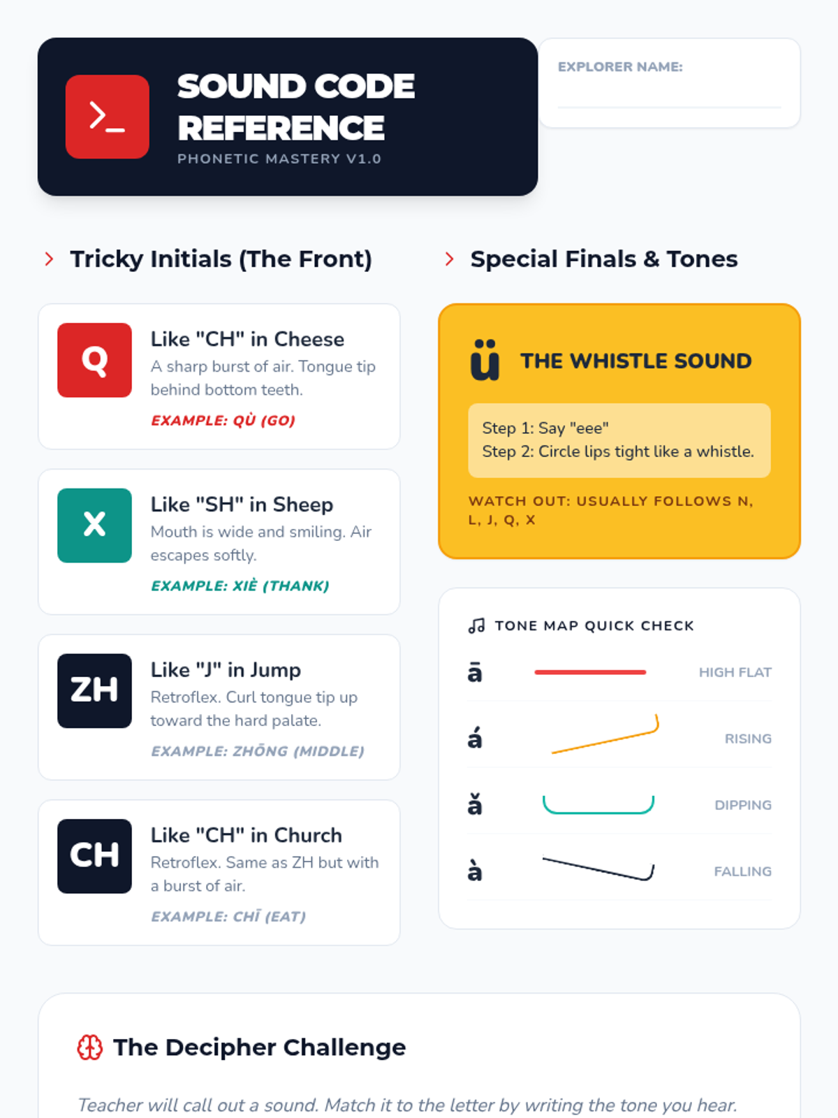 A comprehensive introduction to Mandarin Chinese phonetics for 6th-grade students, focusing on the four tones, the Pinyin romanization system, and the rhythmic rules of spoken Mandarin. Students progress from basic pitch awareness to complex phonetic combinations and listening transcription.