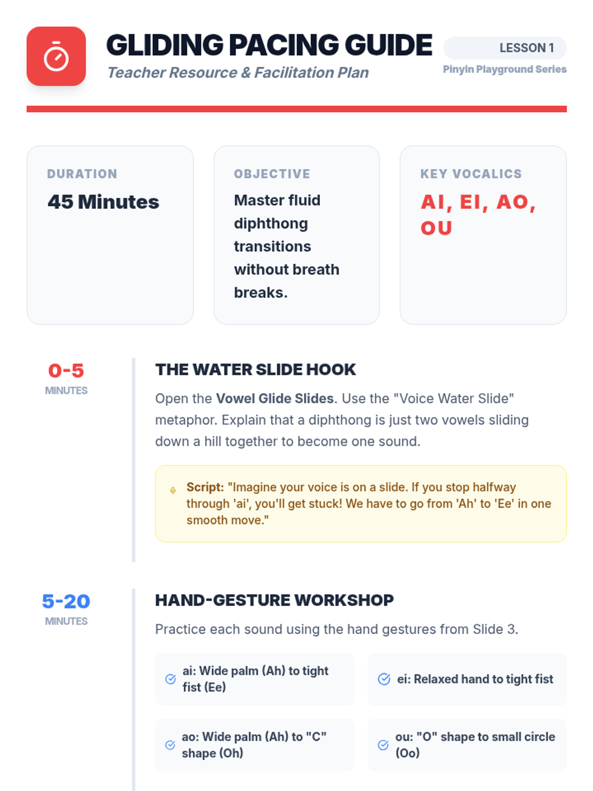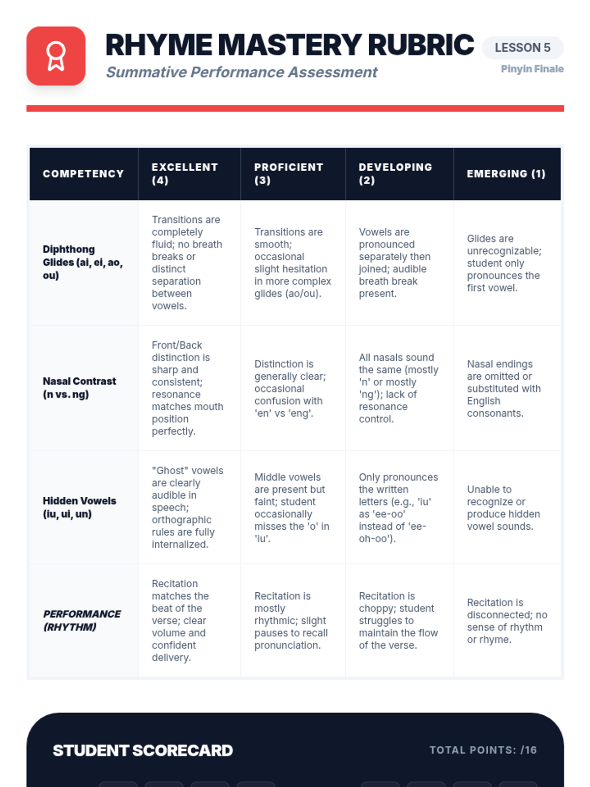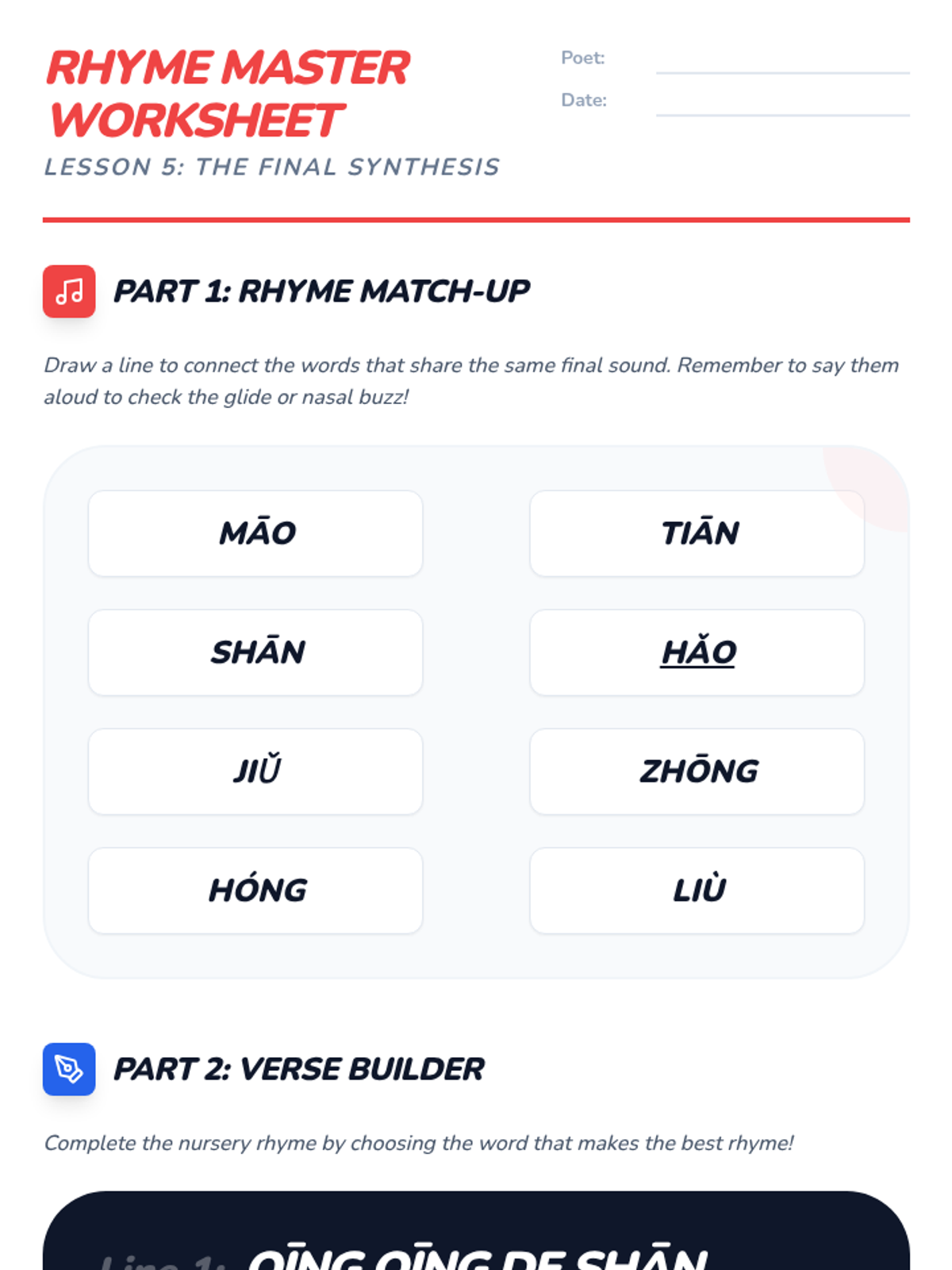 A 5th-grade Mandarin Pinyin sequence focusing on the pronunciation of compound finals and nasal endings through playful, rhythmic practice. Students will master diphthongs, front and back nasals, and the orthographic rules of hidden vowels to improve their articulation and rhyming skills.