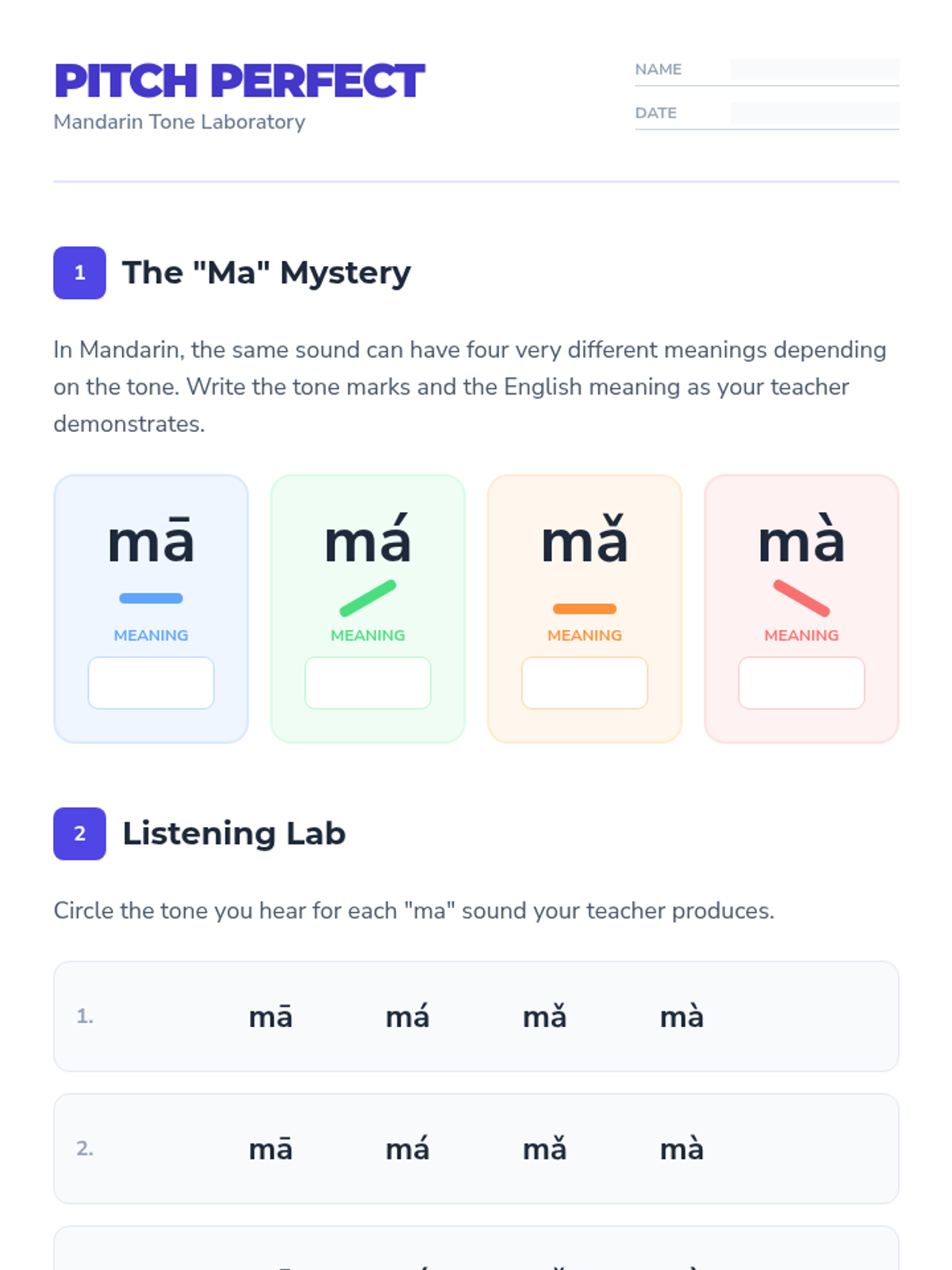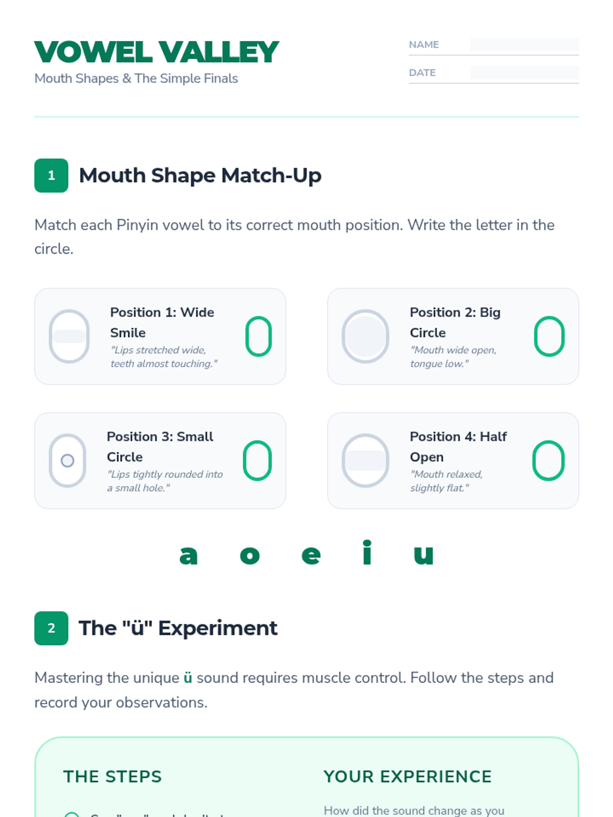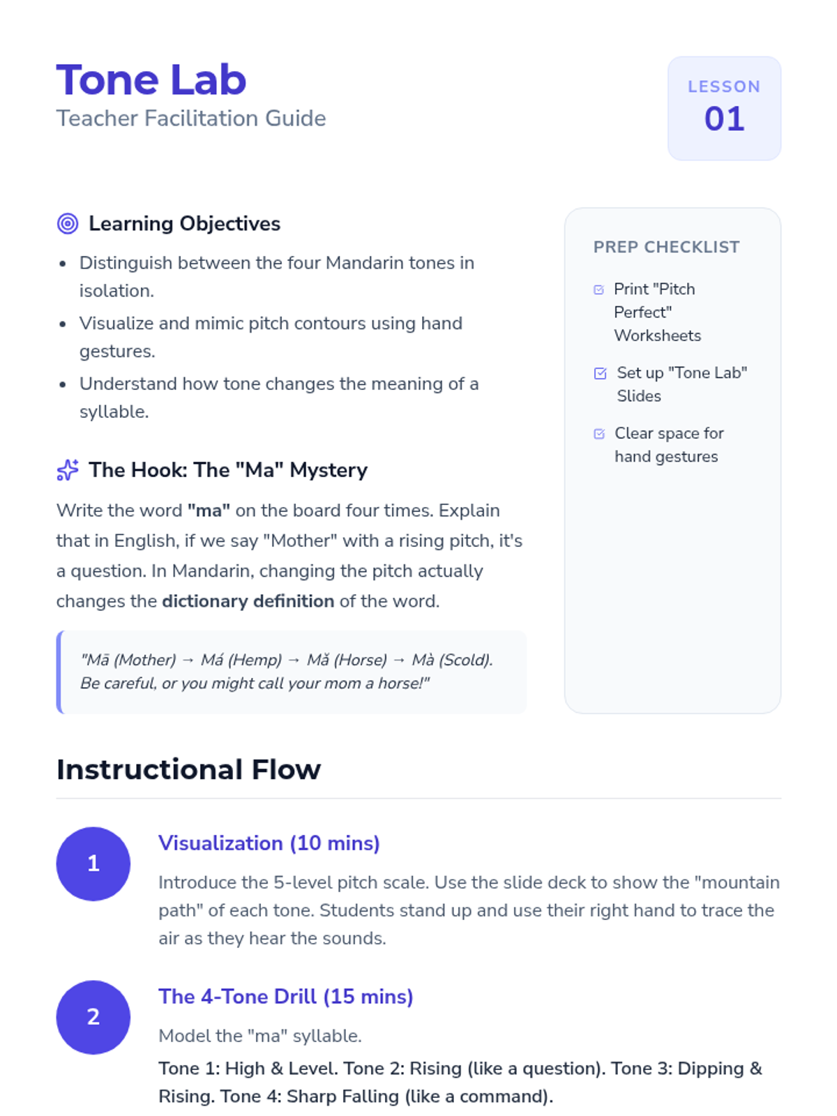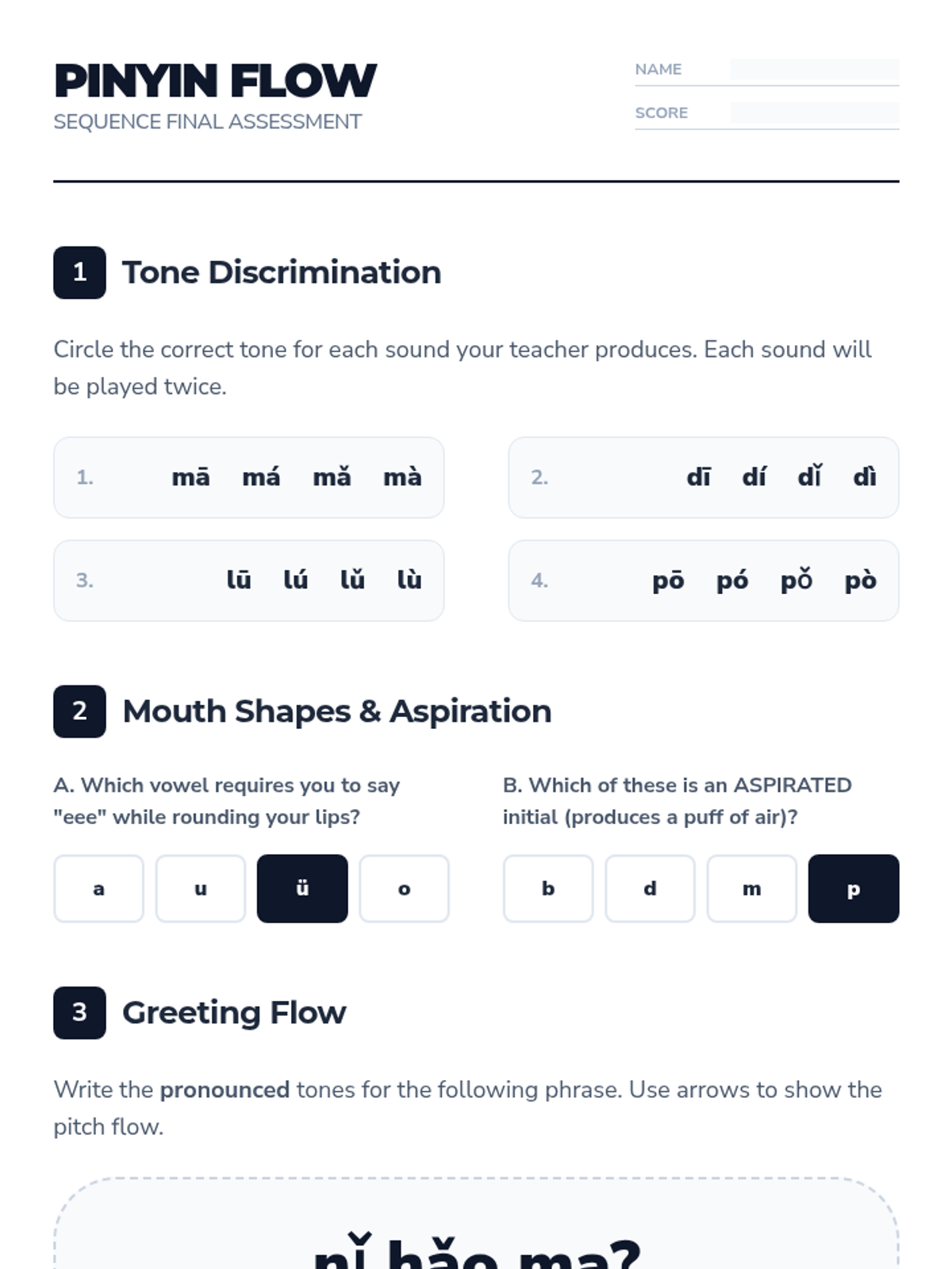 This sequence introduces 8th-grade students to the fundamental sounds of Mandarin Chinese, focusing on the four tones, six simple vowels, and initial consonants. Students move from basic pitch recognition to combining sounds into meaningful greetings and sentences.