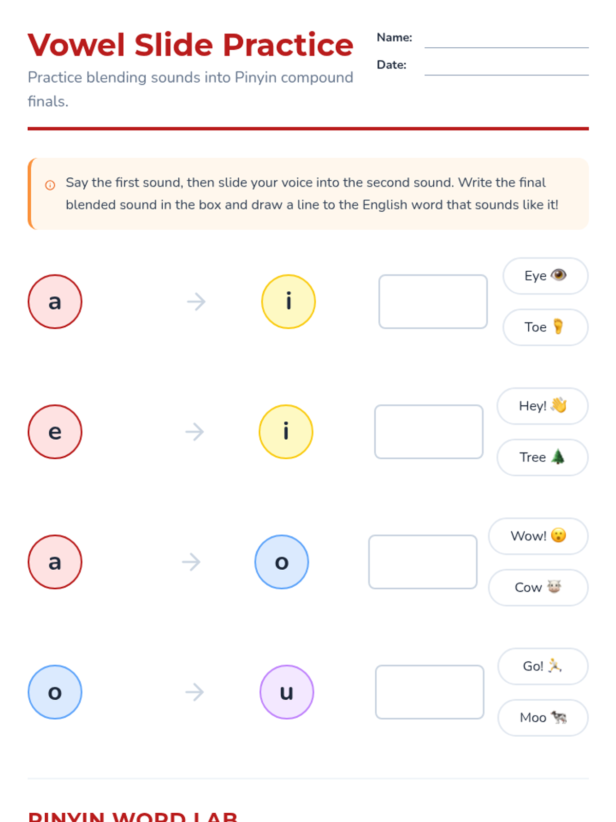 A 2nd-grade sequence focusing on Mandarin Chinese Pinyin compound finals and nasal endings. Students learn to blend vowel sounds, distinguish between front and back nasal endings, and create rhythmic chants to internalize Chinese phonological patterns.
